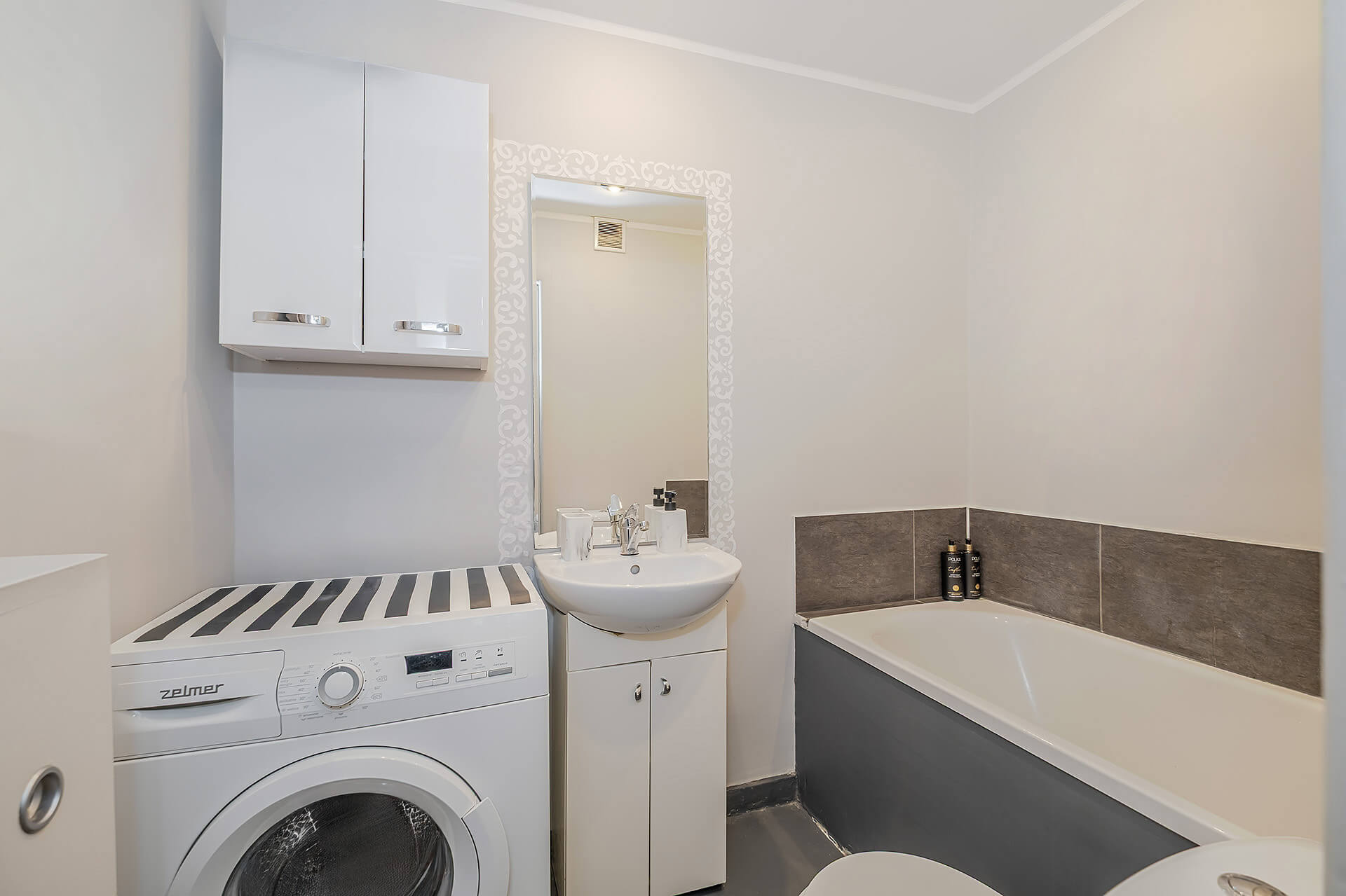 – łazienka z WC, wanną , pralką, umywalką, lustrem