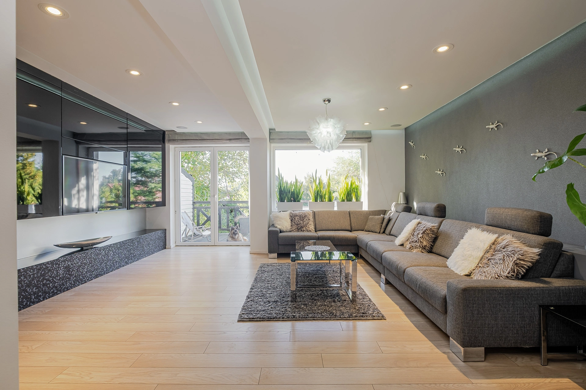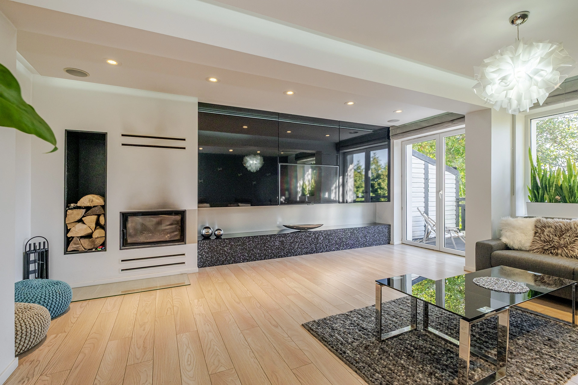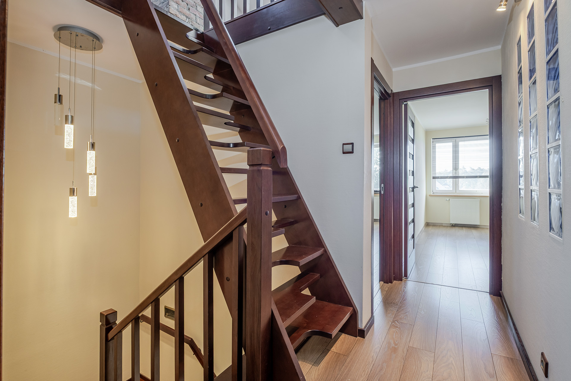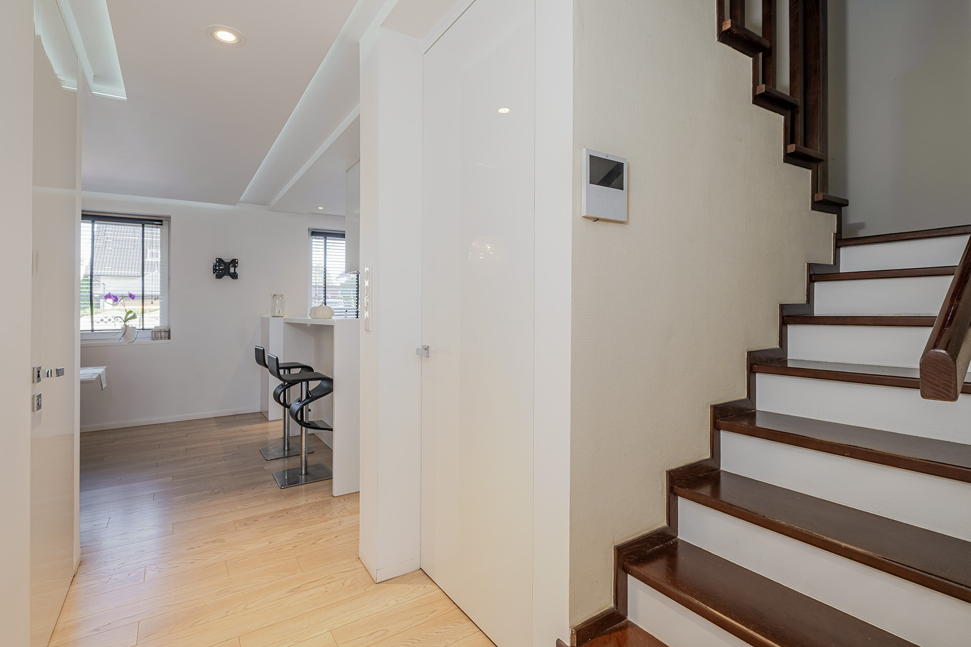 -Stylowe bezprzylgowe drzwi oraz solidne bukowe schody, które nadają wnętrzu elegancji.