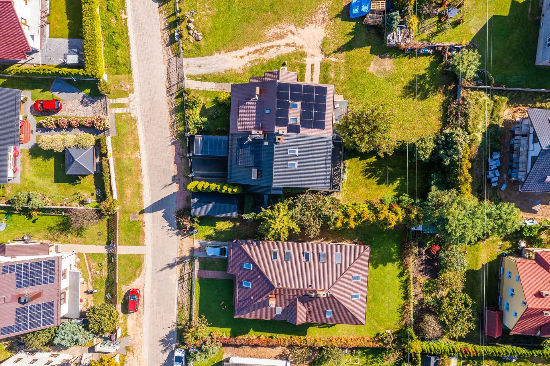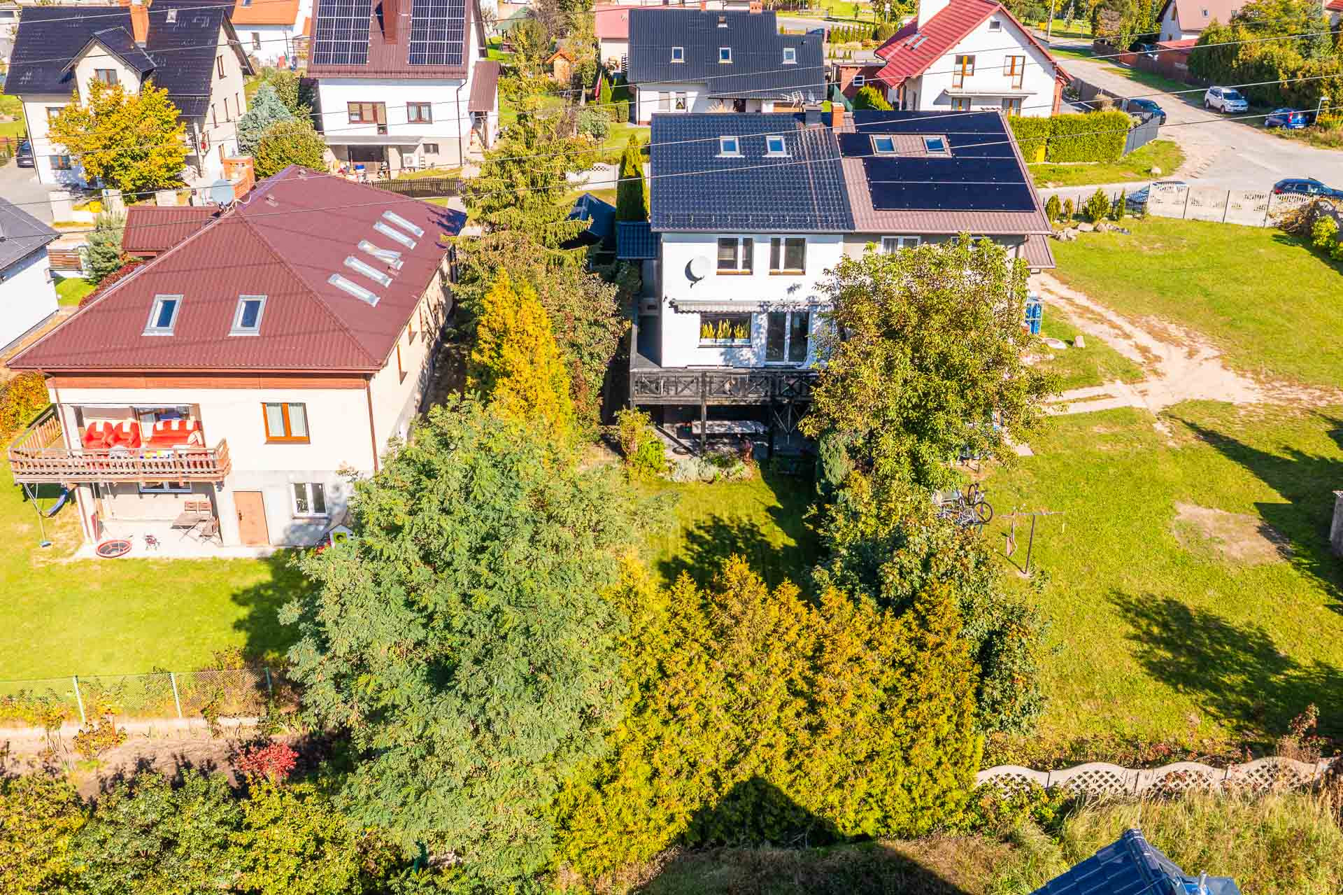 Dom usytuowany jest na prostokątnej działce o powierzchni 488 m², w pełni ogrodzonej. Od frontu posesję zdobi kuta, automatyczna brama wjazdowa, natomiast boki zabezpieczono ogrodzeniem z siatki. Ogród z ekspozycją południową jest jasny i słoneczny, a liczne nasadzenia – w tym drzewa owocowe i tuje – zapewniają kameralną atmosferę oraz poczucie prywatności. Na terenie działki znajduje się także przestronny, wolnostojący garaż z automatyczną bramą. Do posesji doprowadzone zostały wszystkie media: woda, kanalizacja i prąd. Gaz znajduje się w granicy działki, z możliwością łatwego podłączenia.