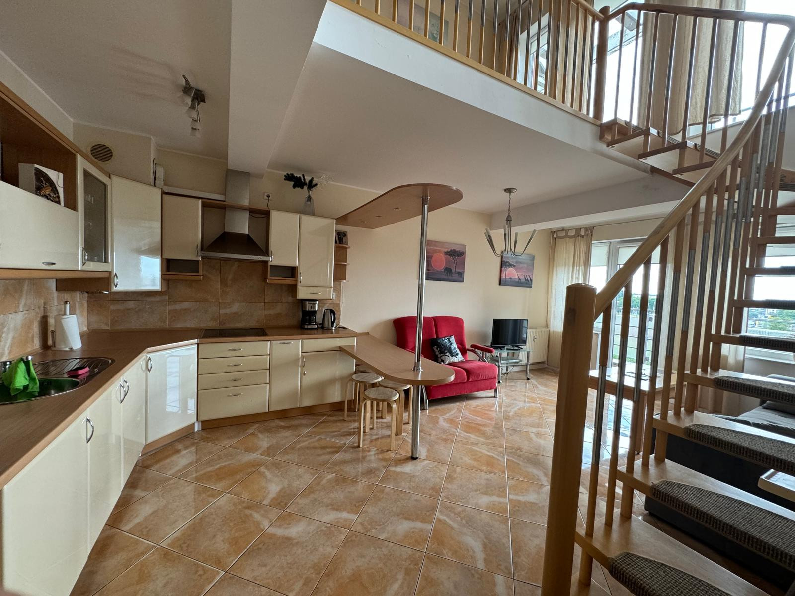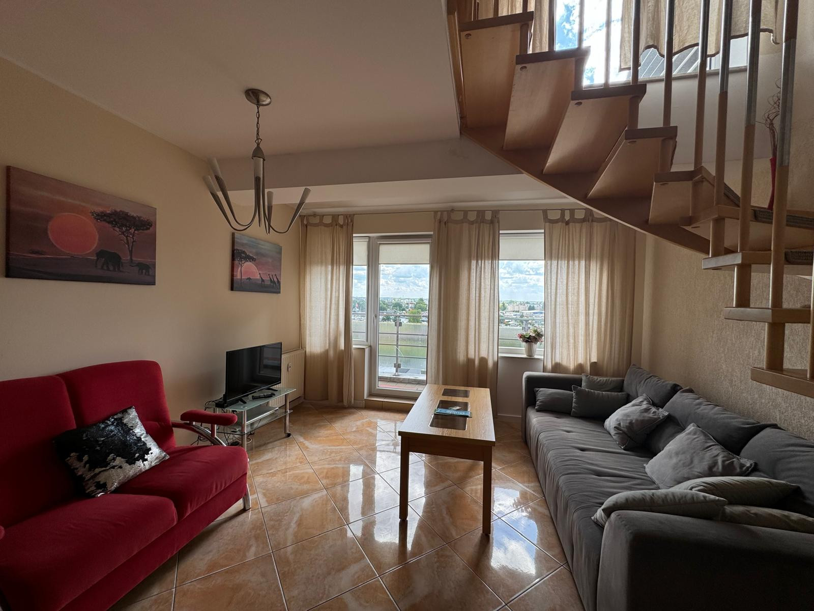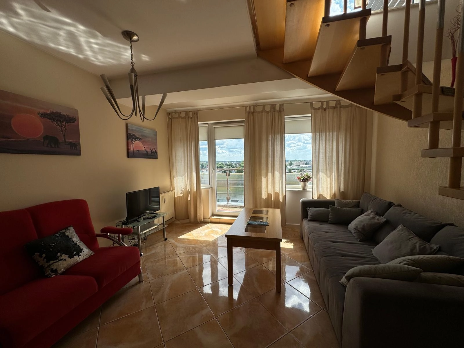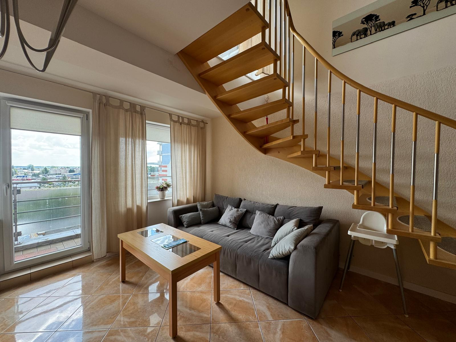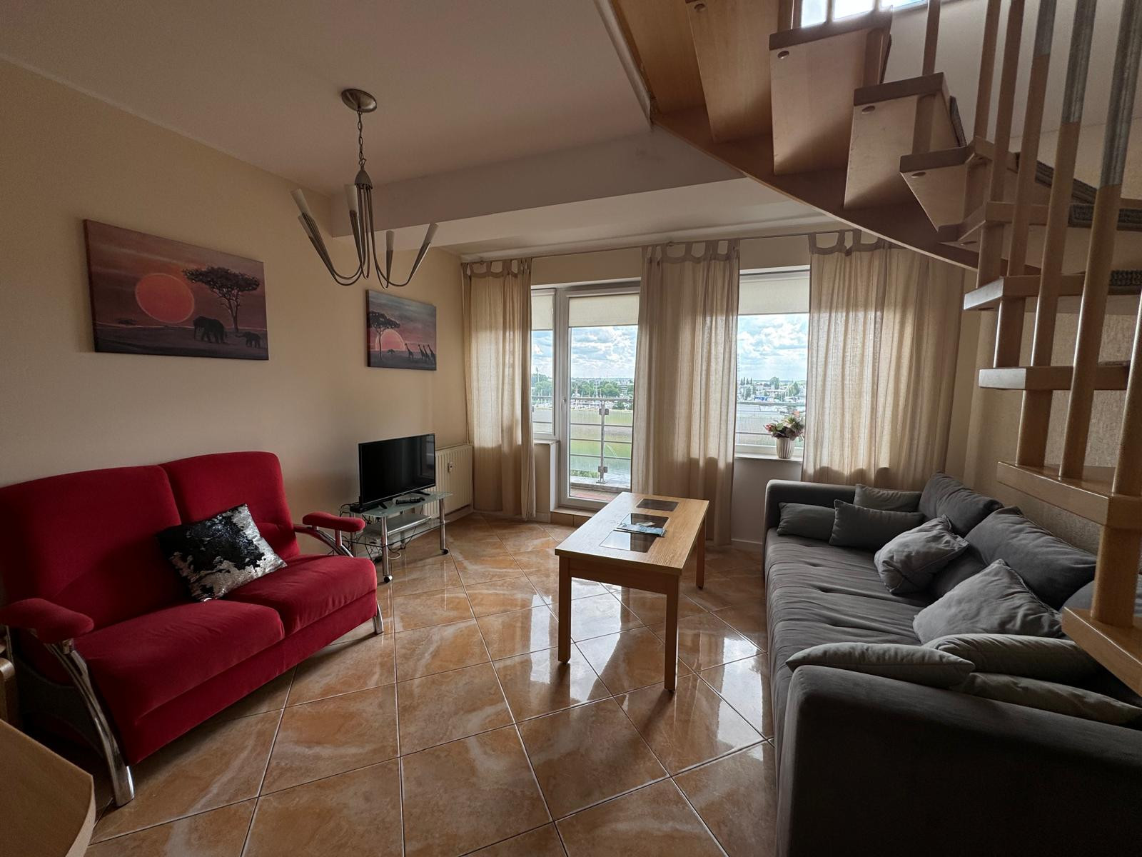 – sypialnia z częścią dzienną o pow. ok. 28 m2 (z wyjściem na duży taras od południowego zachodu – widok na rzekę Parsętę, Port Jachtowy i panoramę miasta).