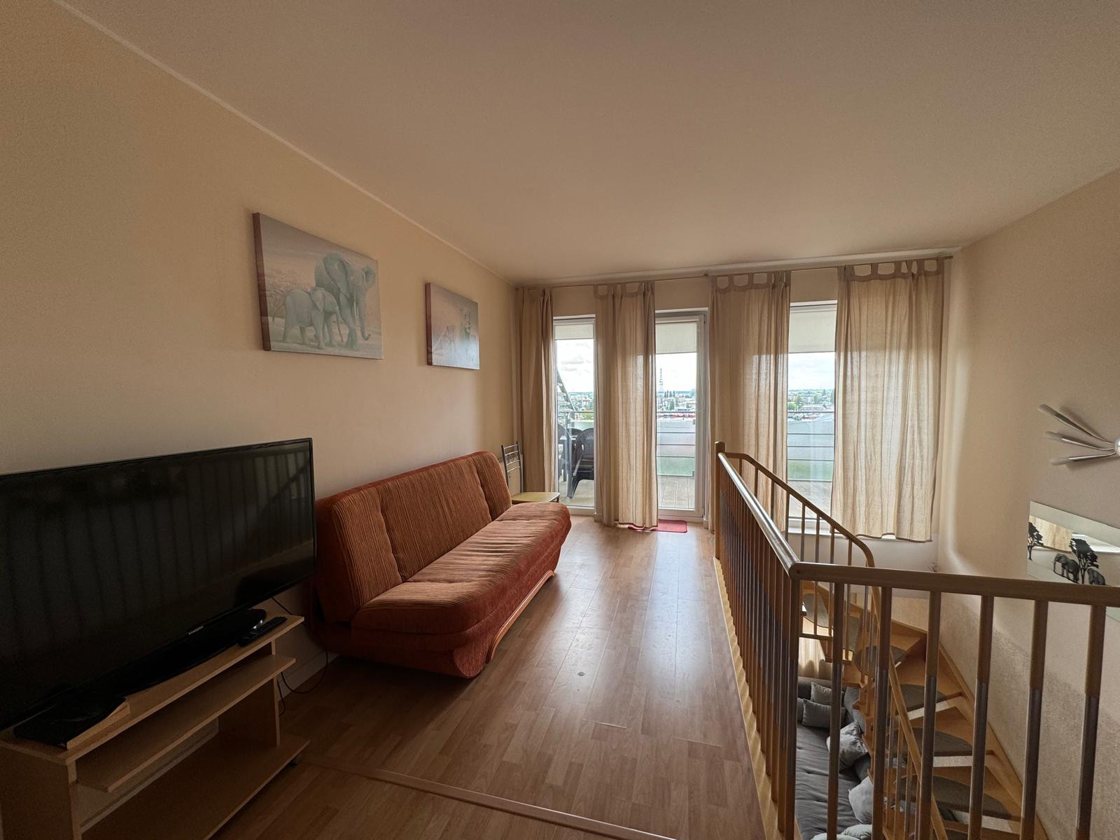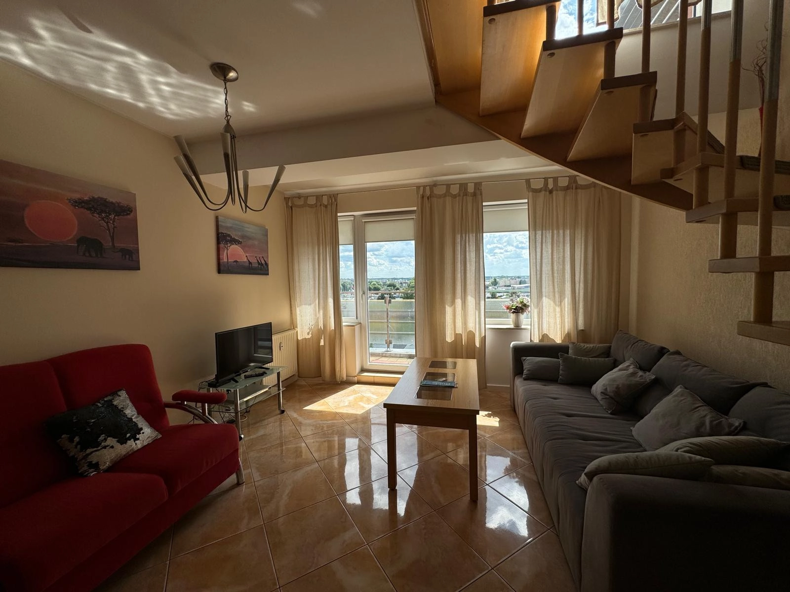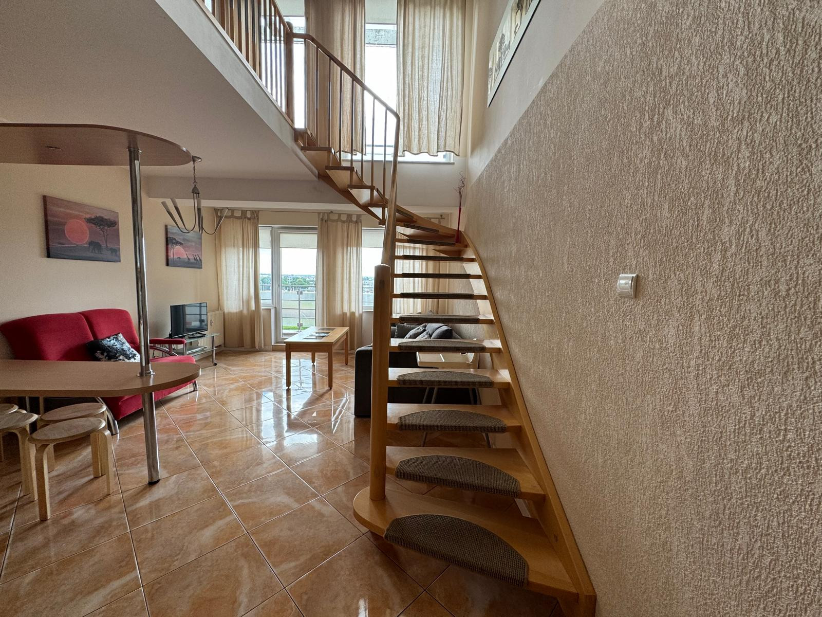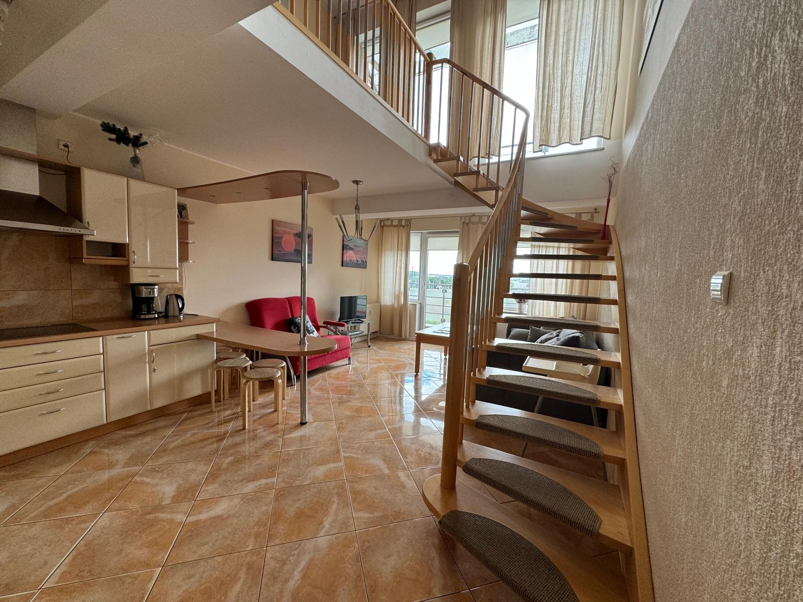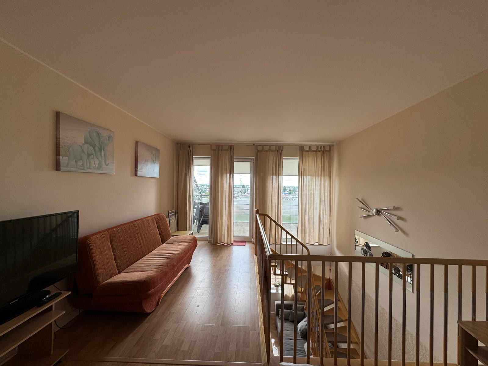 – sypialnia z częścią dzienną o pow. ok. 28 m2 (z wyjściem na duży taras od południowego zachodu – widok na rzekę Parsętę, Port Jachtowy i panoramę miasta).