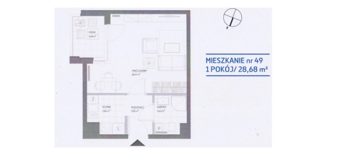 – pokój dzienny 18,44m2 z wyjściem na loggie 3,48m2