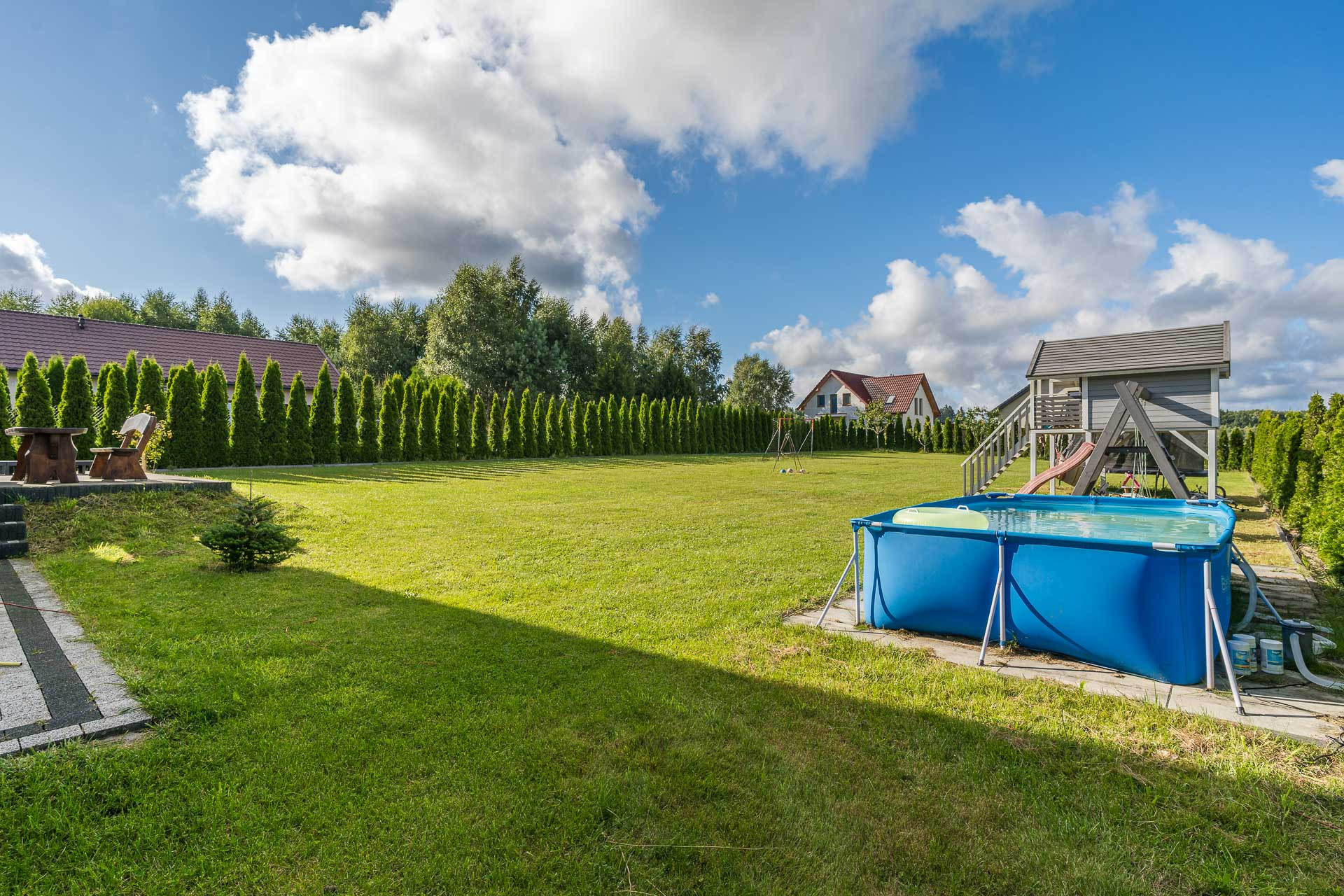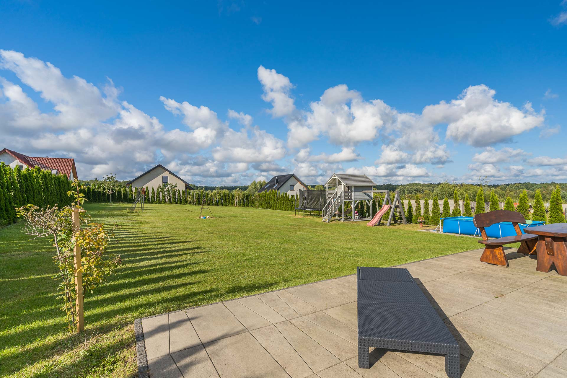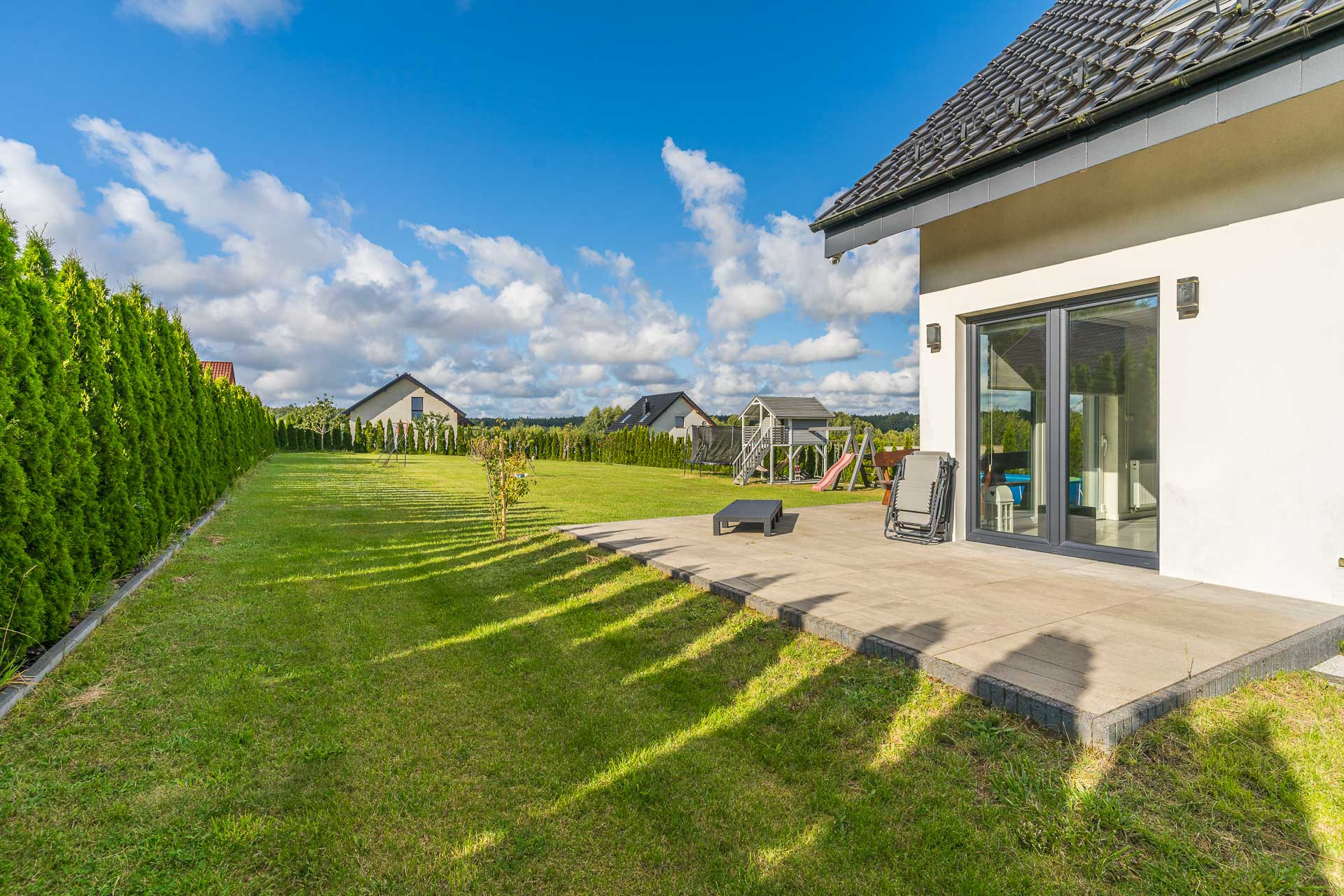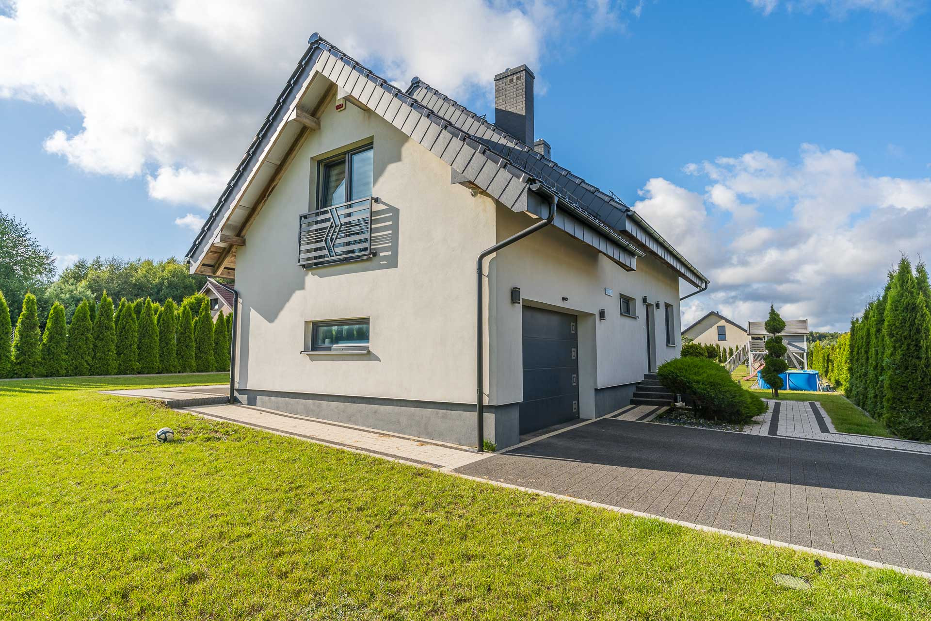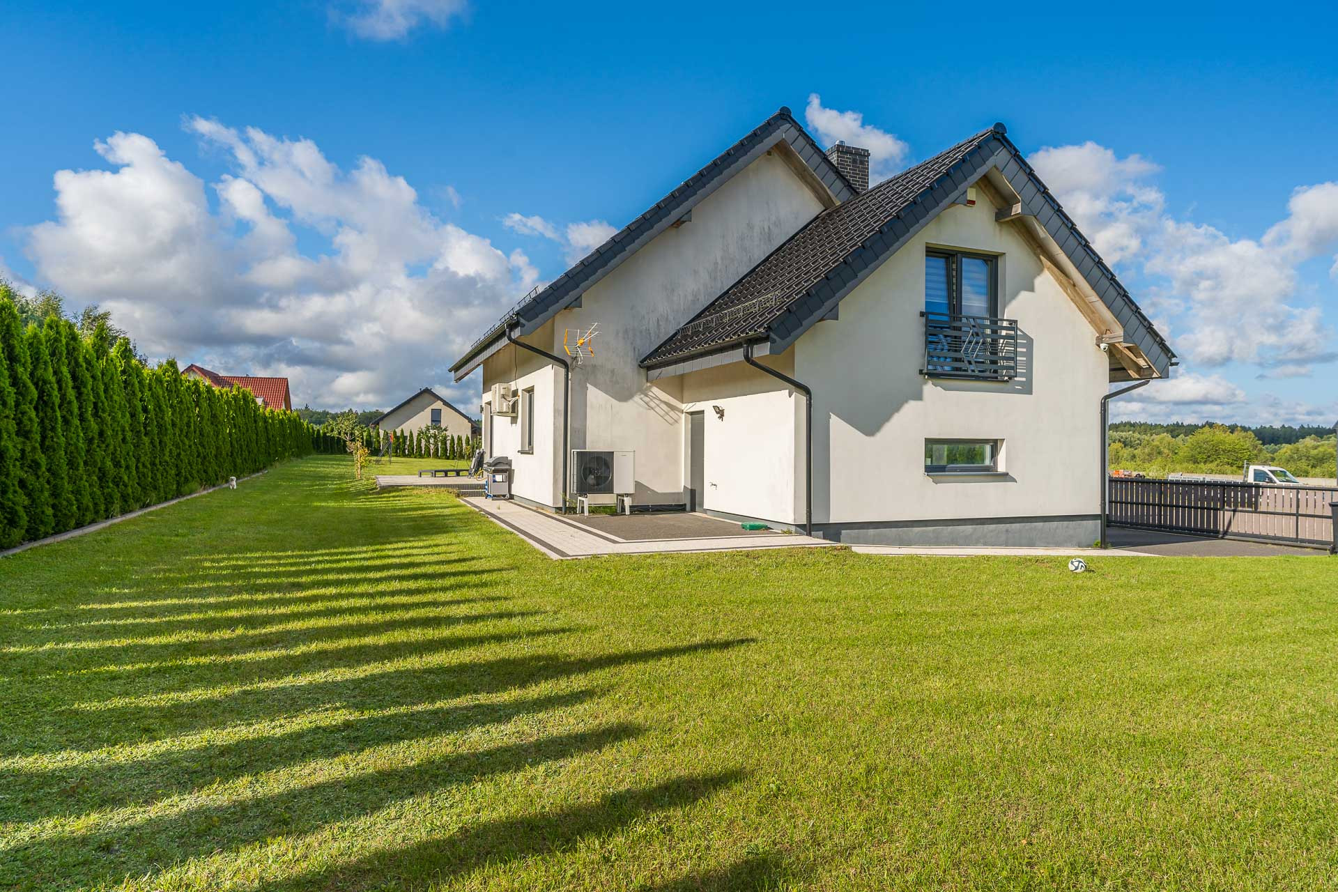 Bardzo ładny i funkcjonalnie wykończony dom wolnostojący parterowy z poddaszem mieszkalnym. Budynek został odebrany w 2015 roku, otoczony jest pięknie utrzymanym ogrodem, który obejmuje dwie działki o łącznej powierzchni 2.009 m². Ogród zagospodarowany, ale z dużymi przestrzeniami do wypoczynku i w całości ogrodzony. Dojazd na posesję poprzez automatyczną bramę wjazdową. Podjazd do garażu wyłożony kostką brukową. Zasilanie w energię poprzez instalację fotowoltaiczną o mocy 11kW, a ogrzewanie poprzez pompę ciepła (podłogówka na całym parterze i w łazience na górze), co daje wymierne korzyści przy kosztach utrzymania nieruchomości.