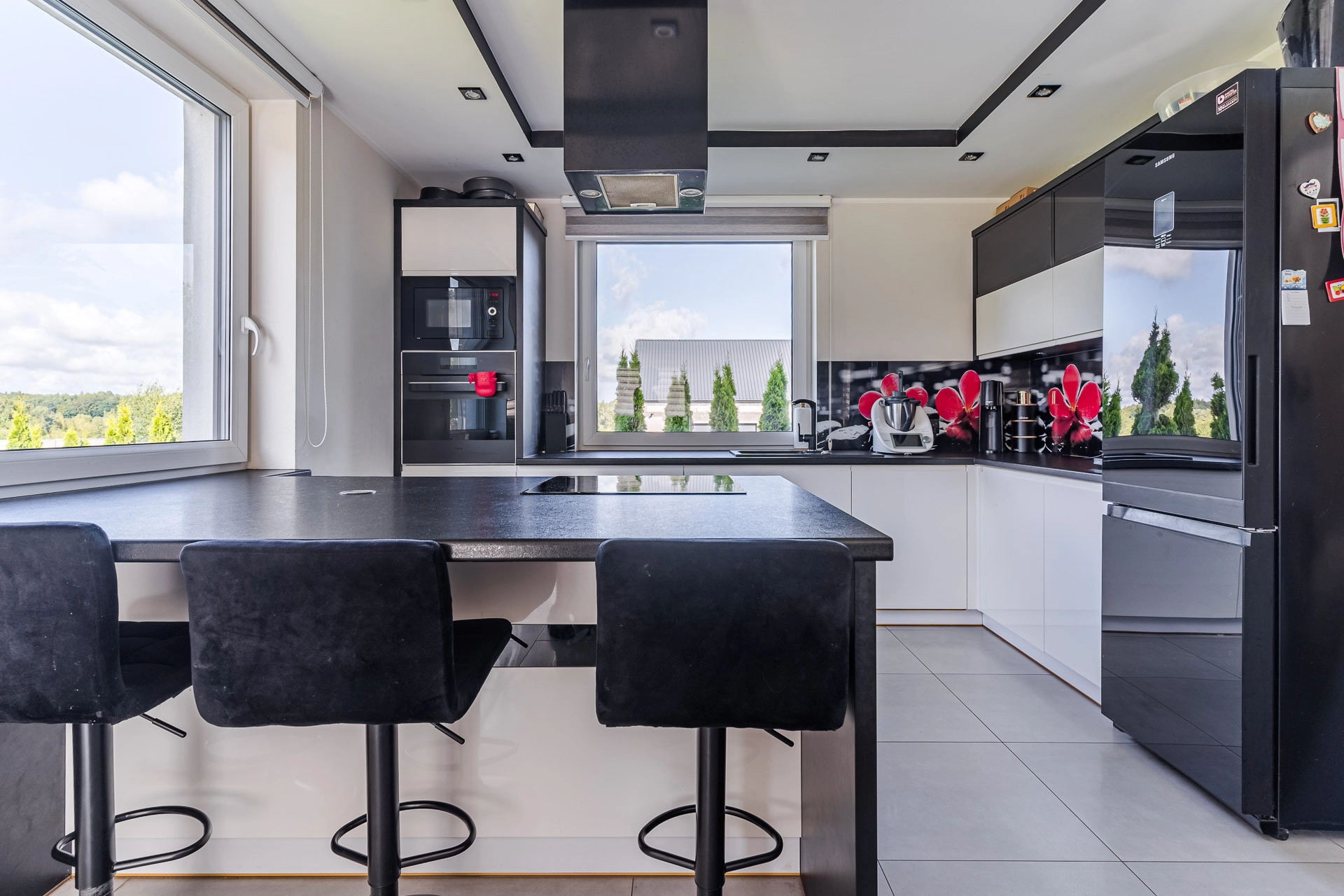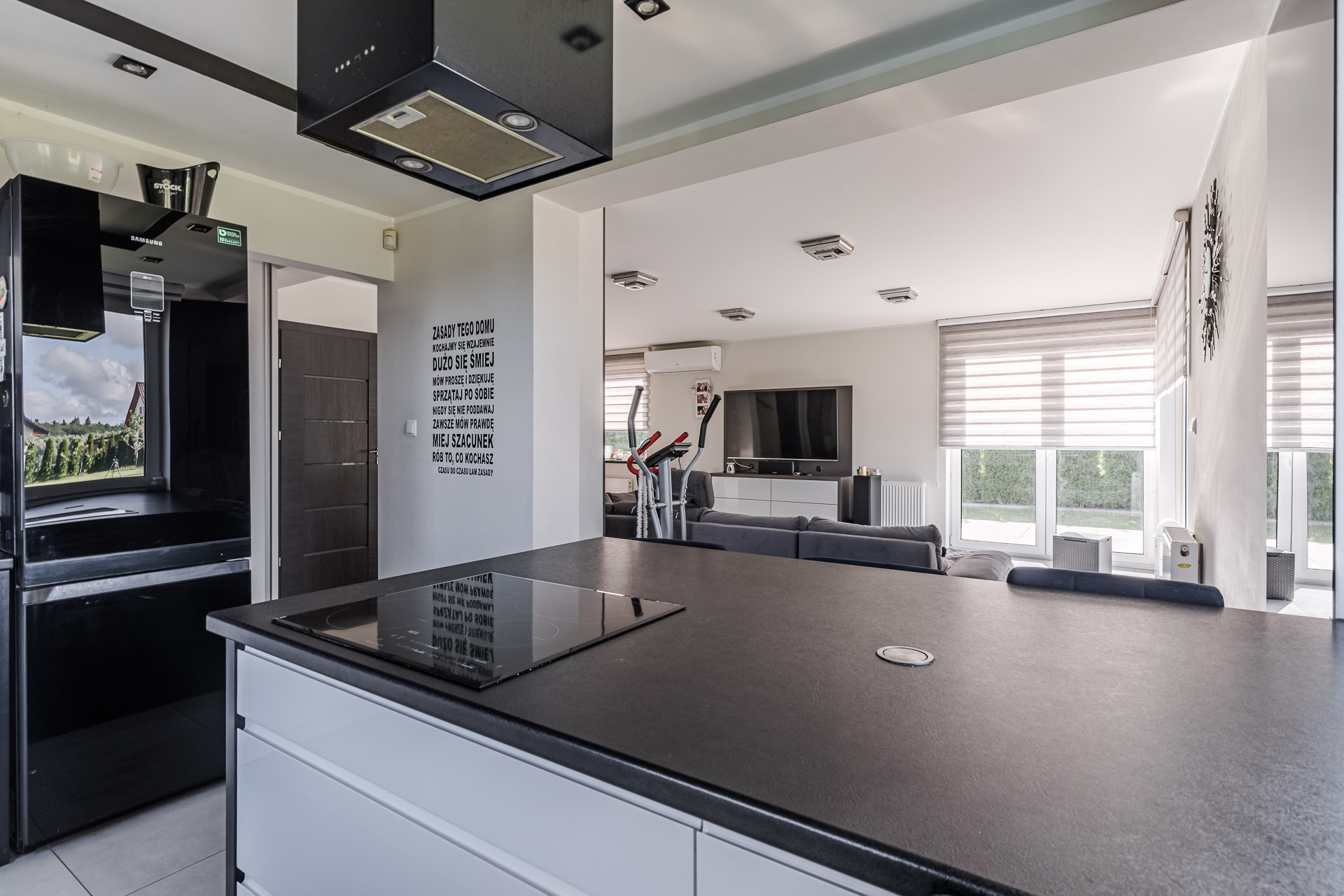– kuchnia o pow. ok. 11 m2 z wyspą kuchenną, która ma również część do spożywania posiłków; kuchnia w pełni umeblowana wg indywidualnego projektu i wyposażona w sprzęt AGD,