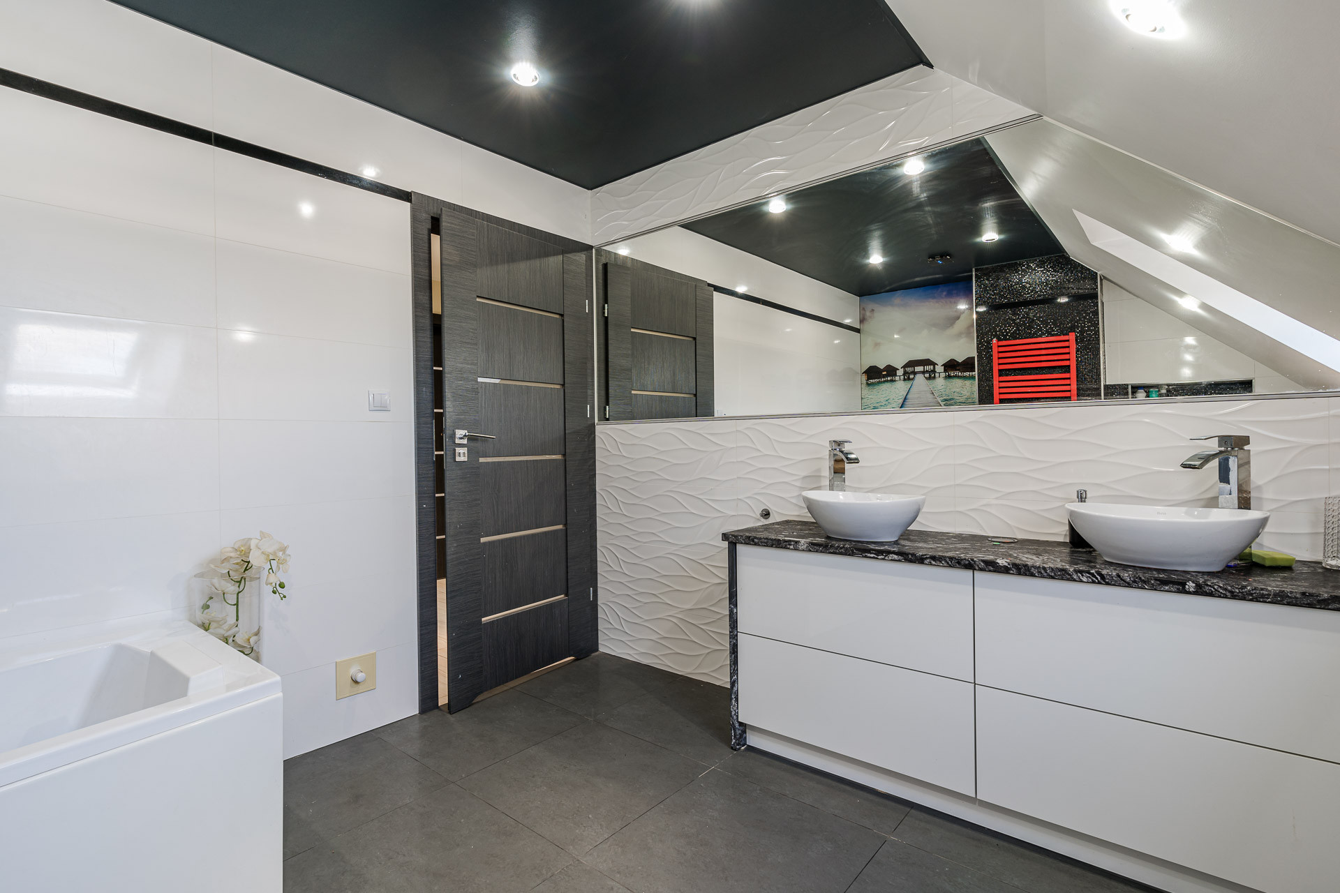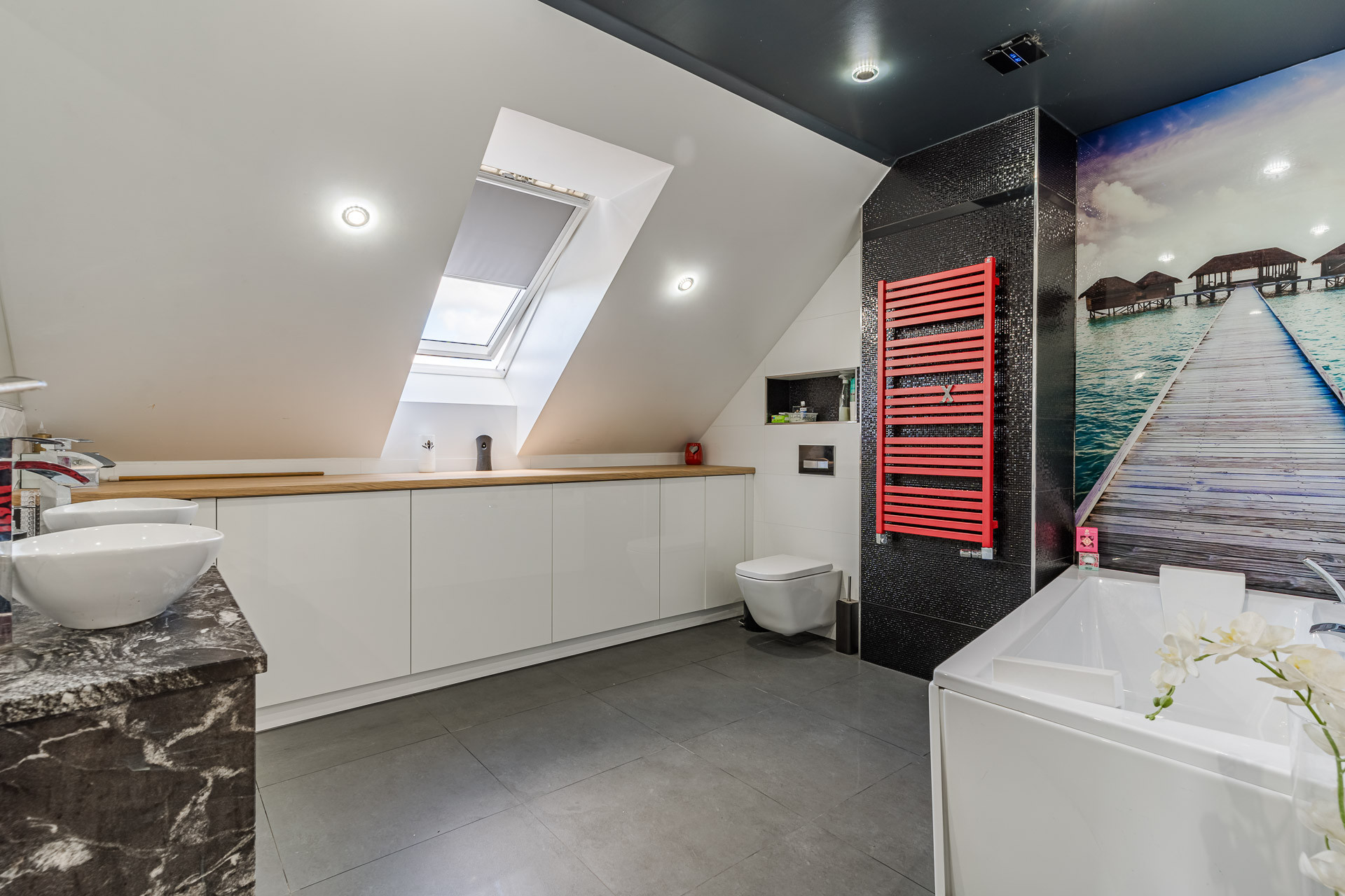 – łazienka o pow. ok. 8,5 m2 (z wanną, dwiema umywalkami i oknem),
