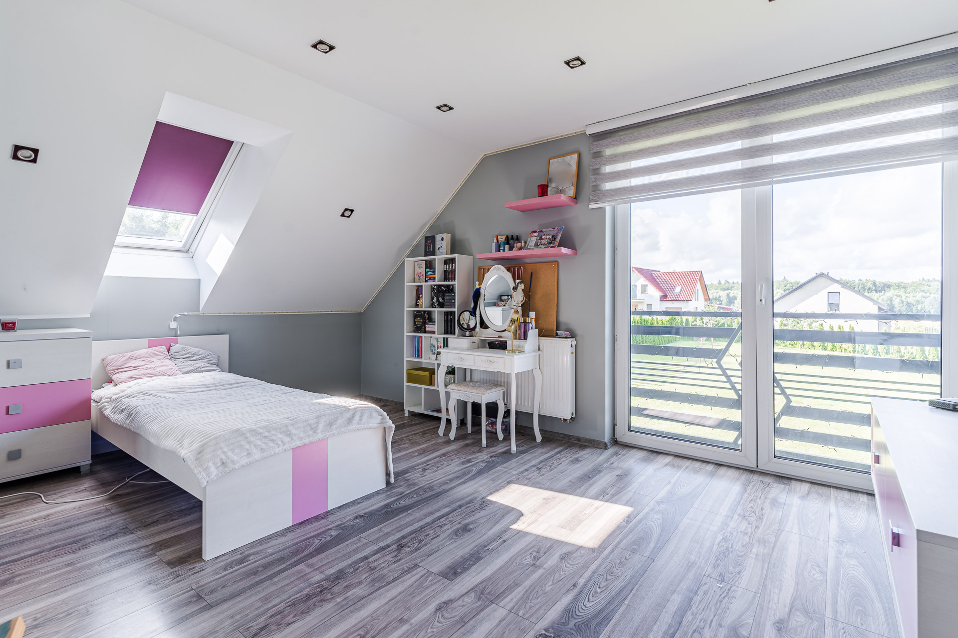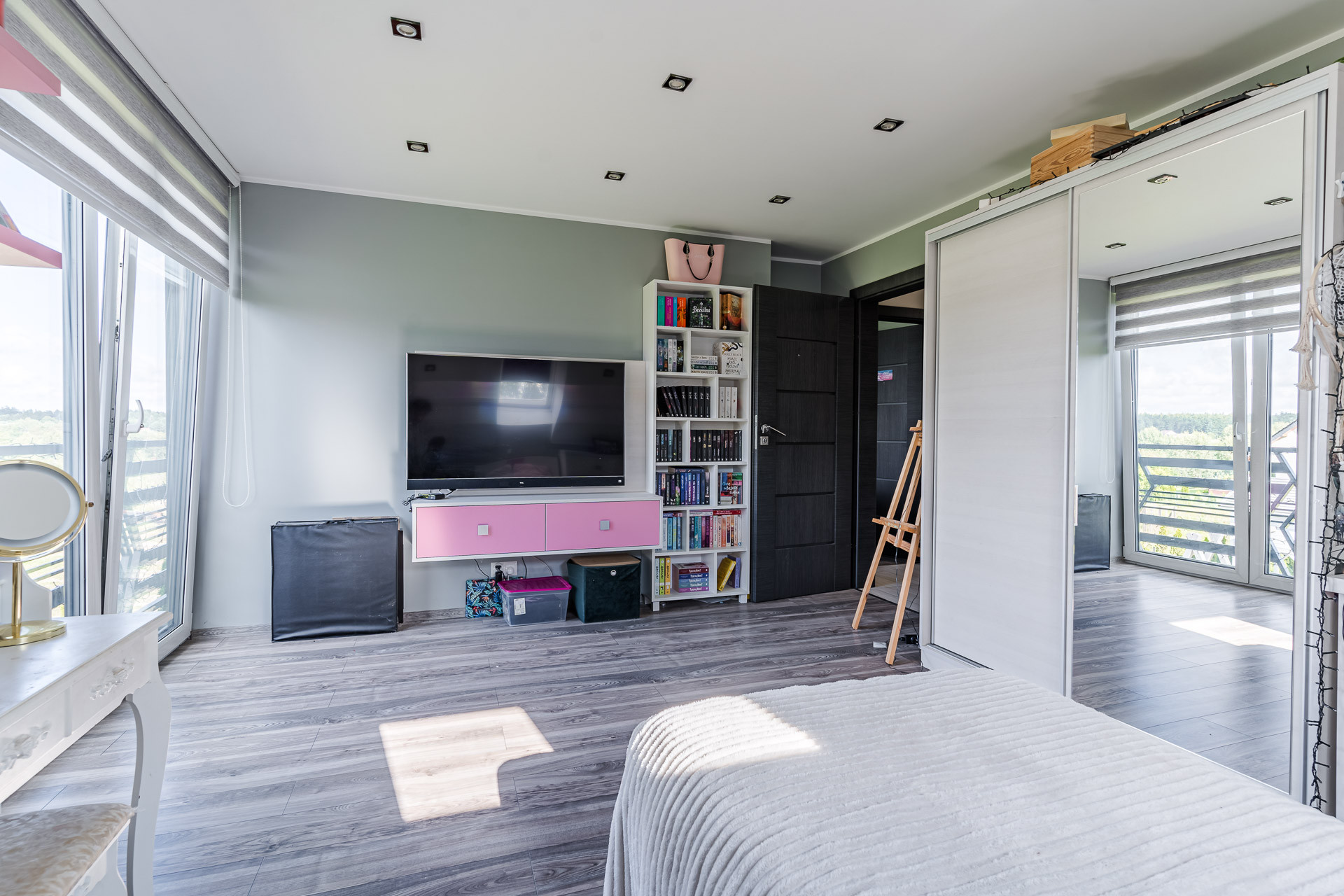 – 4 pokoje/sypialnie o powierzchniach odpowiednio ok. 14 m2, 12 m2, 14 m2, 9 m2 (po podłodze większe powierzchnie), w trzech pokojach duże balkonowe okna,