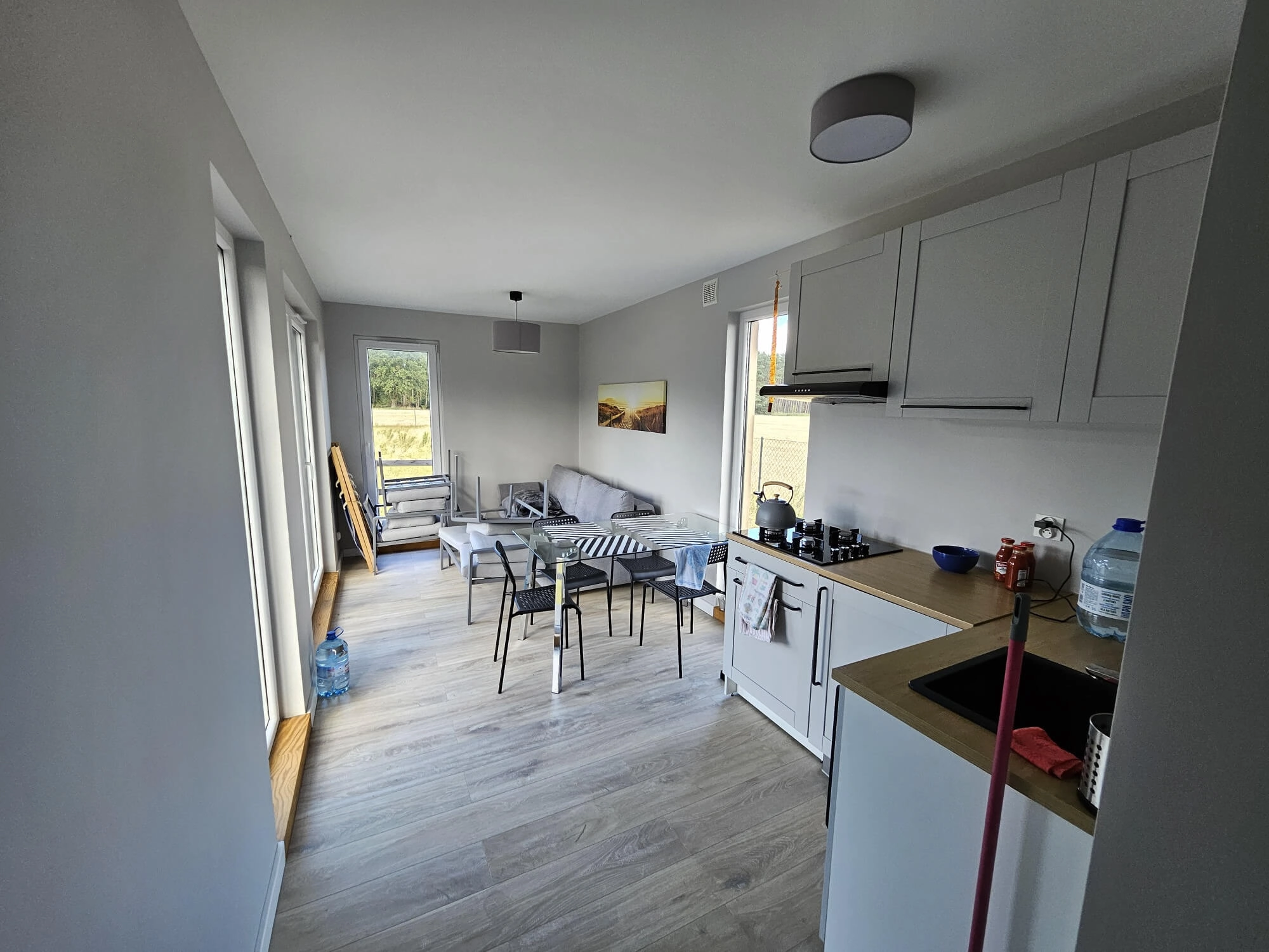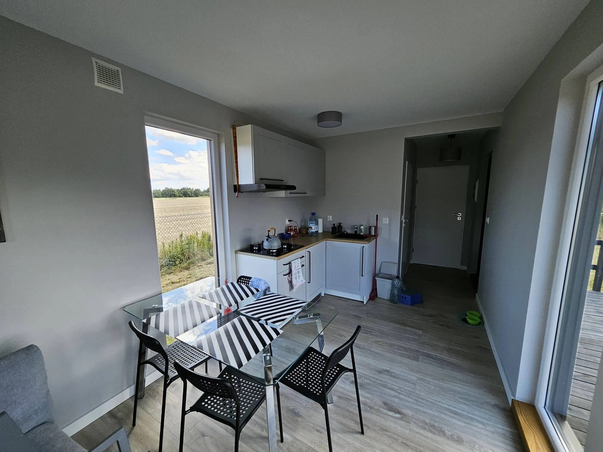 Pokoje wyposażone odpowiednio w meble sypialniane oraz salonowe. Kuchnia i łazienka z zabudową i wyposażeniem (WC, kabina prysznicowa, płyta gazowa, lodówka podblatowa). Domek posiada także własny zestaw fotowoltaiczny.