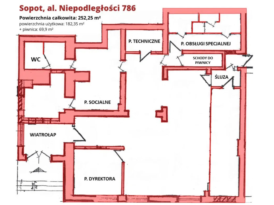 Główna przestrzeń handlowa o pow. 182,35 m² składa się z sześciu niezależnych pomieszczeń. Dodatkowo do lokalu przynależy piwnica o pow. 69,9 m². Łączna powierzchnia użytkowa to ponad 250 m².
