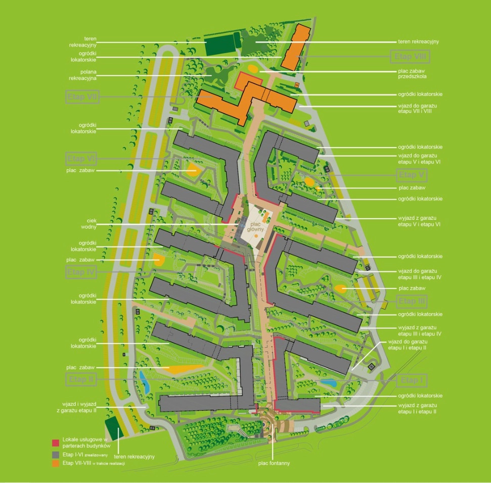 Osiedle z 2021r. złożone jest z 1200 mieszkań w niskiej zabudowie, lokale usługowo-handlowe, dziedzińce, place zabaw, zagospodarowane tereny zielone, miejsca postojowe.