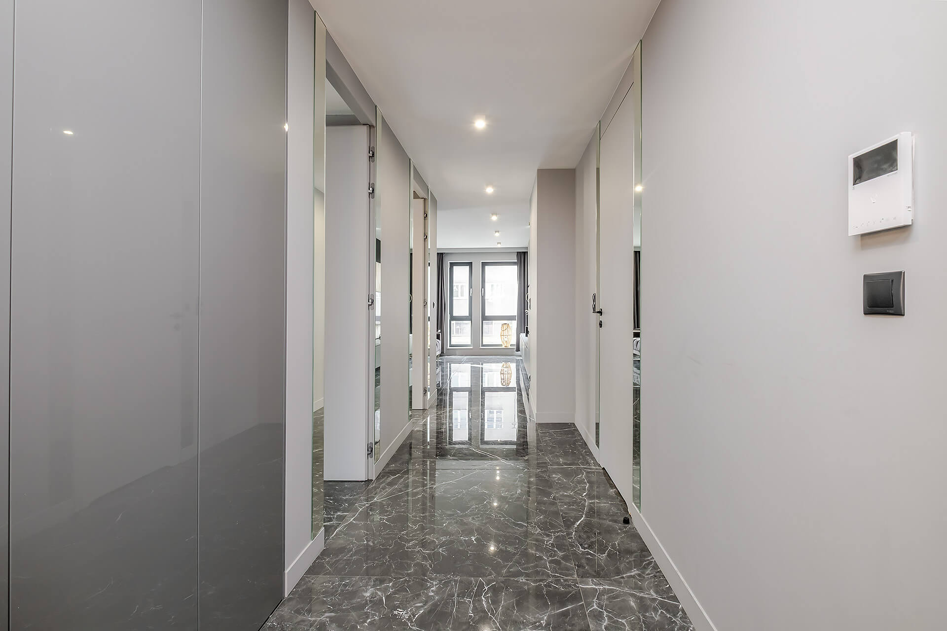 – funkcjonalny przedpokój z zabudową i lustrami.