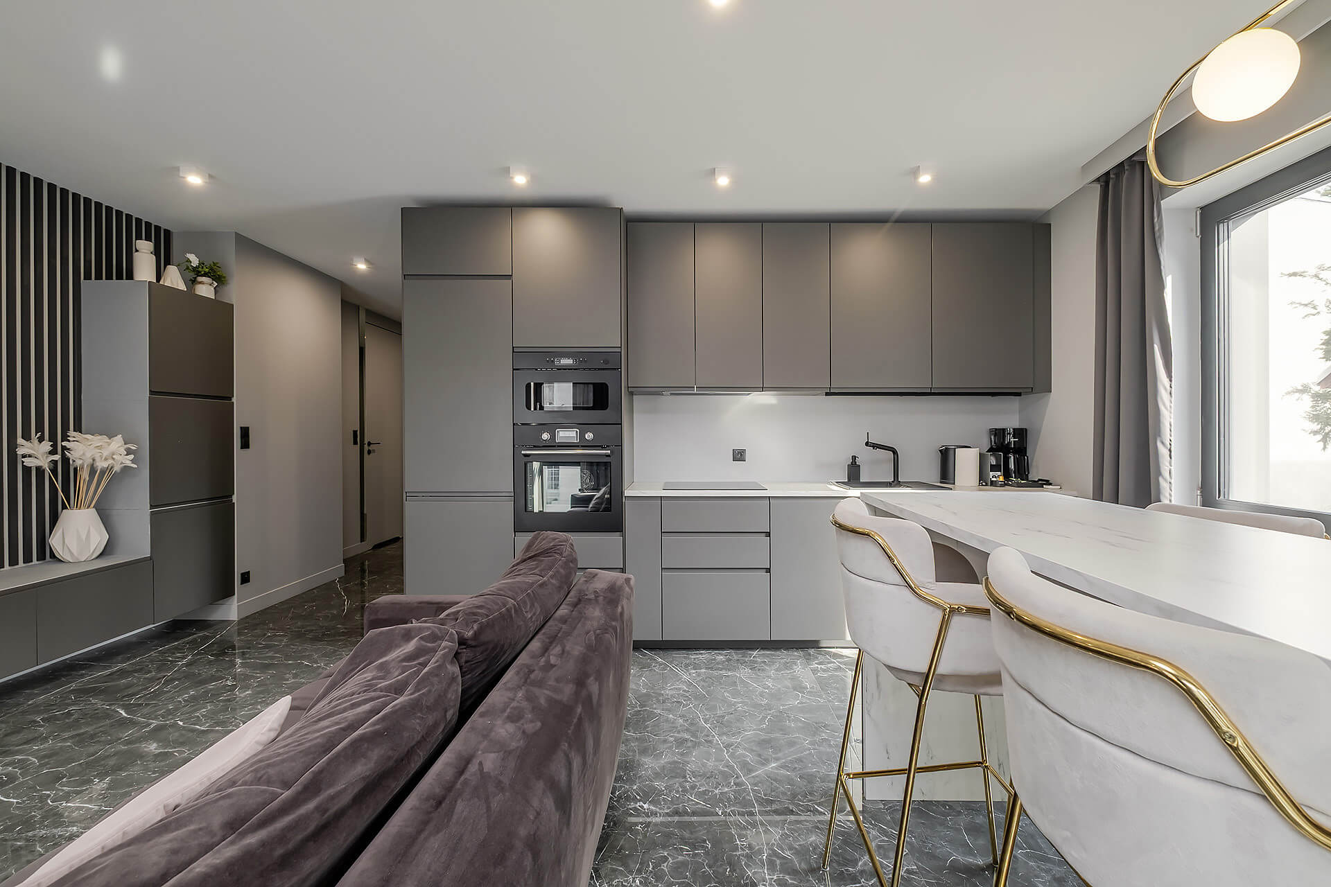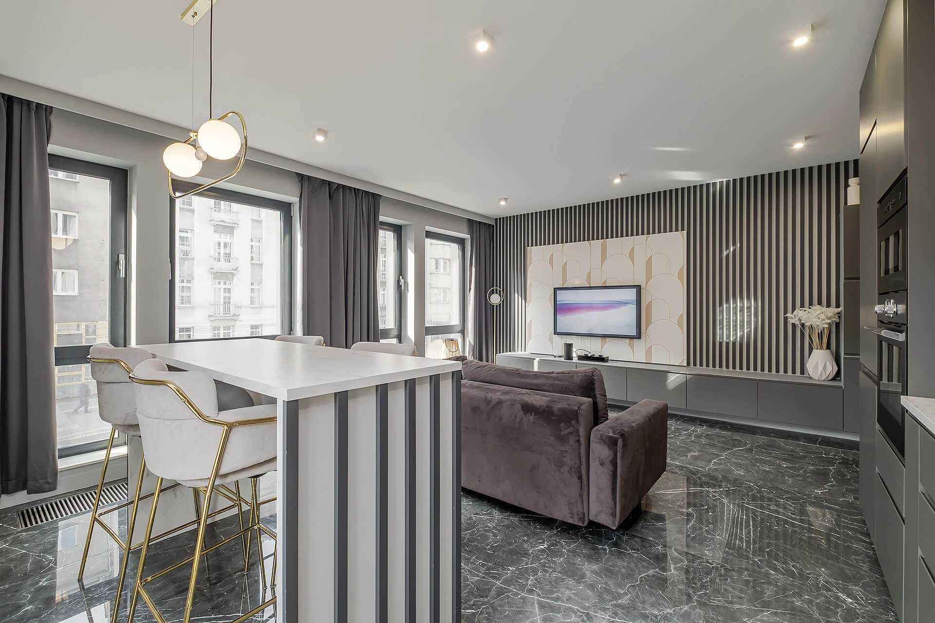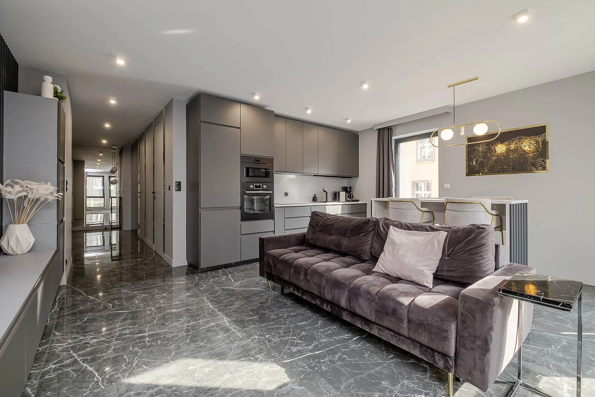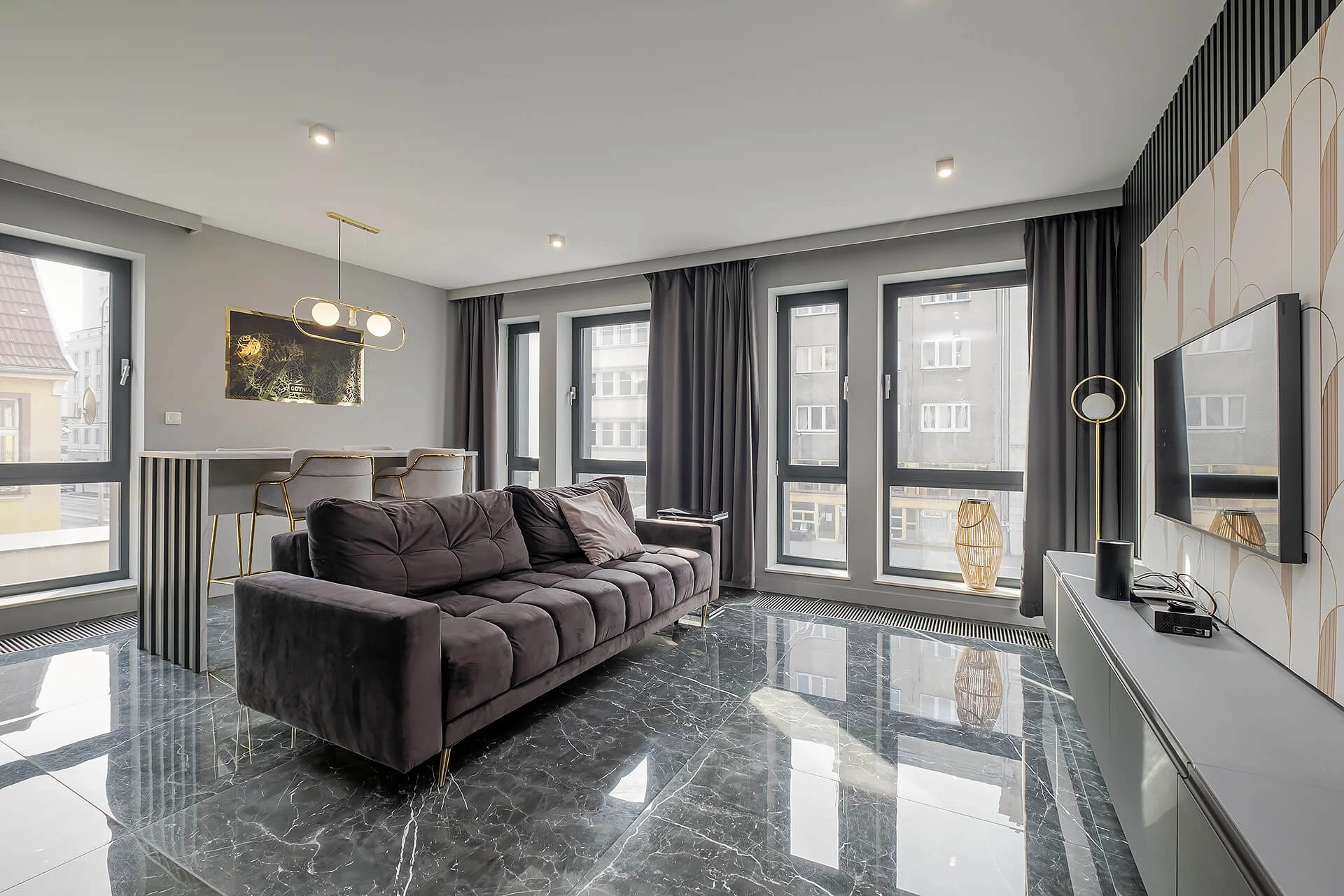 Apartament został zaprojektowany z dbałością o każdy detal, przy użyciu wysokiej klasy materiałów i eleganckich dodatków.