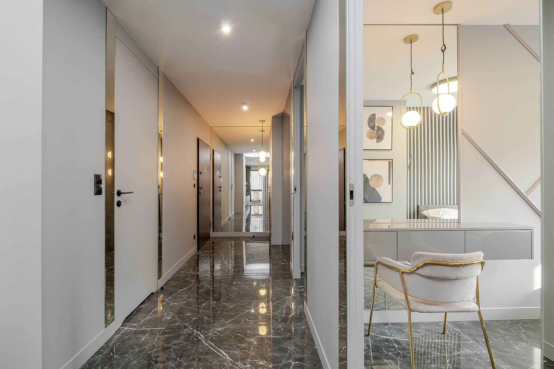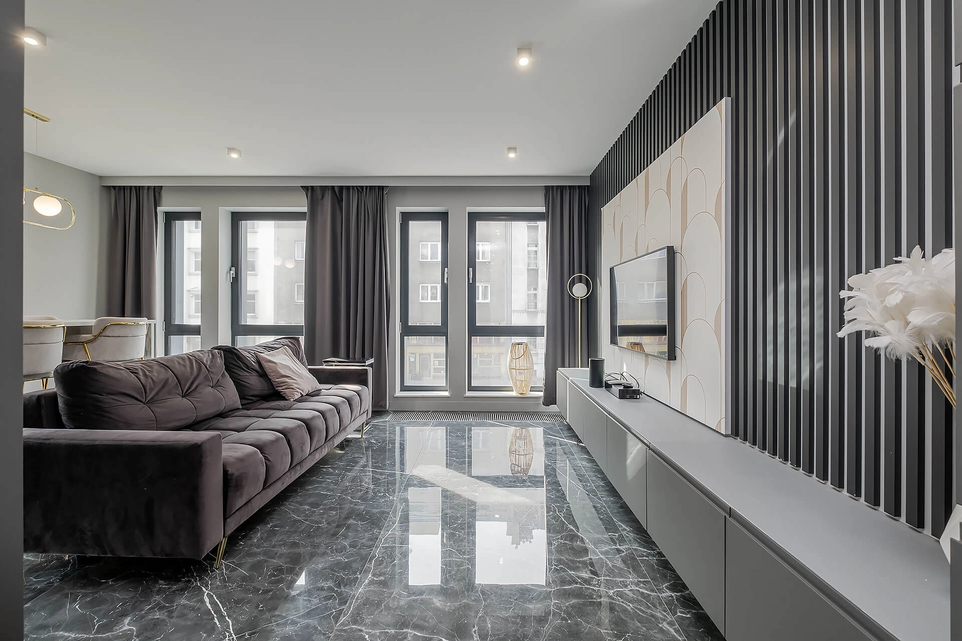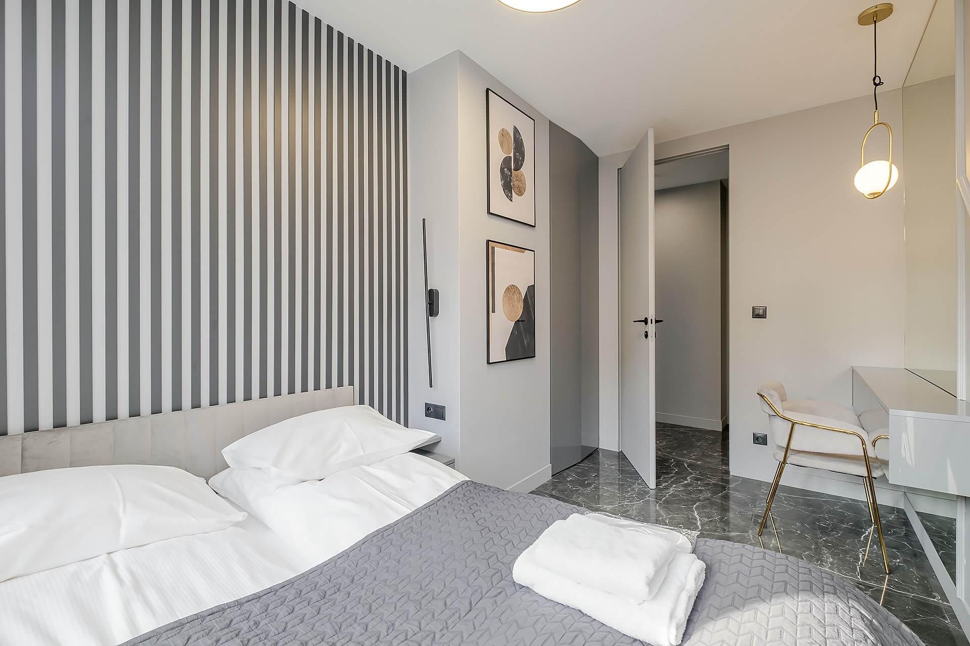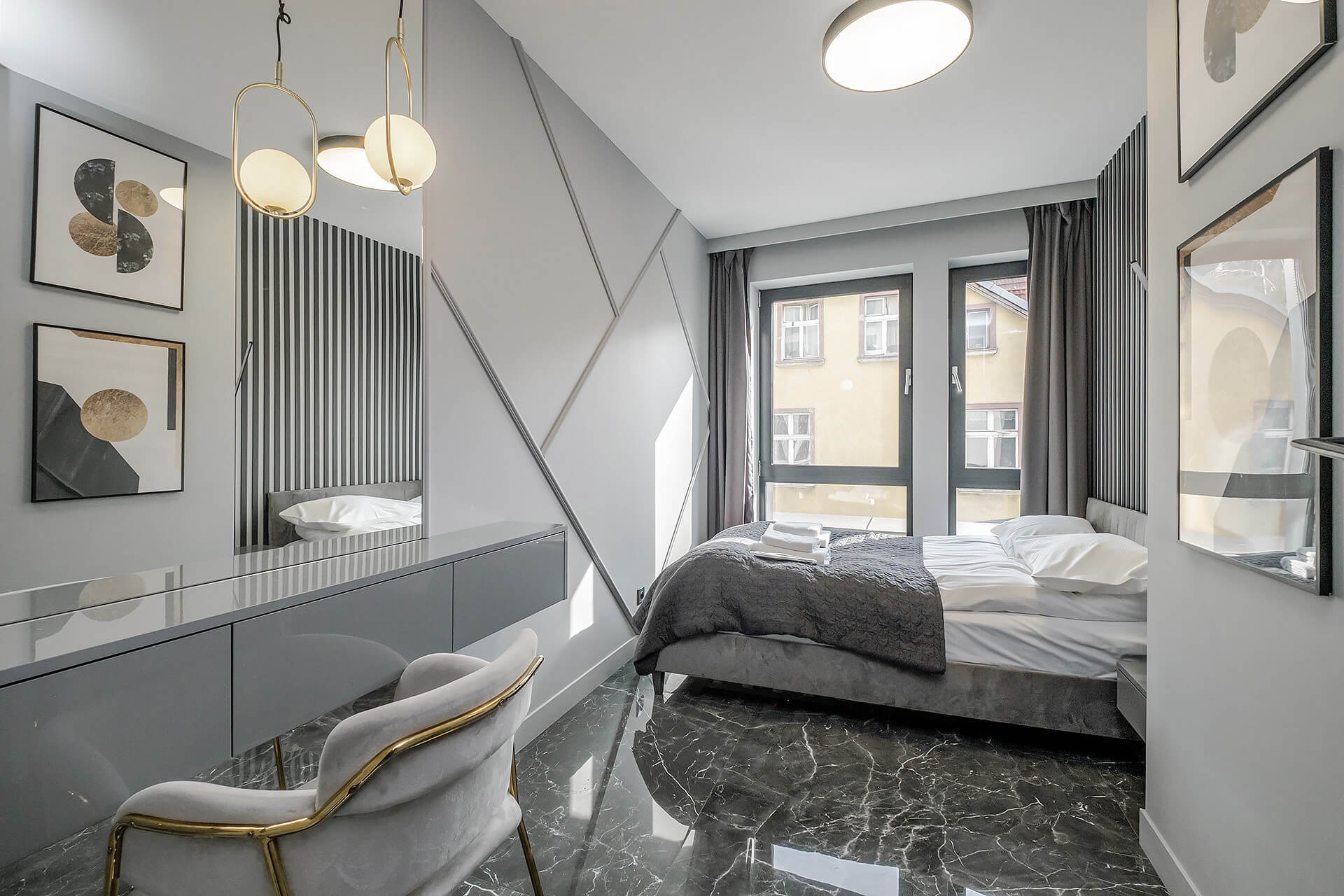 Apartament został zaprojektowany z dbałością o każdy detal, przy użyciu wysokiej klasy materiałów i eleganckich dodatków.