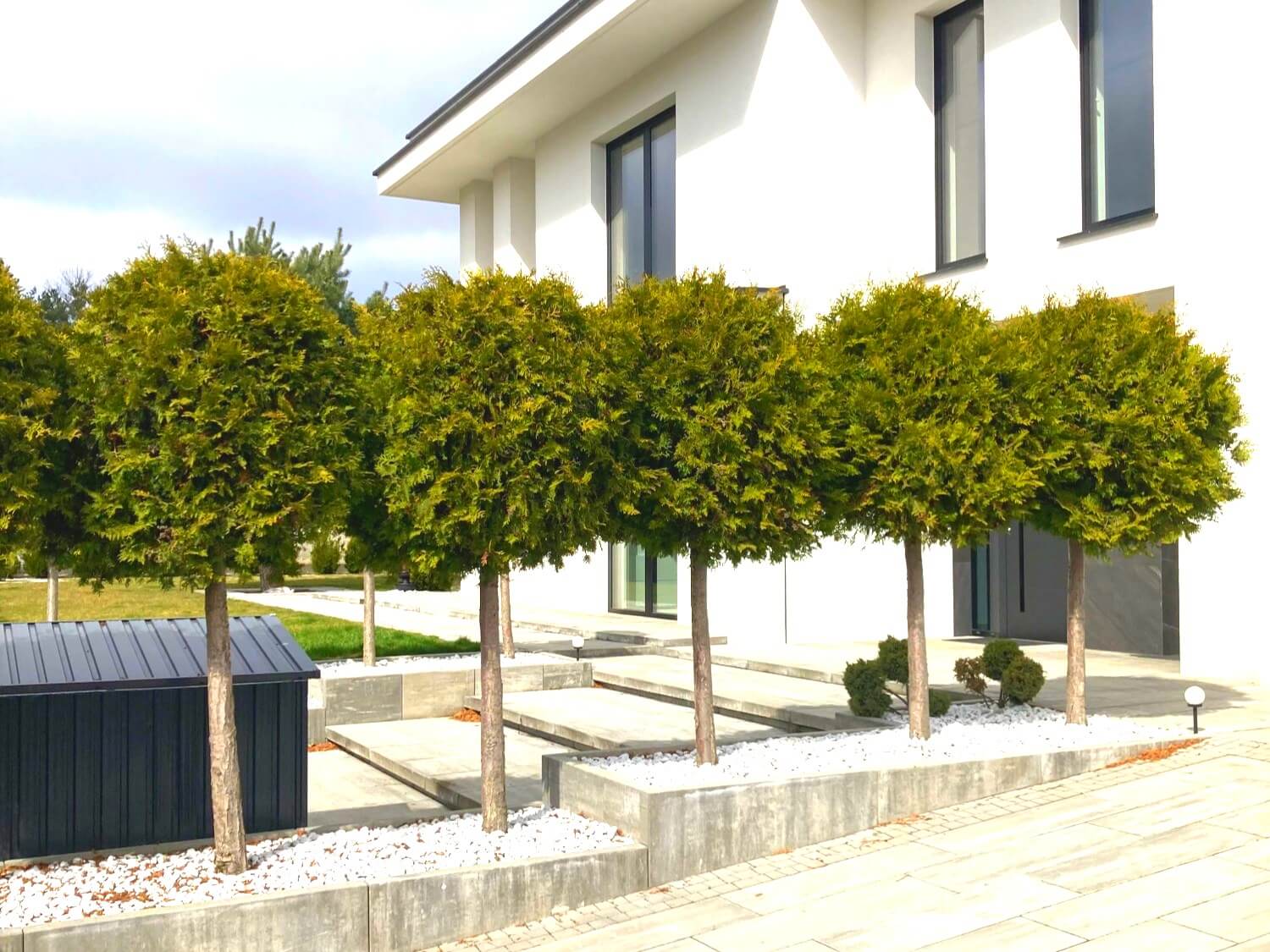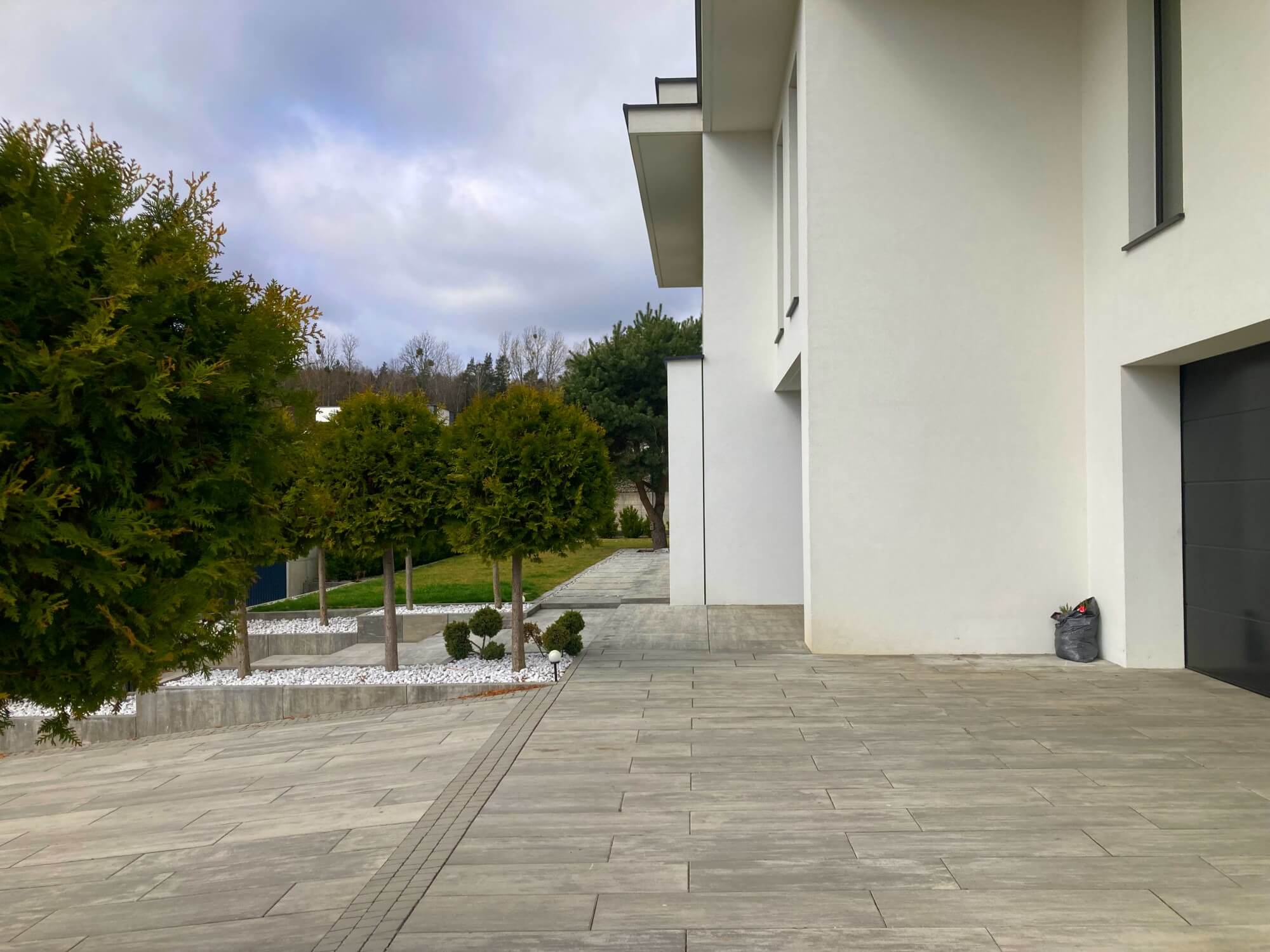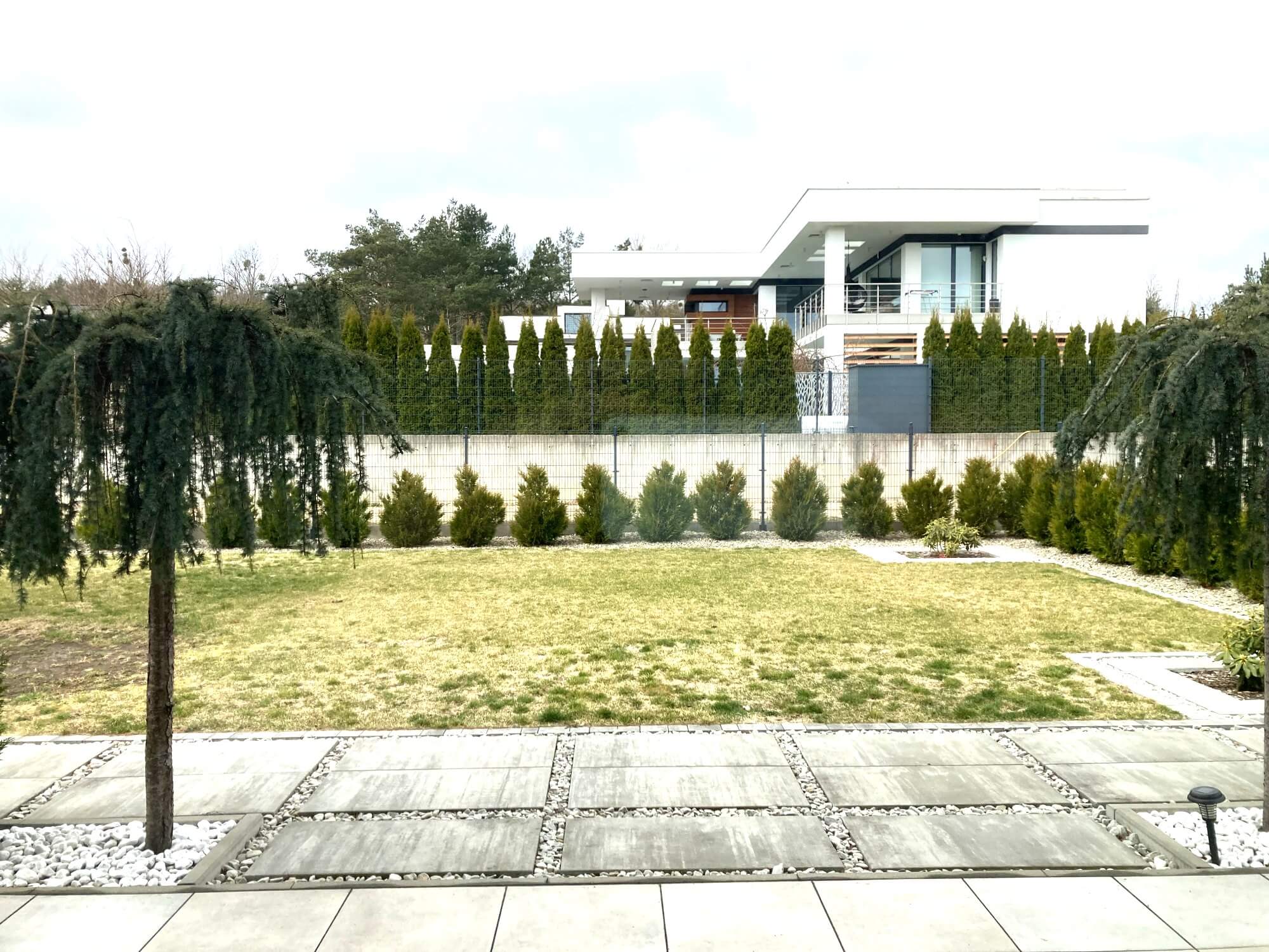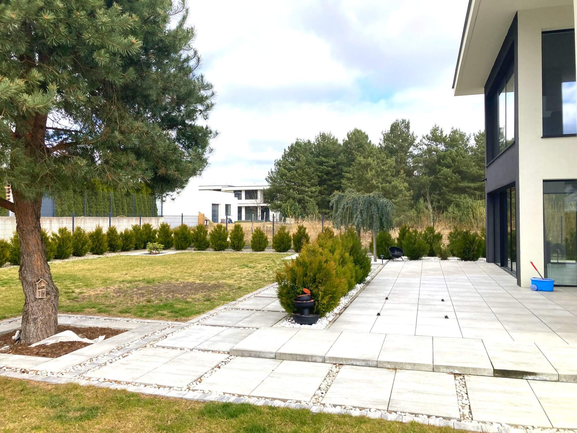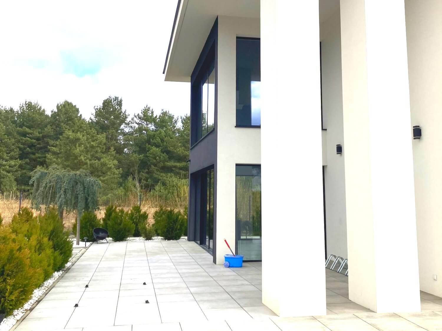 Prosta, geometryczna bryła domu idealnie wpisuje się w nowoczesną estetykę architektoniczną. Duże przeszklenia zapewniają maksymalne doświetlenie wnętrz i płynne połączenie strefy mieszkalnej z ogrodem w ekspozycji południowo-zachodniej. Elewacja wykończona została w stonowanej kolorystyce, z użyciem wysokiej jakości materiałów, takich jak beton architektoniczny, drewno i szkło (okna aluminiowe), co podkreśla prestiżowy charakter inwestycji.