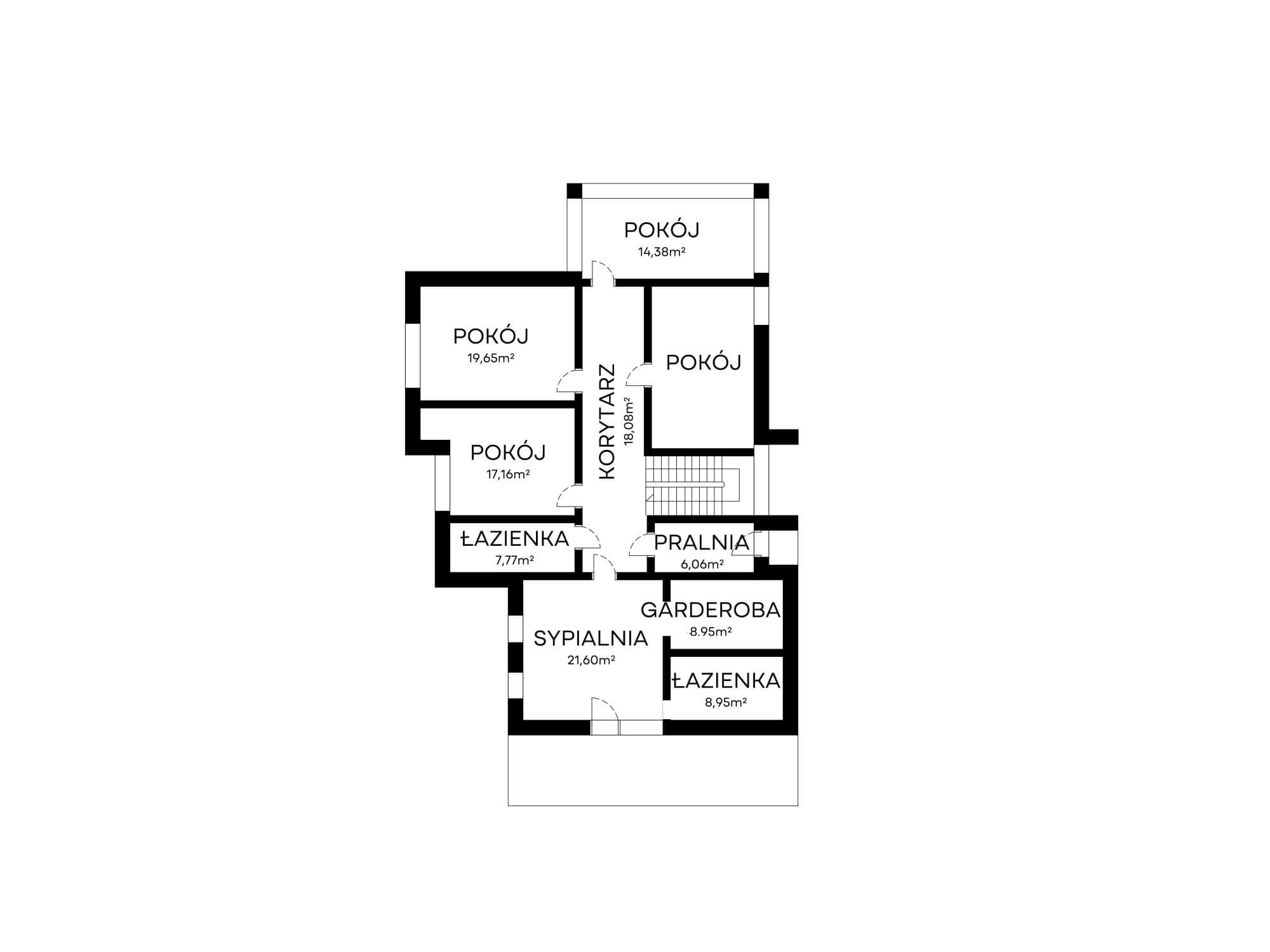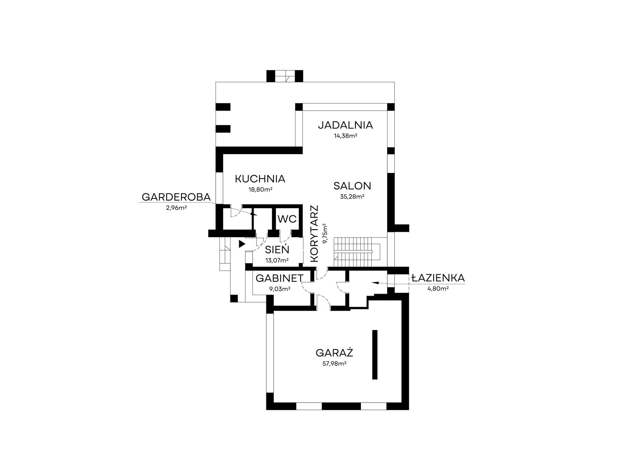 Wnętrze domu oferuje przestronną strefę dzienną z otwartą kuchnią i salonem, sypialnie z widokiem na zieleń oraz dodatkowe pomieszczenia użytkowe.