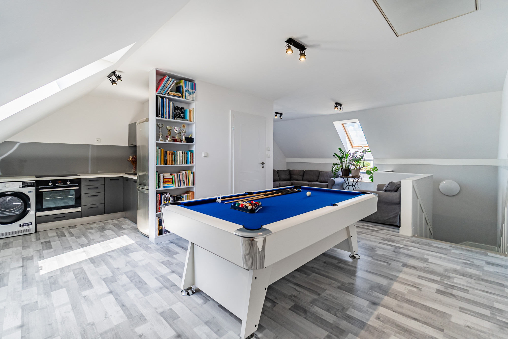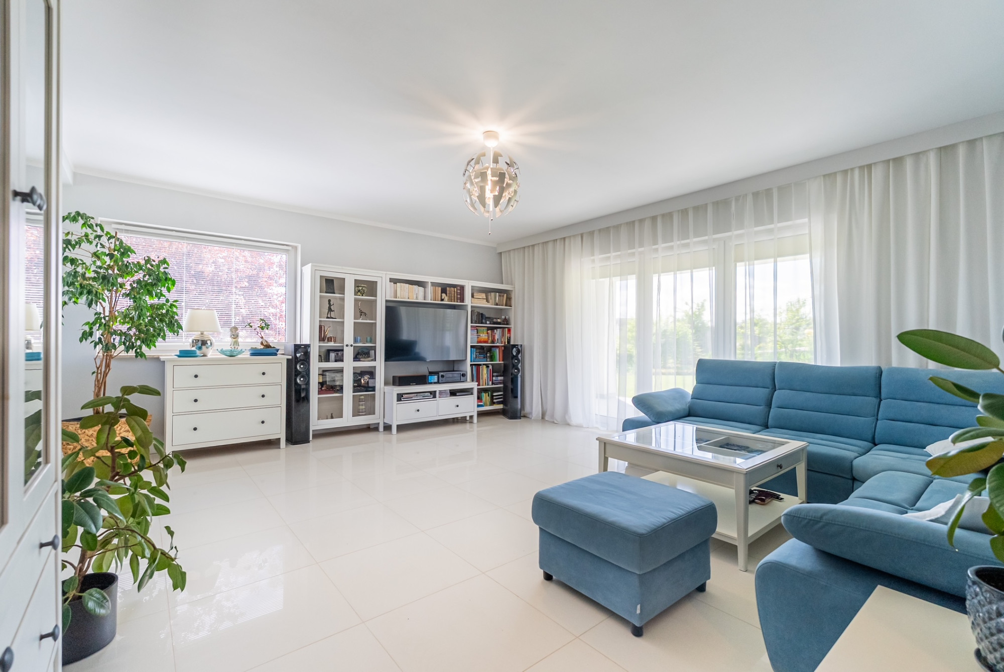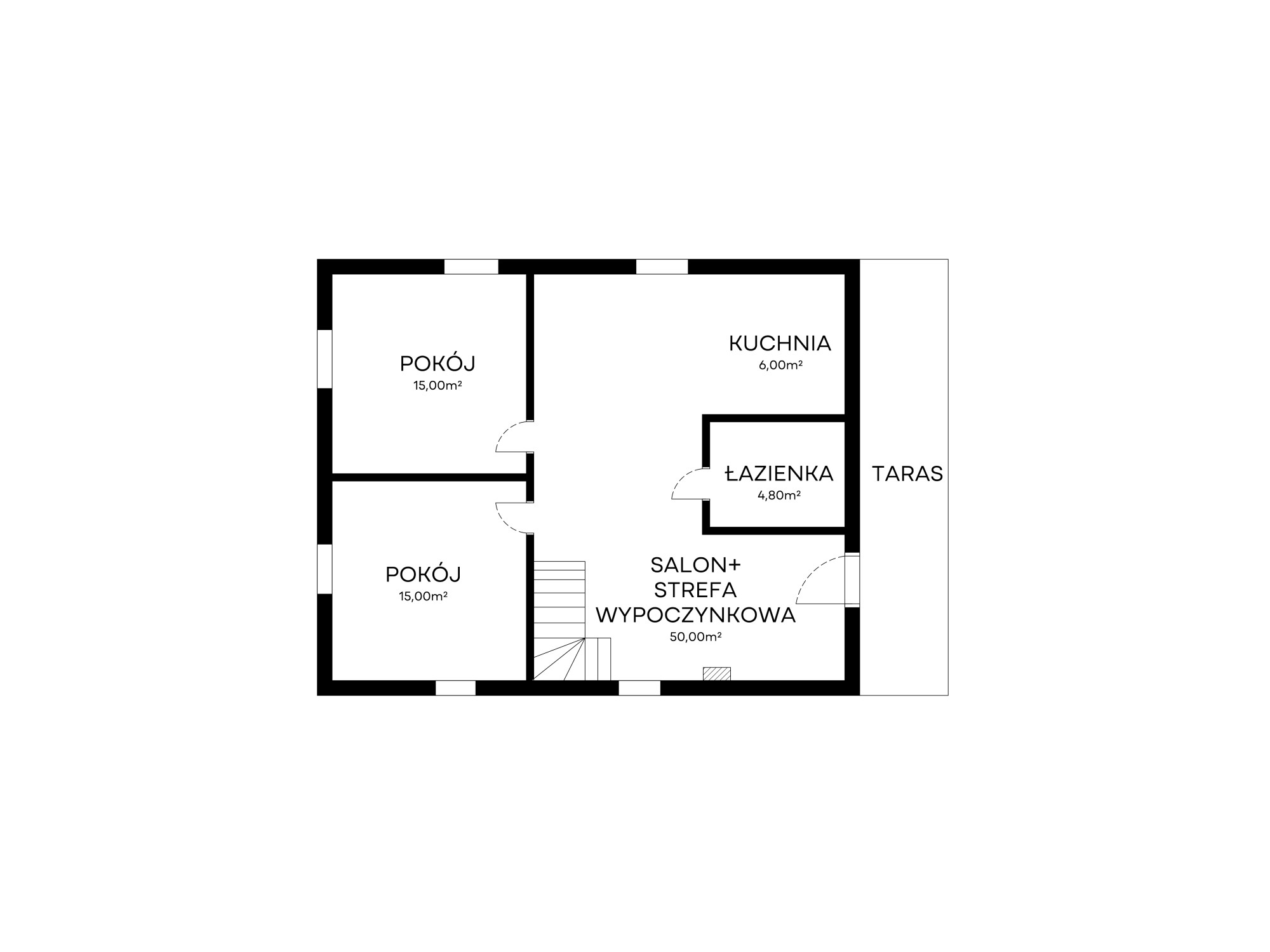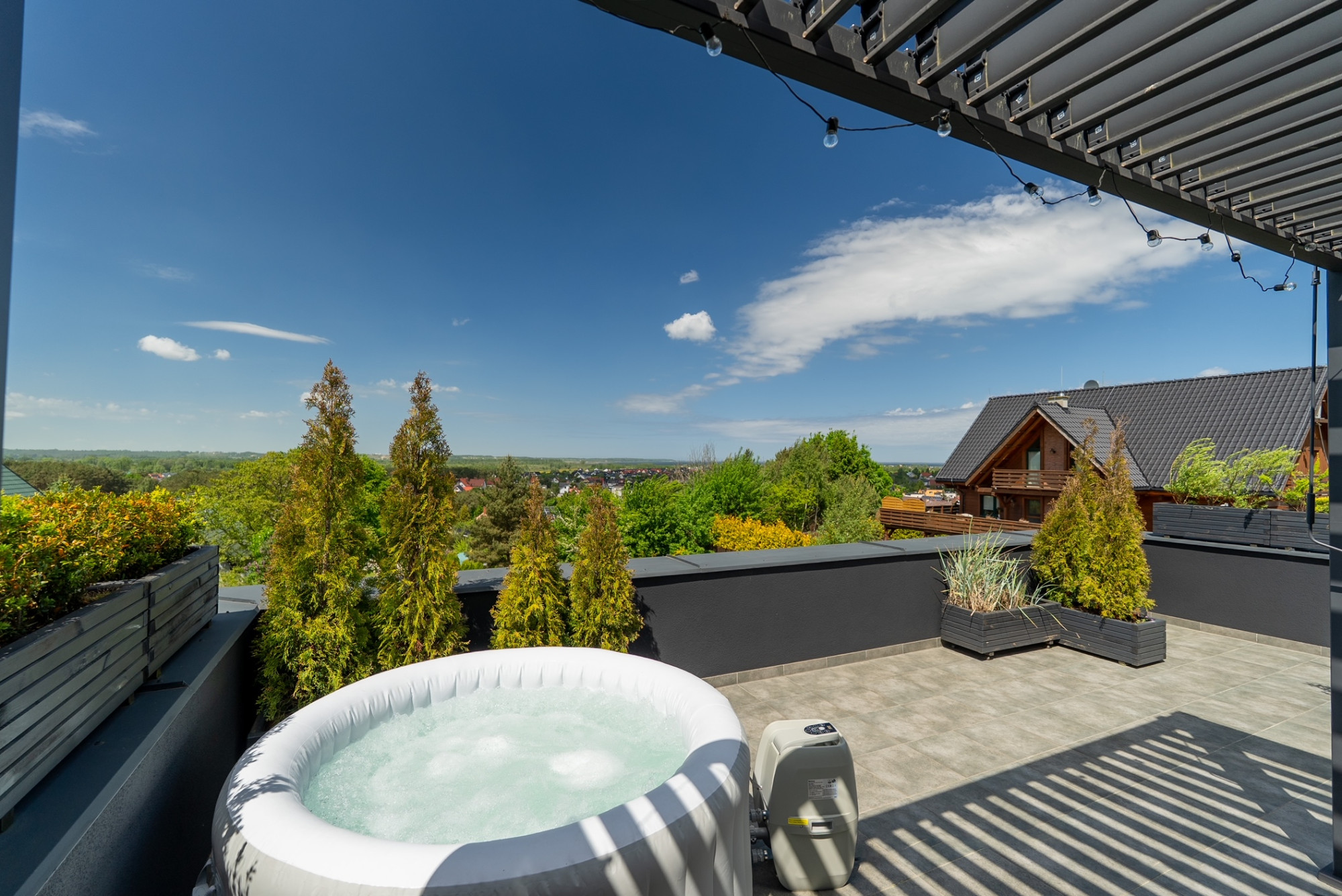 – salon z strefą wypoczynkową 50m² i wyjściem na górny taras (45m²) wyposażony w uchylne