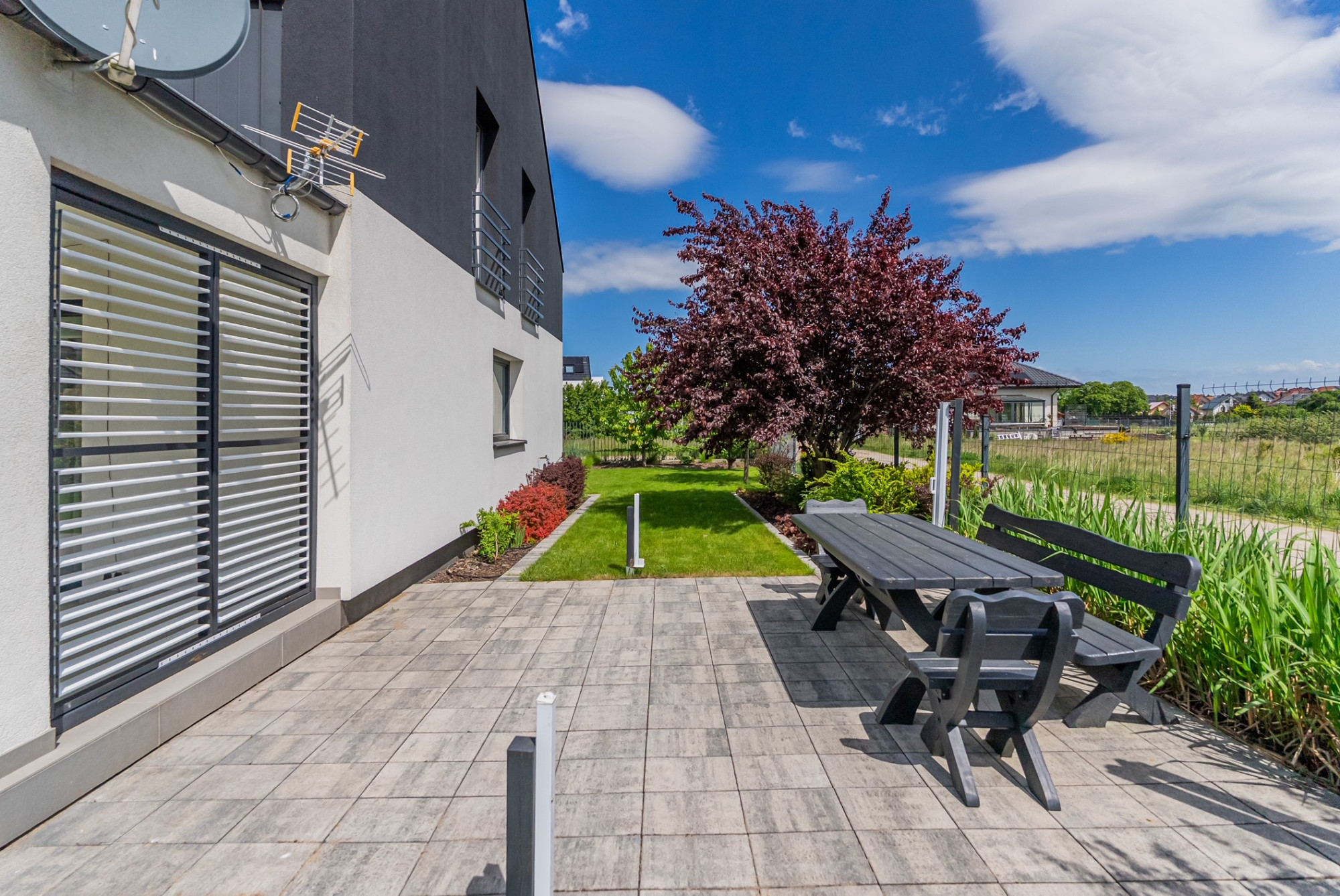 Atutem domu jest malowniczy, profesjonalnie zaprojektowany i zadbany ogród, tworzący wyjątkową atmosferę i sprzyjający cieszeniu się naturą przez cały rok. Liczne nasadzenia: brzozy, jabłonie, grusze, wiśnie, bukszpan, kosodrzewina, trawy, winorośl oraz przestrzeń na własne uprawy – warzywnik z systemem automatycznego nawadniania.
