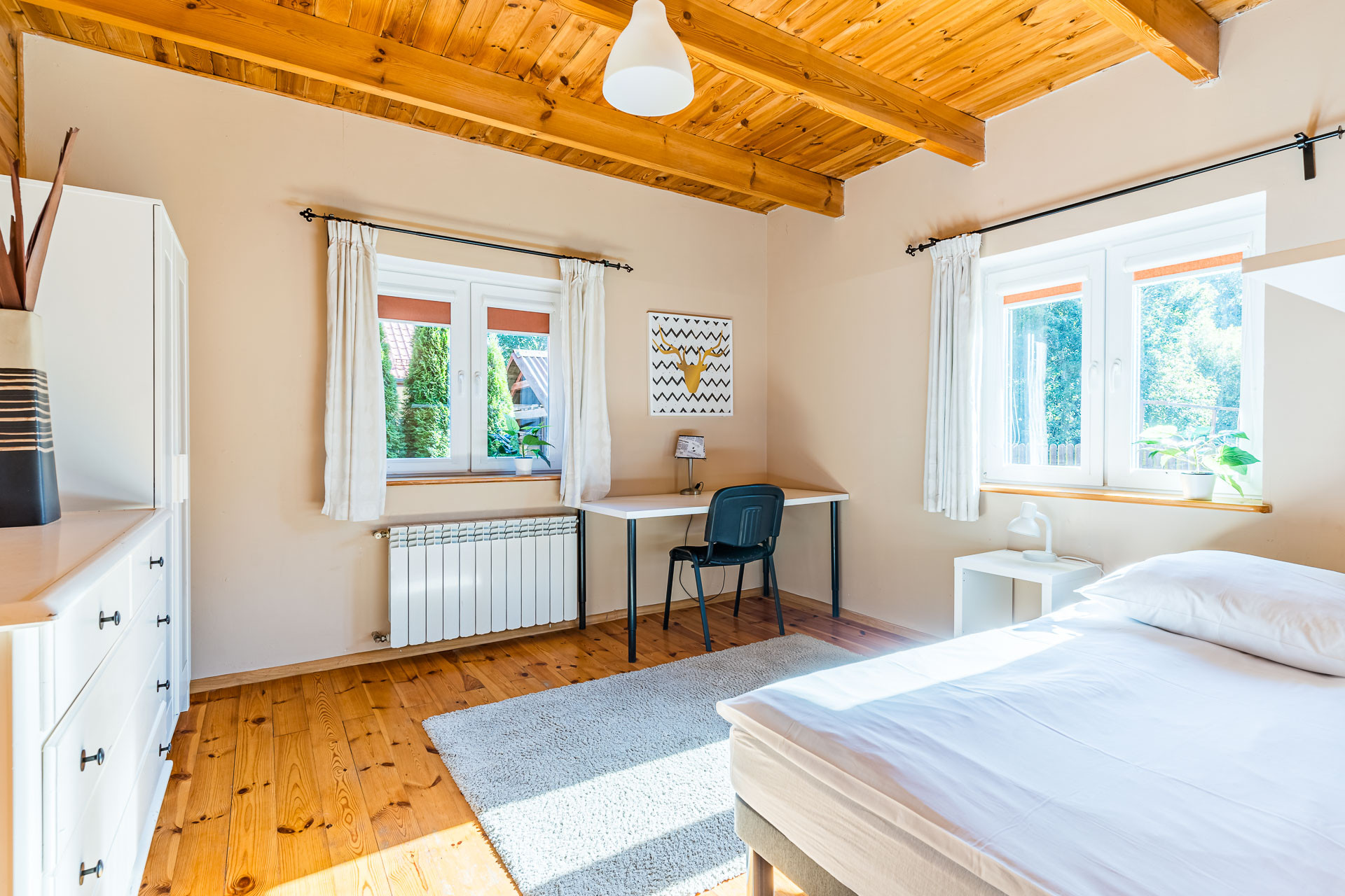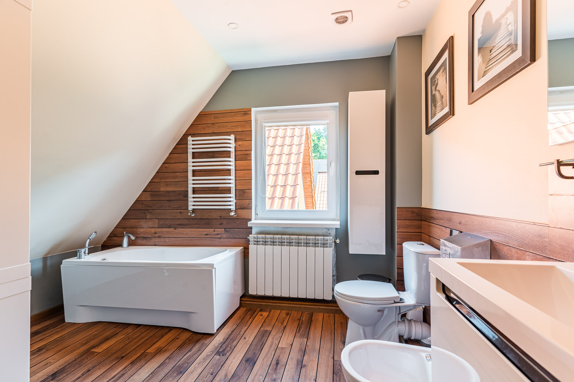 4 sypialni w tym jednej z balkonem, garderoby, łazienki z wanną i strychu.
