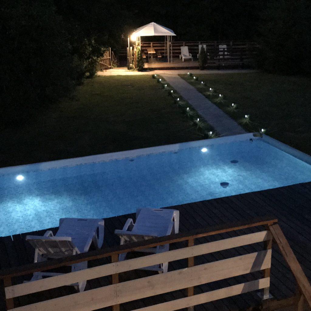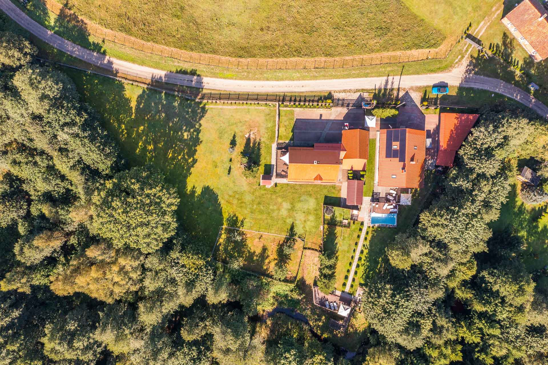 Domy są położone na działce o powierzchni 4570m2. Znajdują się na niej trzy budynki mieszkalne o łącznej powierzchni 332,5m2 oraz dwa budynki gospodarcze i basen.