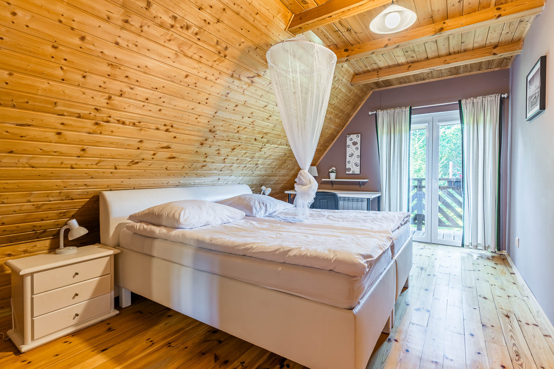 4 sypialni w tym jednej z balkonem, garderoby, łazienki z wanną i strychu.