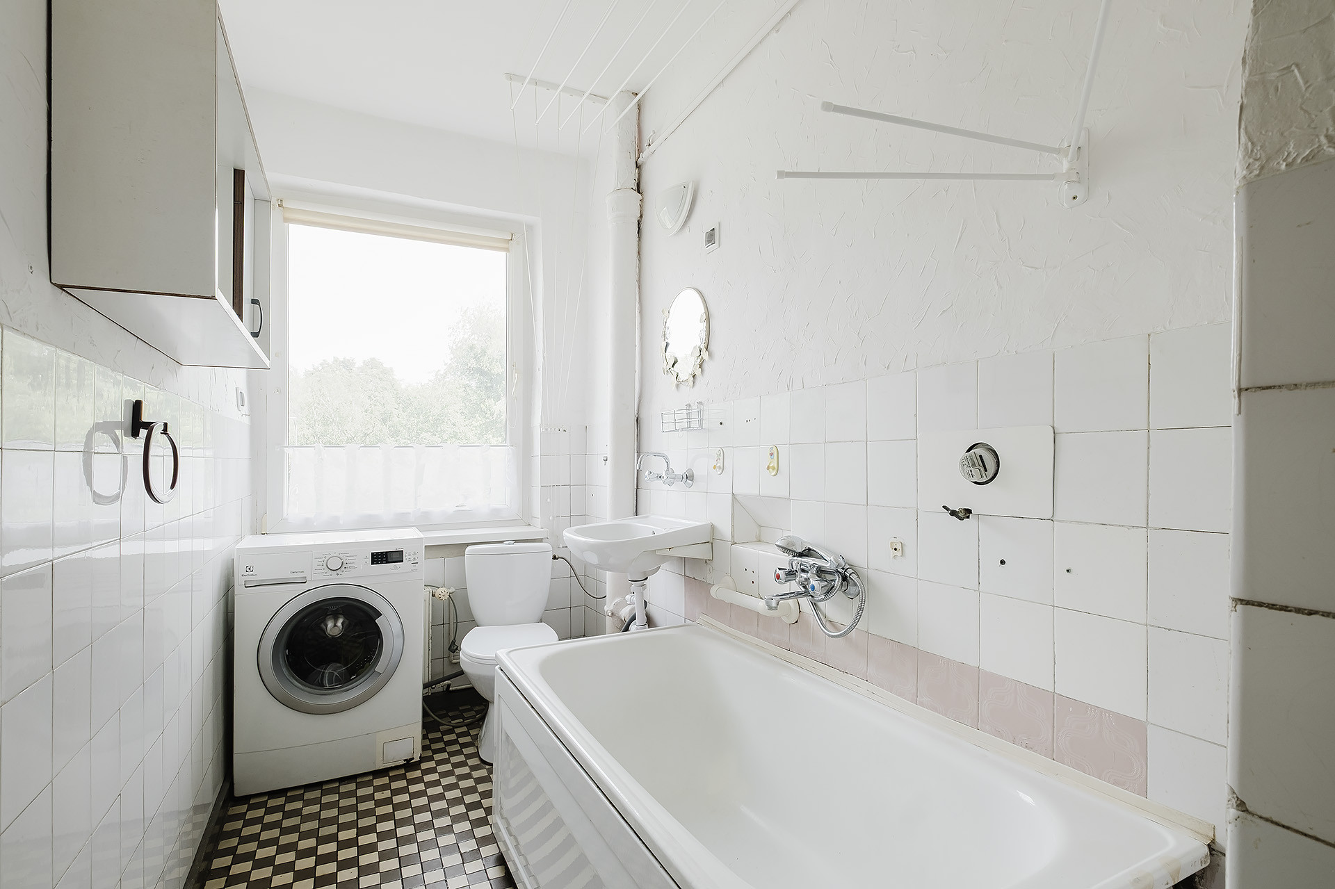 Nieruchomość obejmuje salon z dużymi oknami, kuchnię z oknem, przytulną sypialnię, łazienkę z wanną oraz funkcjonalny przedpokój.