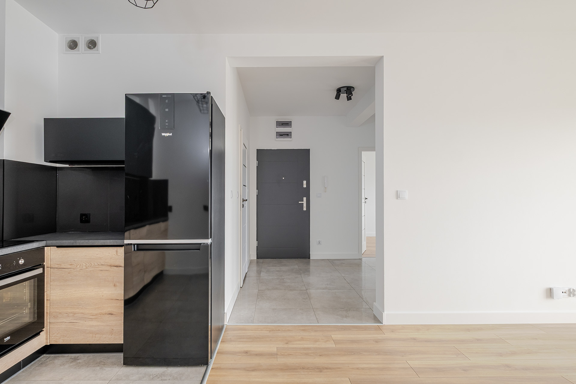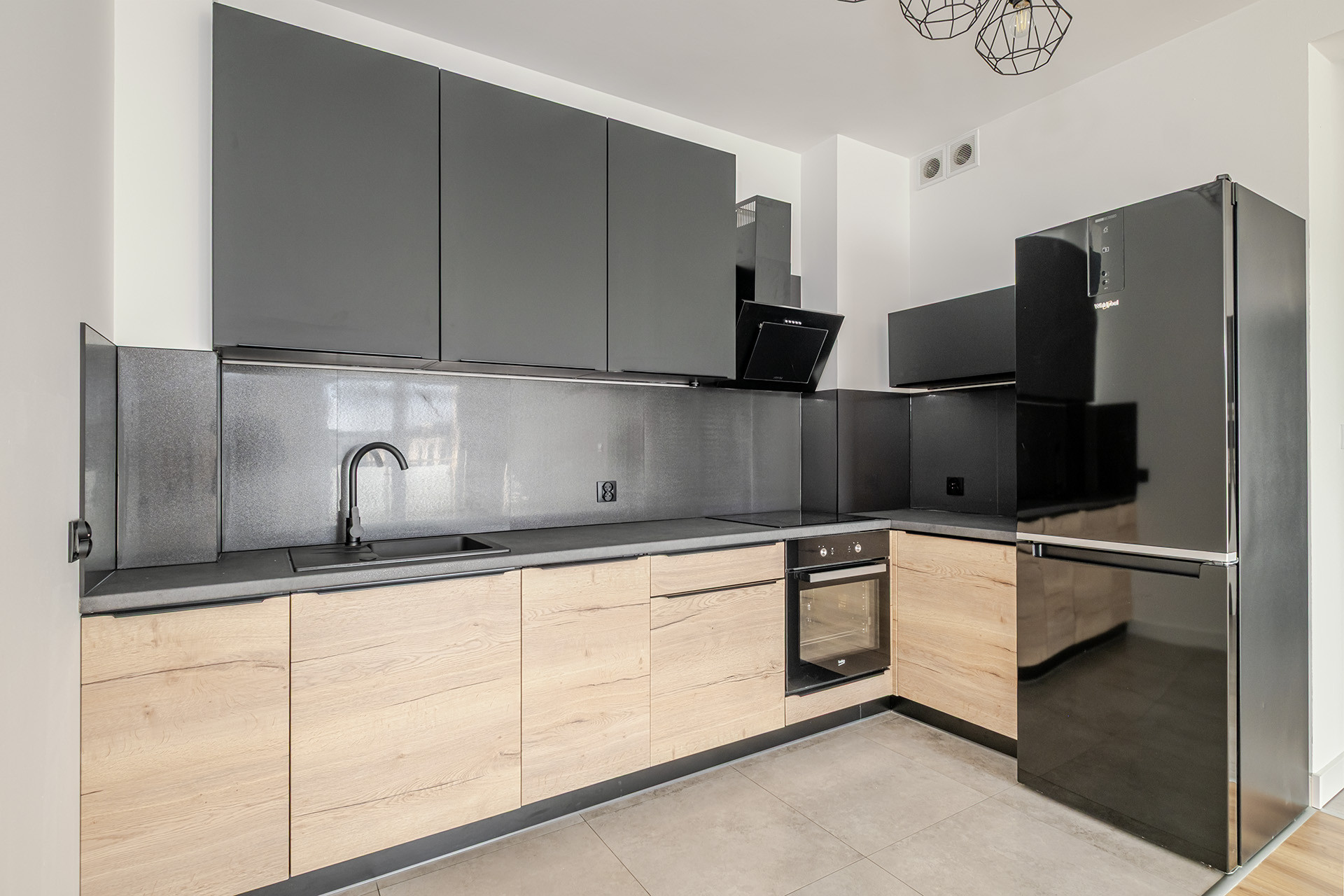 W aneksie nowoczesne meble w zabudowie i nowy sprzęt AGD.