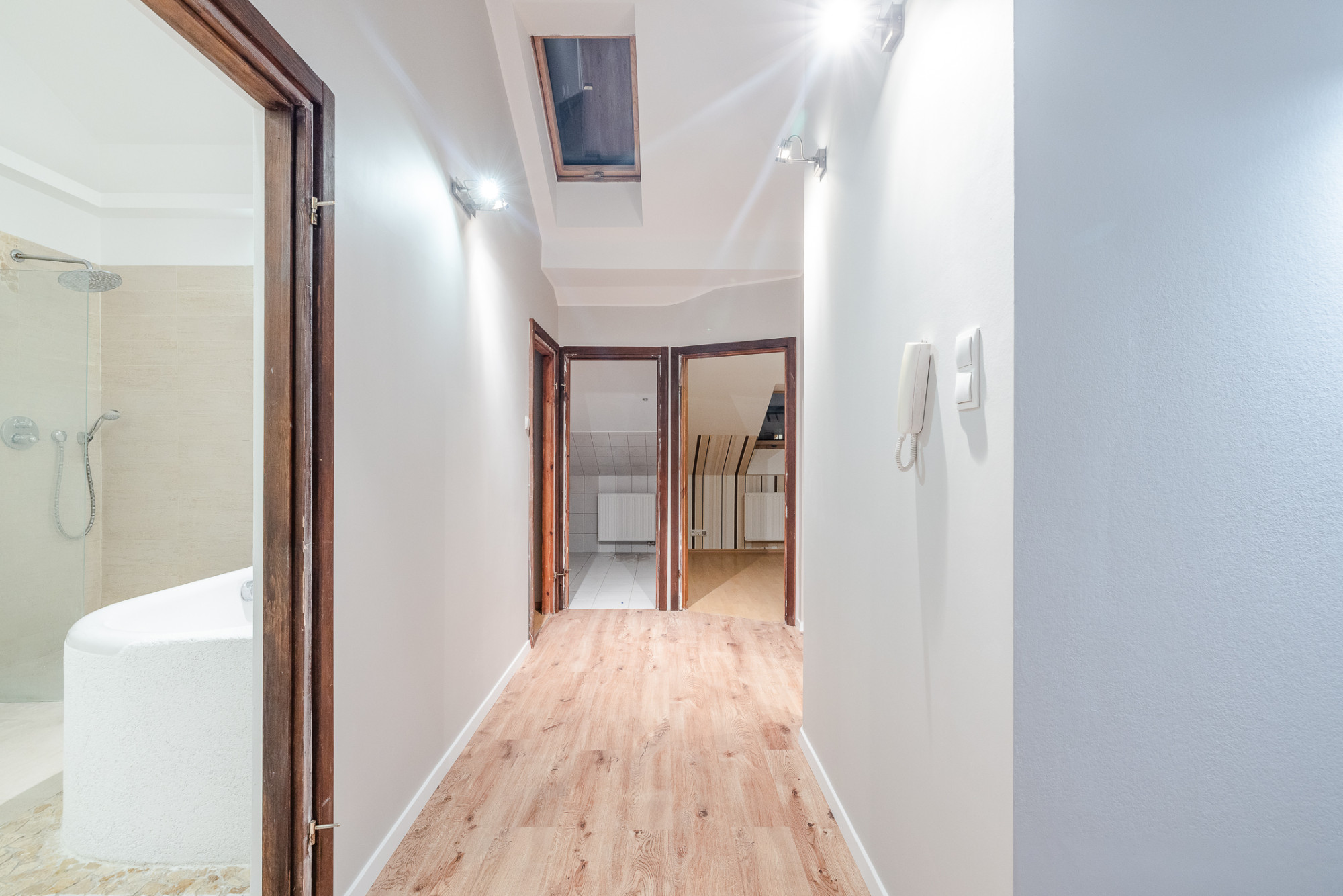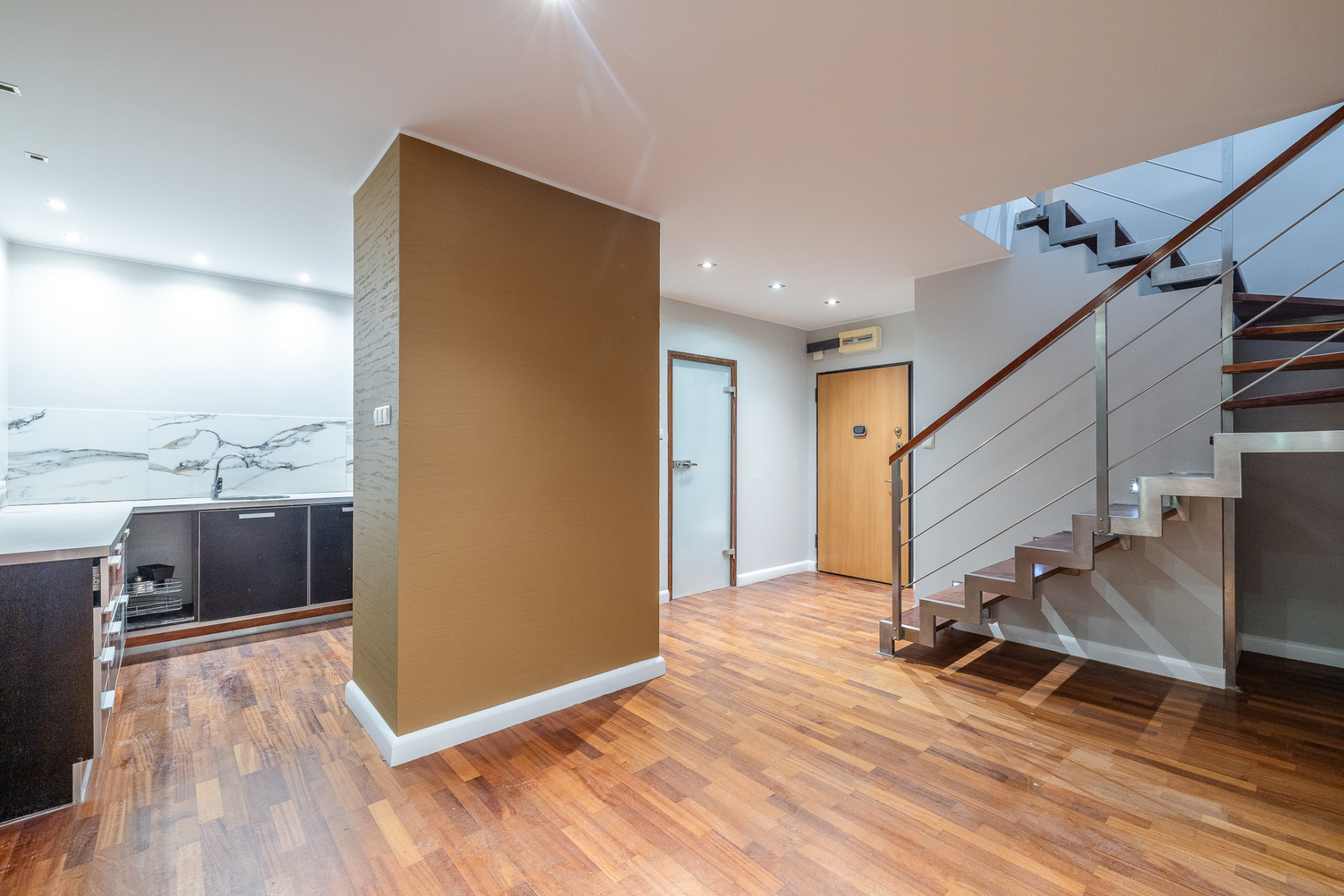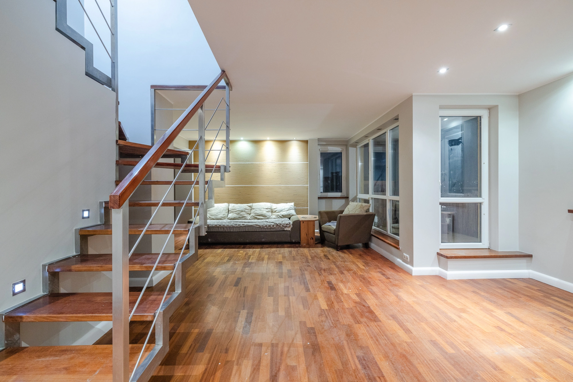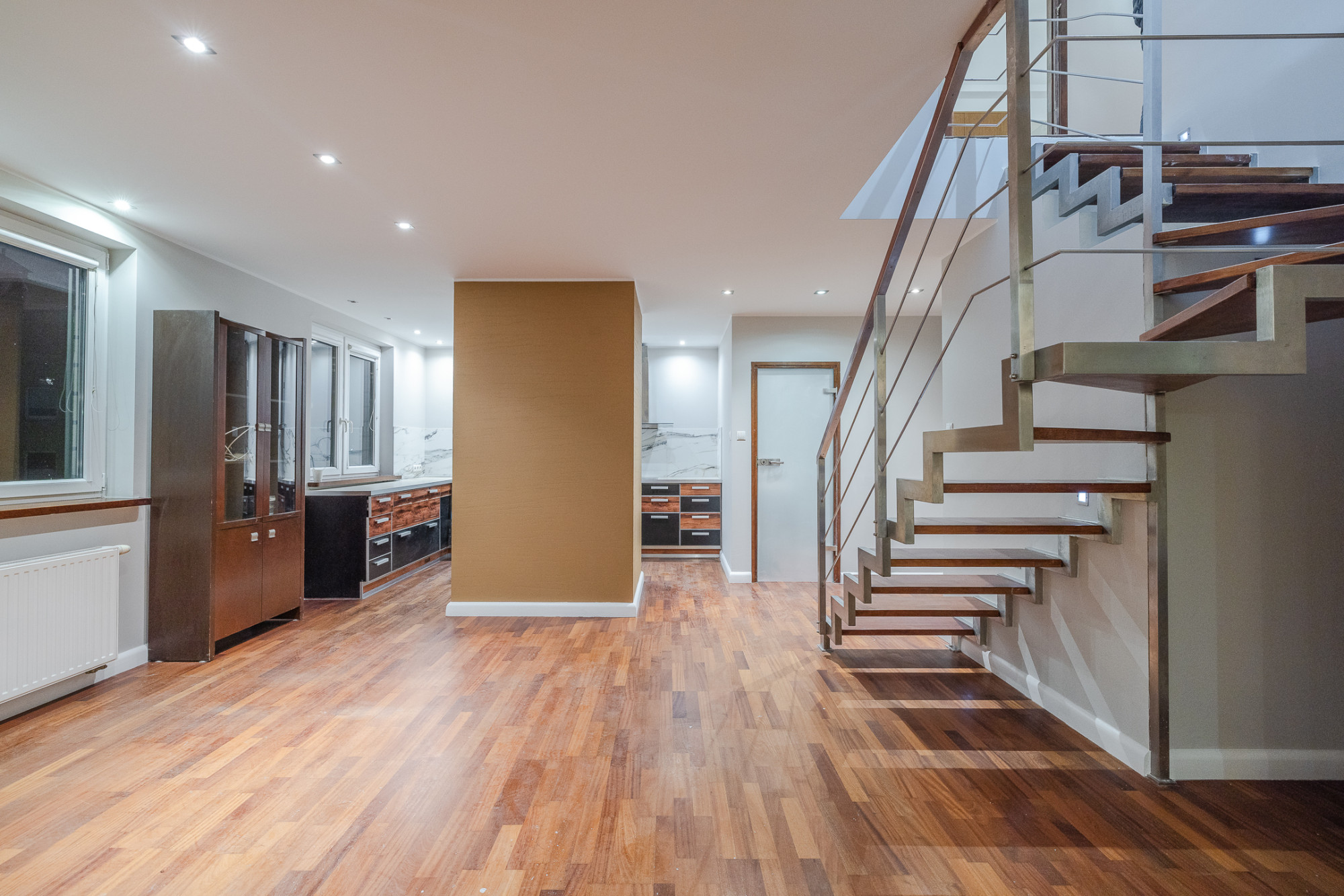 Położone na czwartym piętrze, dwu poziomowe mieszkanie o powierzchni po podłodze około 140m2, (w Księdze Wieczystej 110,78m2) składa się z: