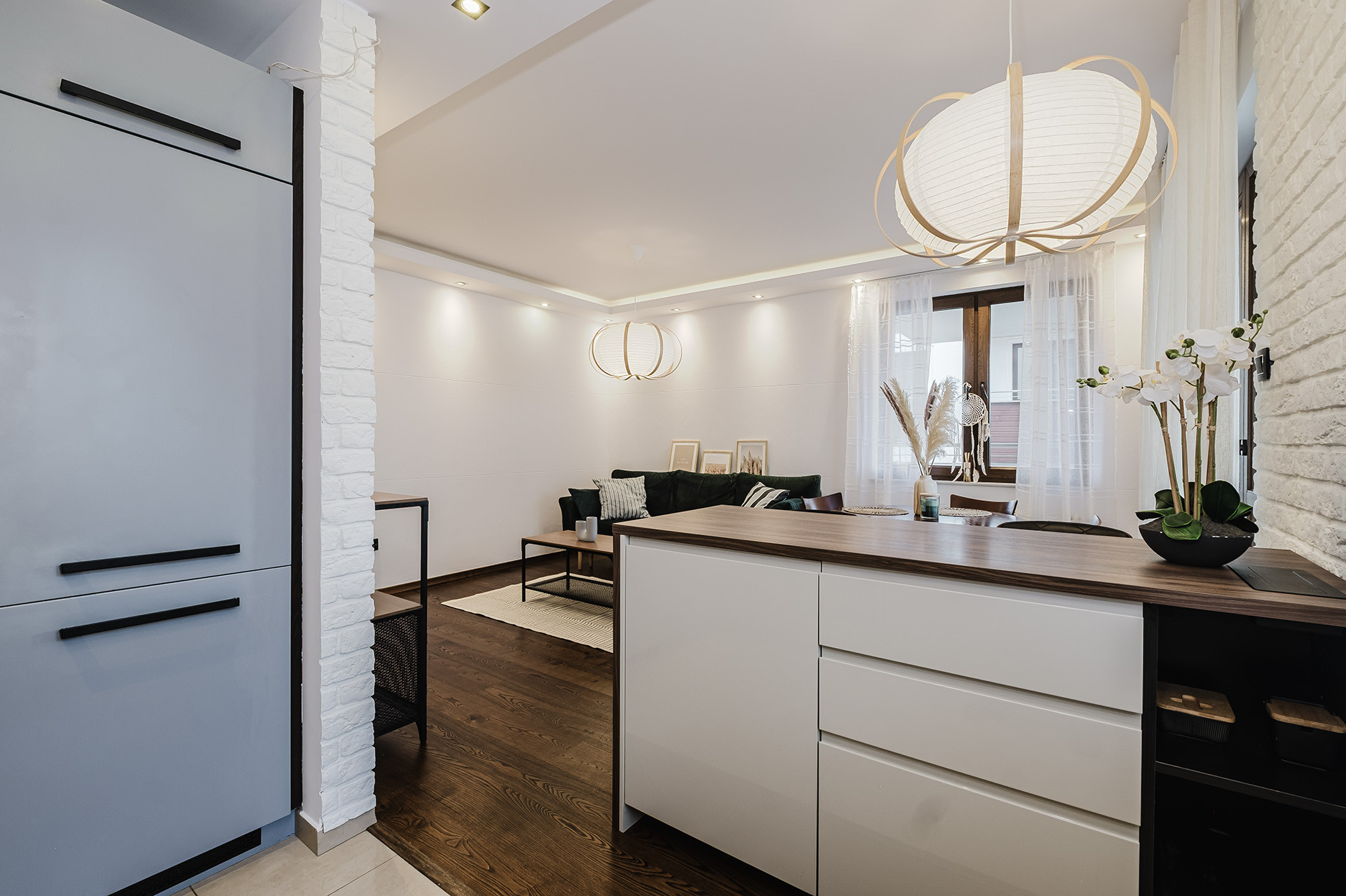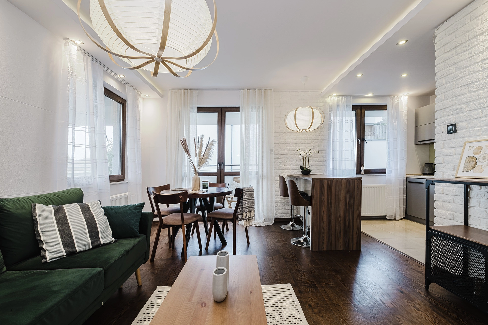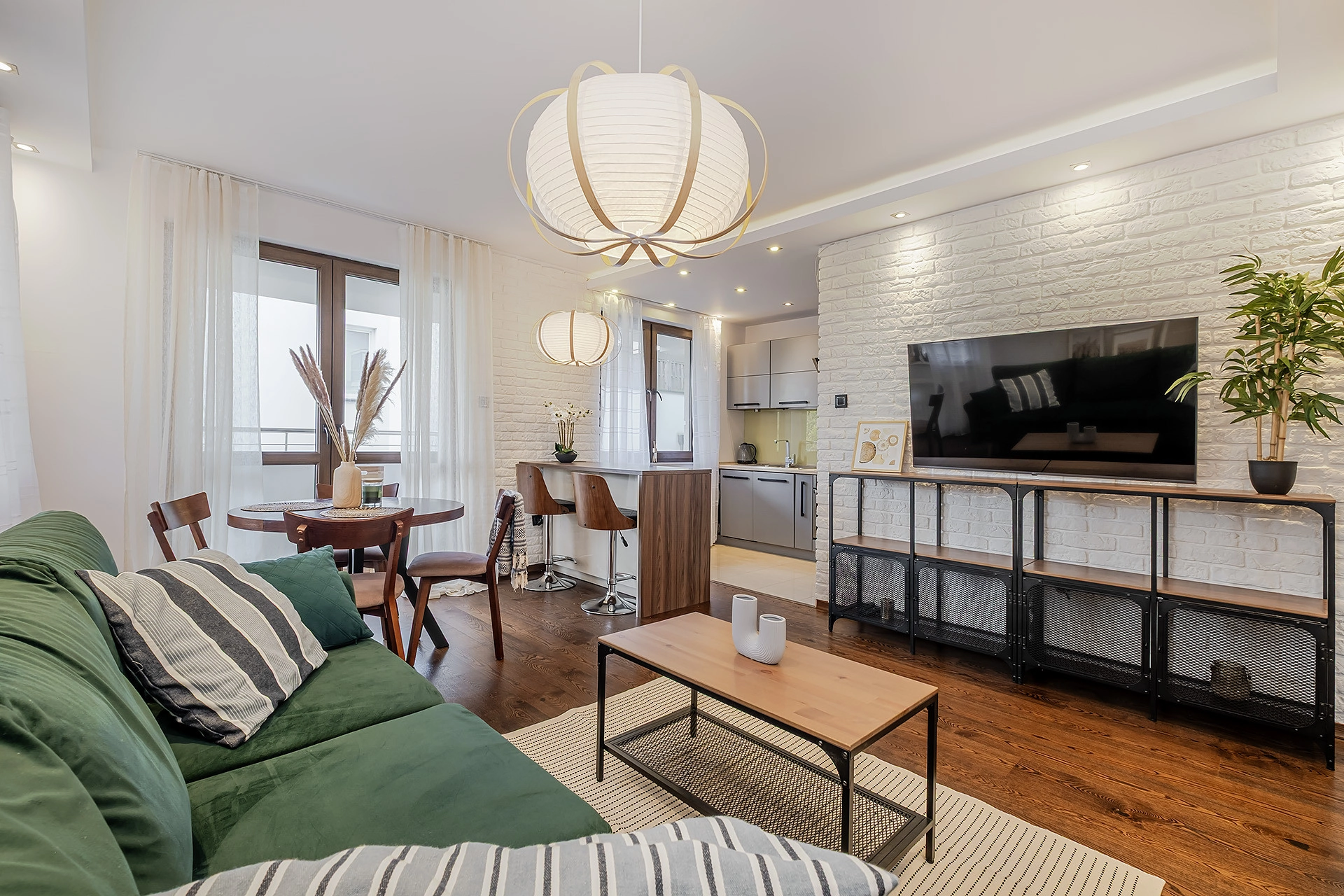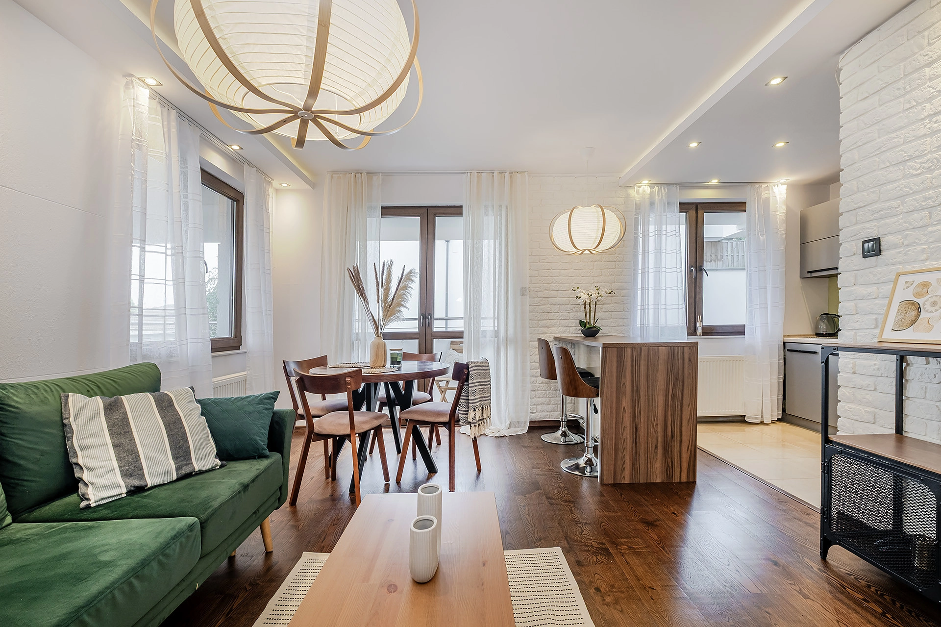 jasny salon z aneksem kuchennym i wyjściem na balkon,