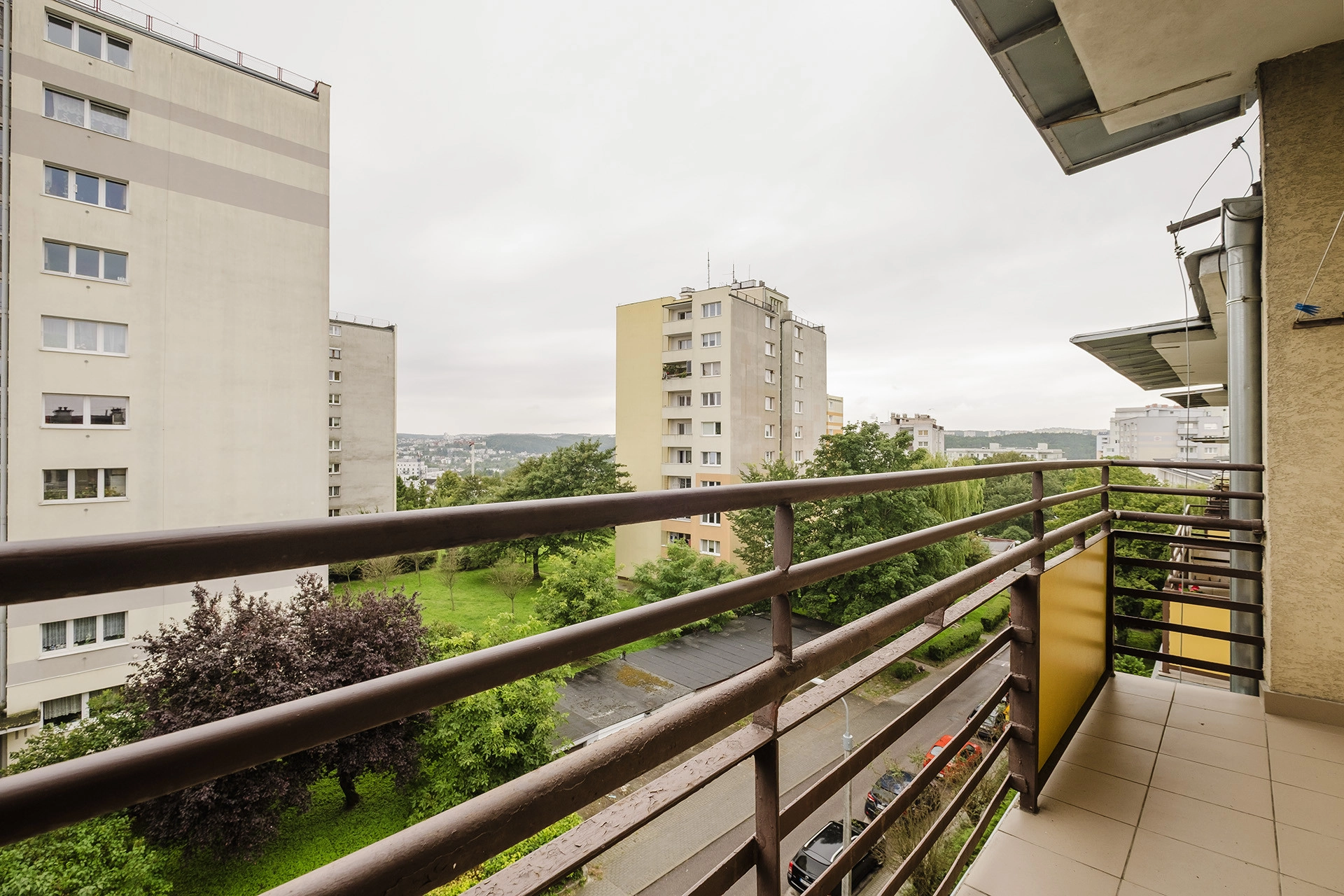 – słoneczny balkon z panoramicznym widokiem na panoramę miasta