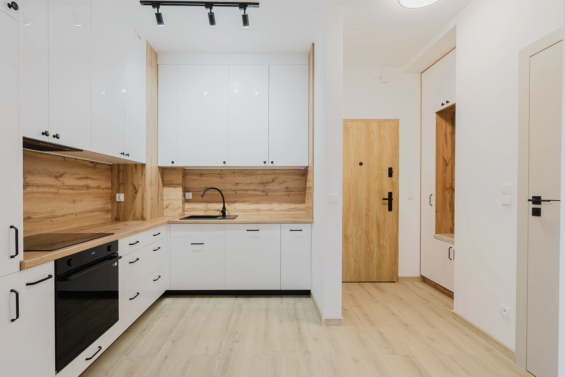 Kuchnia z nowymi, eleganckimi meblami w zabudowie z pełnym AGD (piekarnik, płyta indukcyjna, zmywarka, okap, lodówka), a także z łazienki z prysznicem.