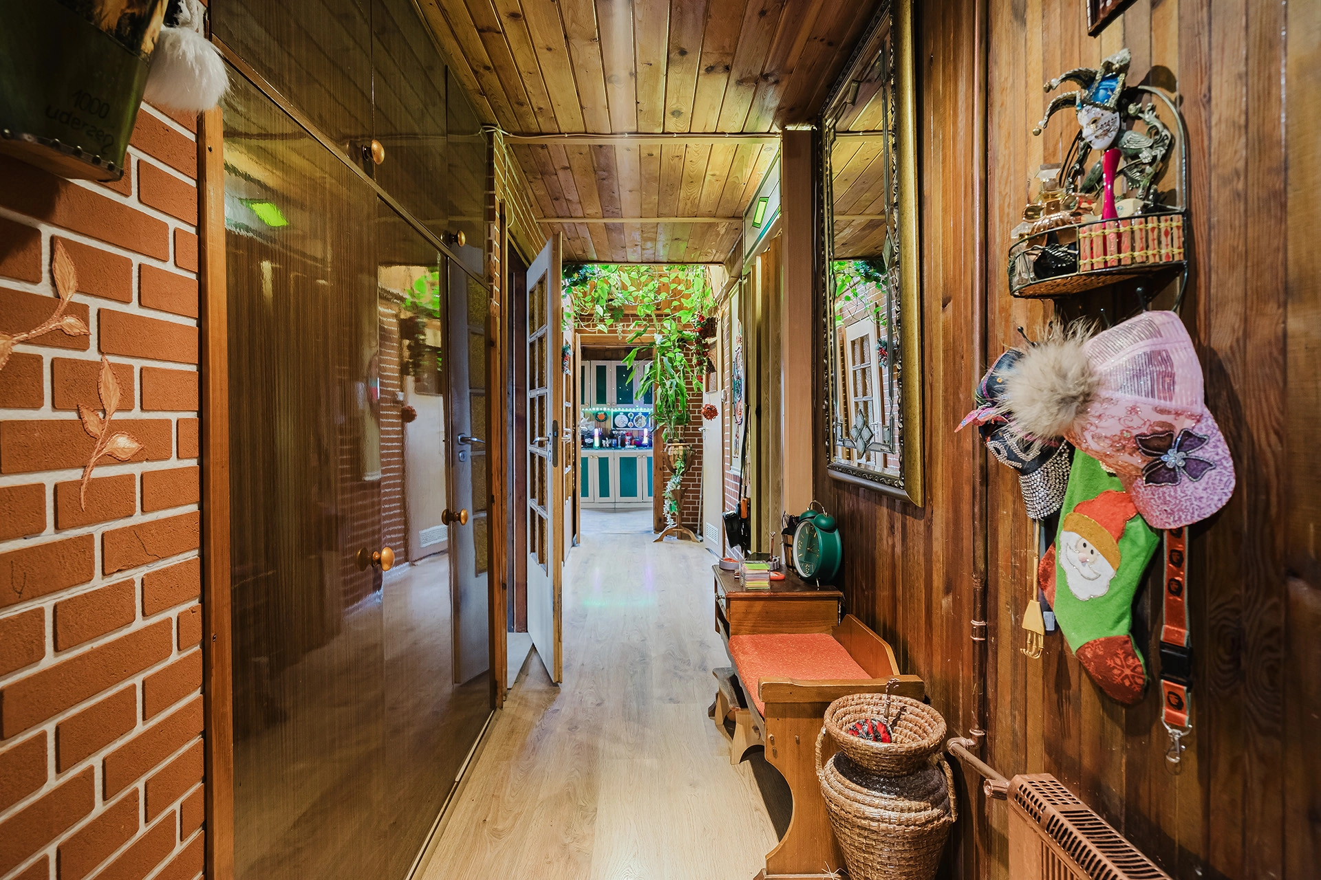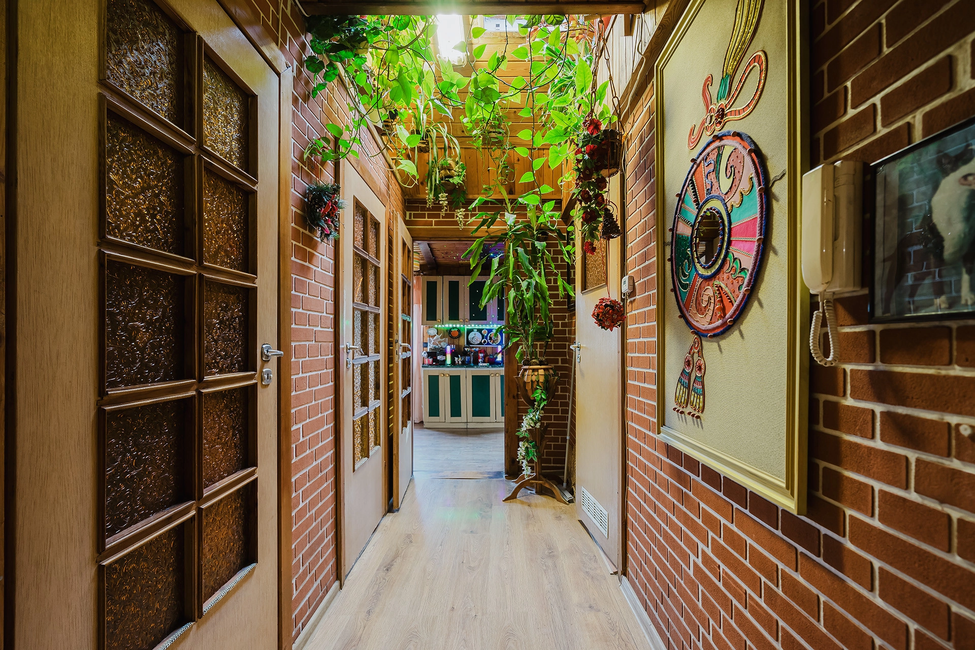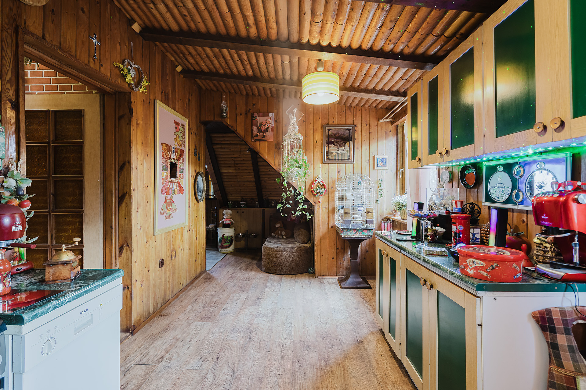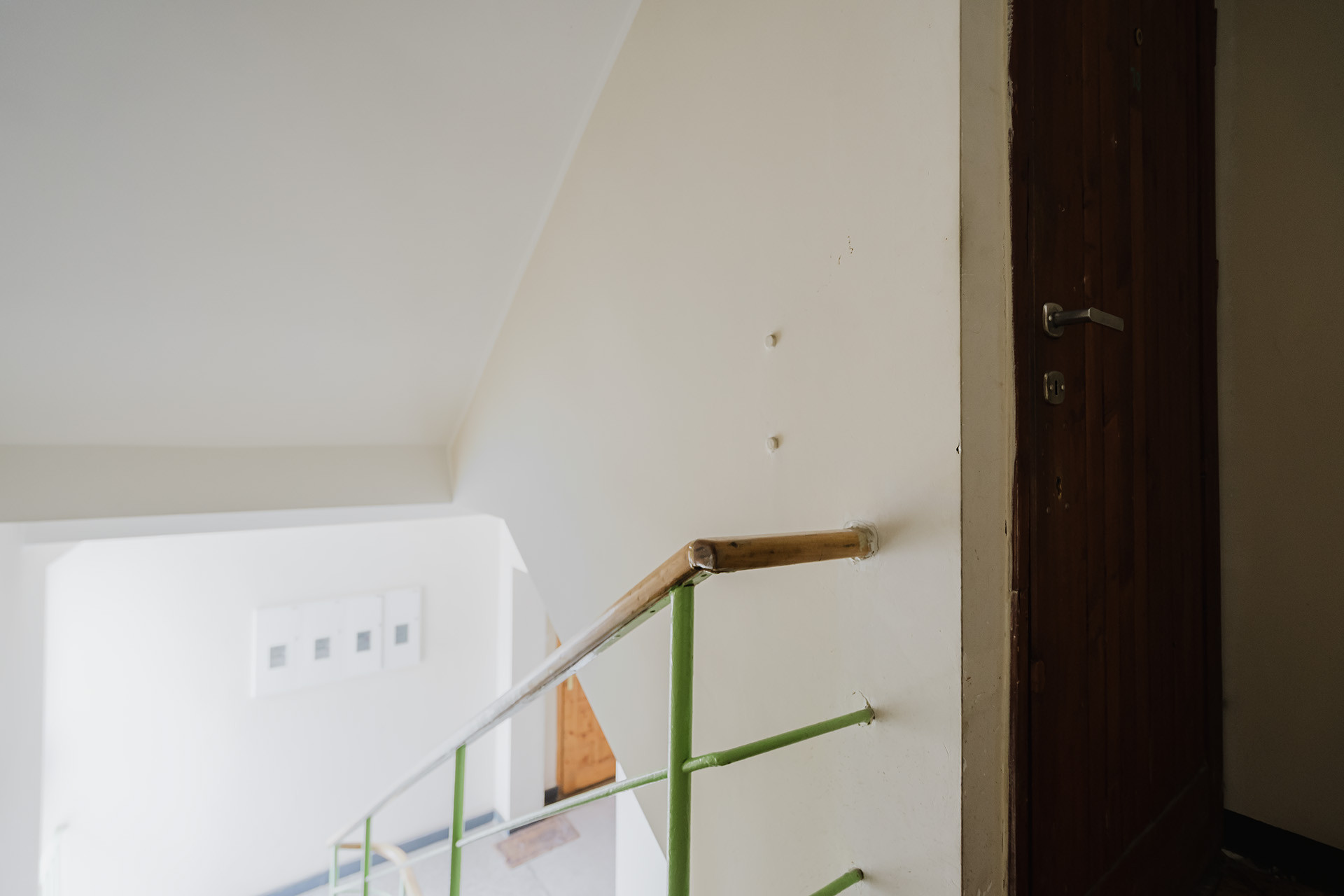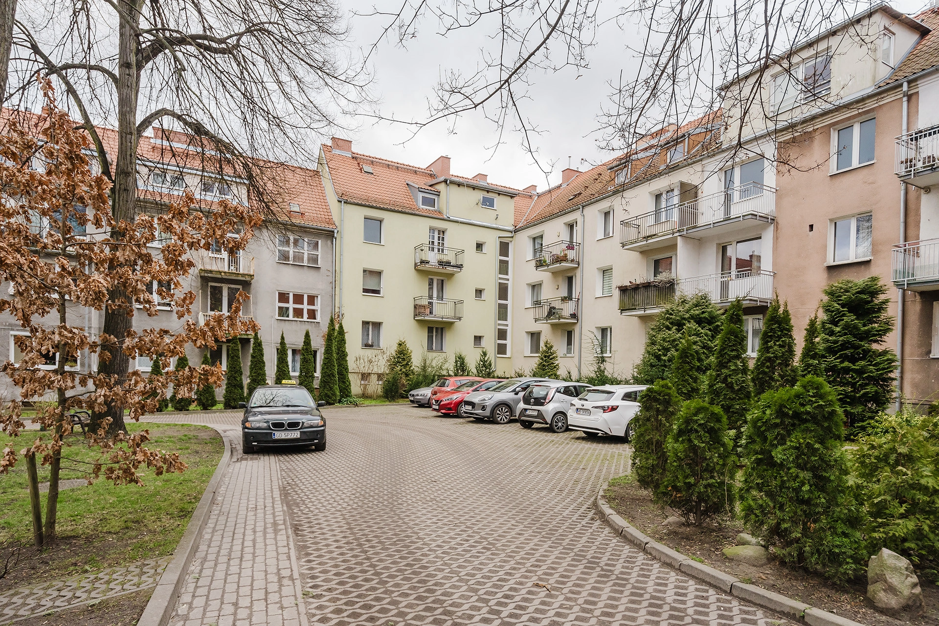 Od strony podwórka miejsca postojowe dla mieszkańców kamienicy. Ściany częściowo pokryte boazerią.