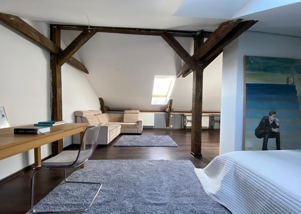 Na poddasze prowadzą drewniane schody, gdzie ukazuje się nam przestronny salon. Istnieje możliwość podziału tegoż salonu na dwa mniejsze pokoje. Na poddaszu znajduje się przegotowane oraz ocieplone pomieszczenie na drugą łazienkę.
