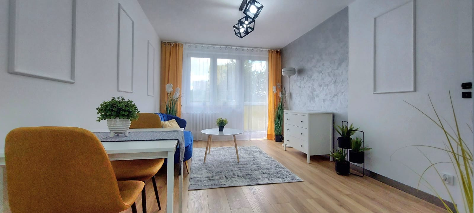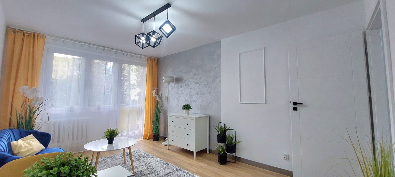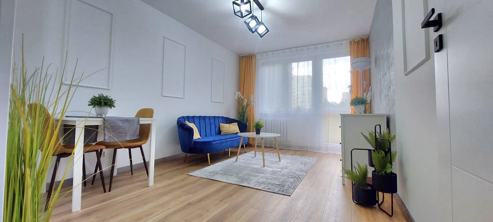 – salon z aneksem kuchennym i wyjściem na balkon,