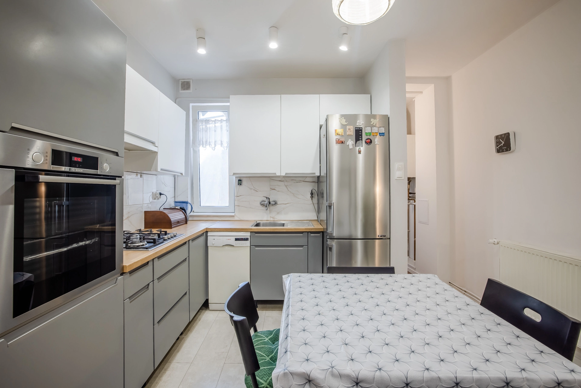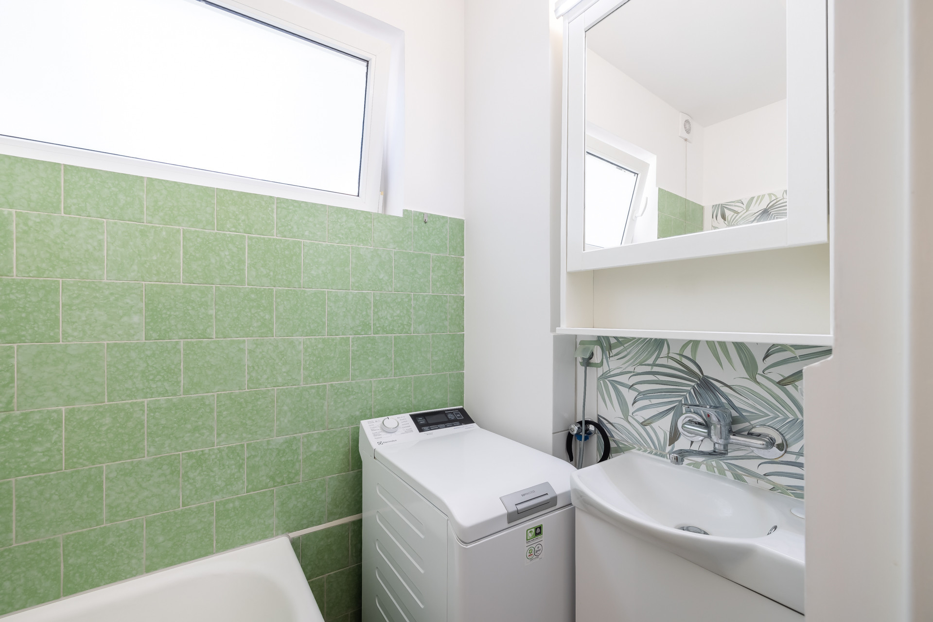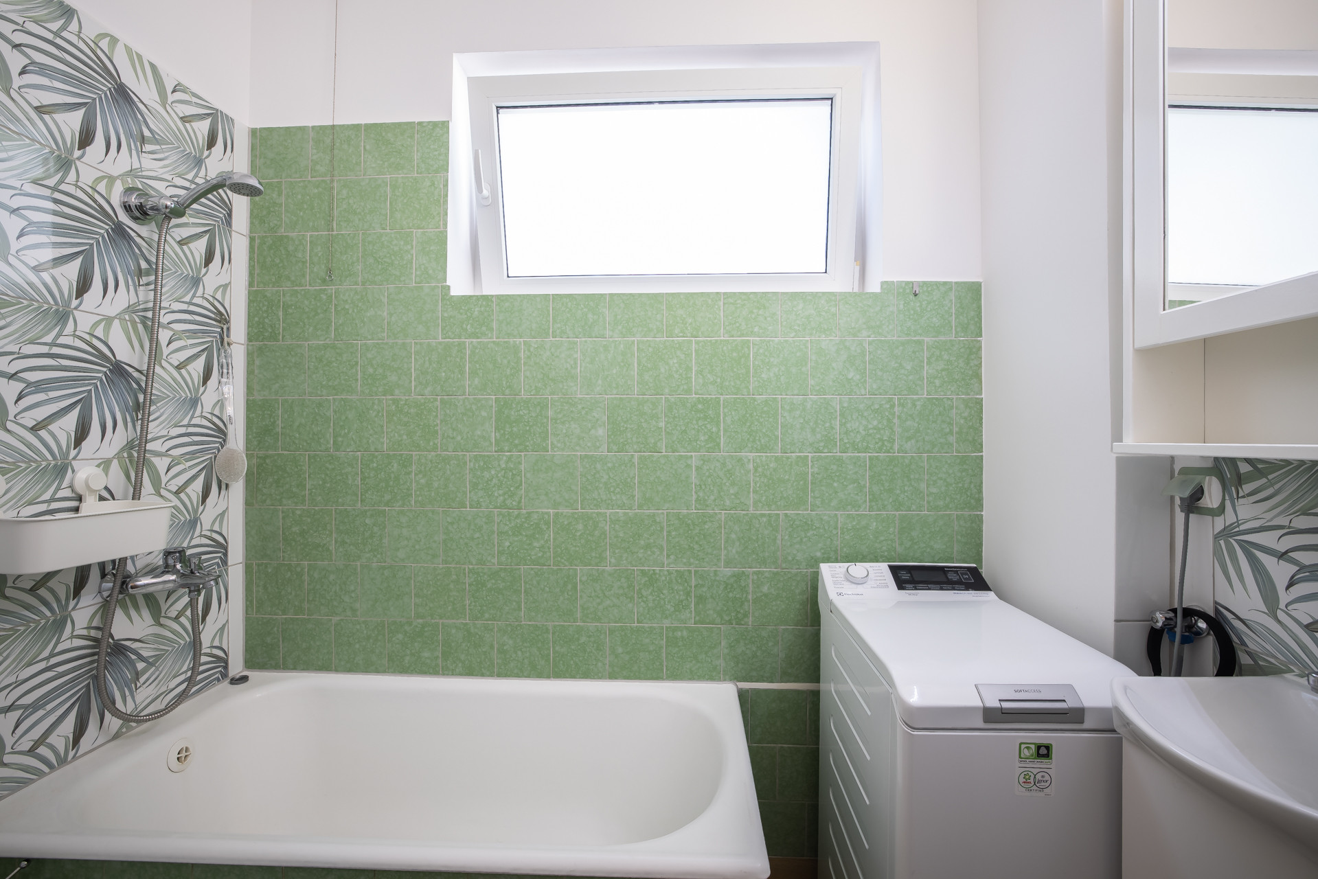 – łazienka (2,40 m2) z WC, wanną, pralką, umywalką i grzejnikiem i oknem