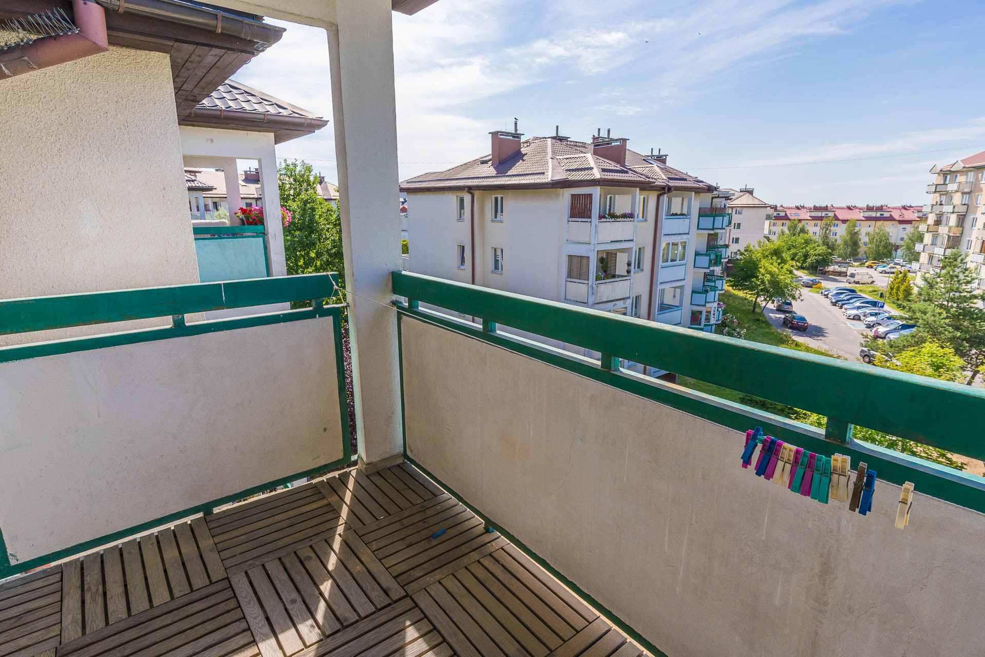 Balkon, od strony południowej pozwala na relaks po pracy, z otwartym widokiem na zieleń.