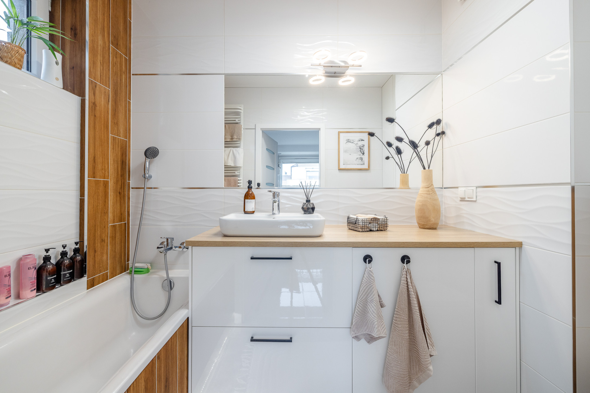 – łazienka z oknem, wanną, lustrem, grzejnikiem drabinkowym,