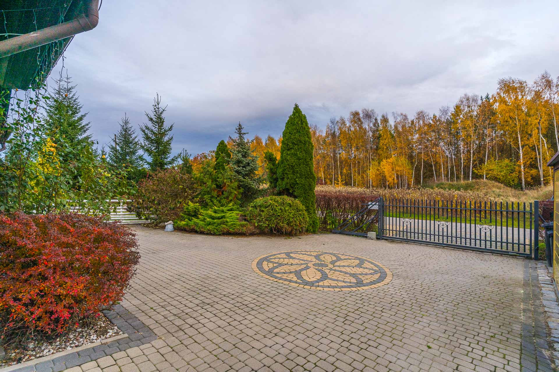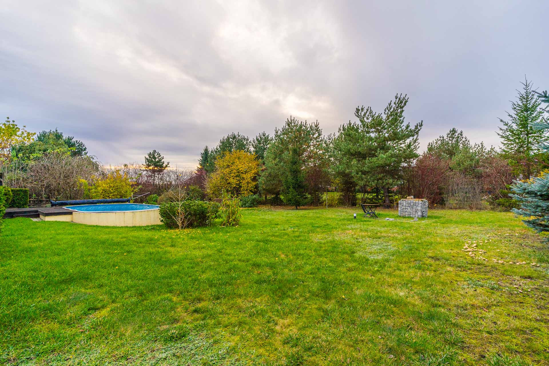 OGRÓD: Powierzchnia działki to ok. 1800 m2. W pięknym dużym ogrodzie znajduje się dużo zieleni. Znajdziemy tu liczne drzewa liściaste i iglaste, krzewy i kwiaty. Z tyłu domu znajduje się drewniany taras połączony z basenem.