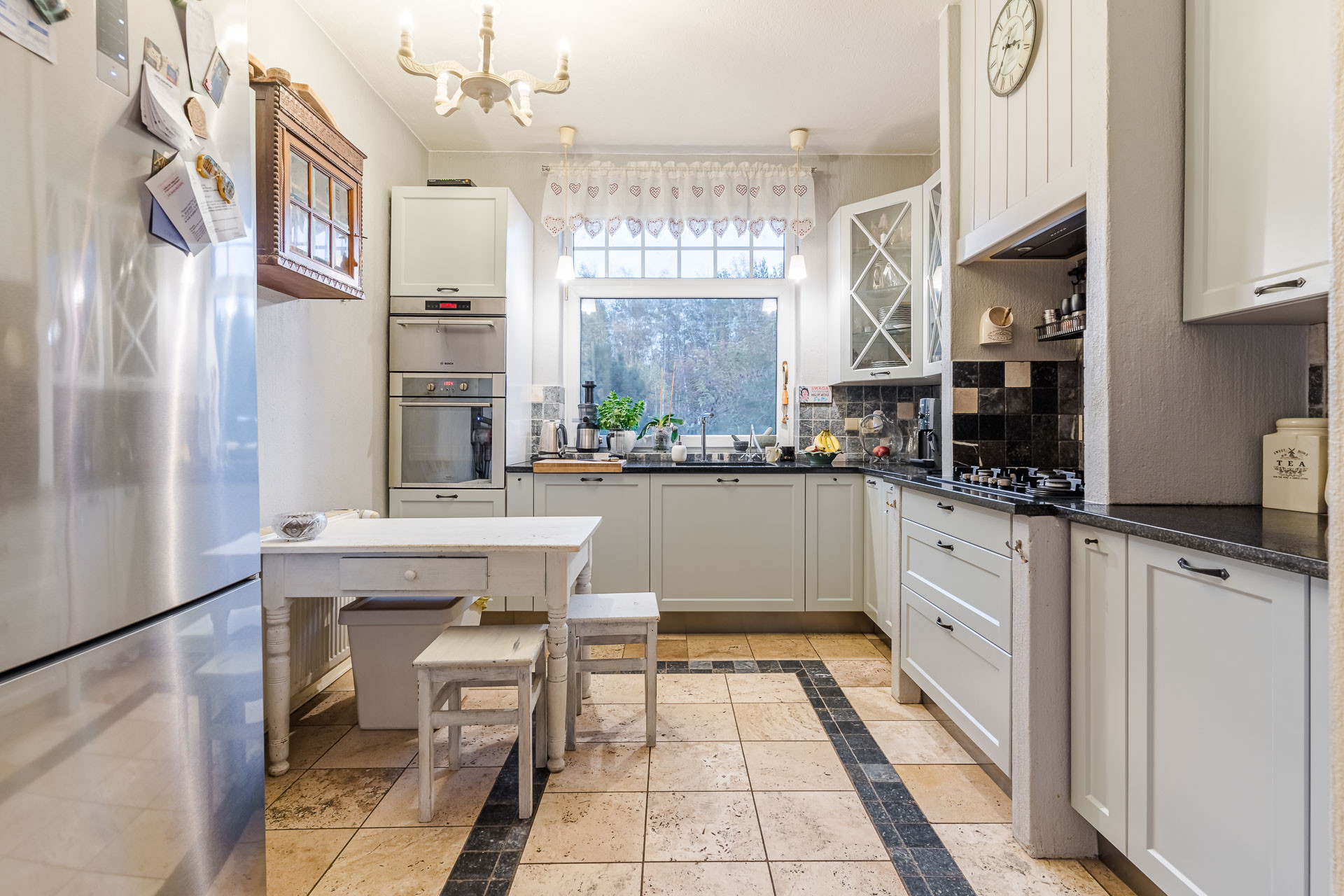 Blat kuchenny wykonany został z granitu, terakota ścienna z marmuru tureckiego, ten sam marmur został użyty do wykończenia łazienek.