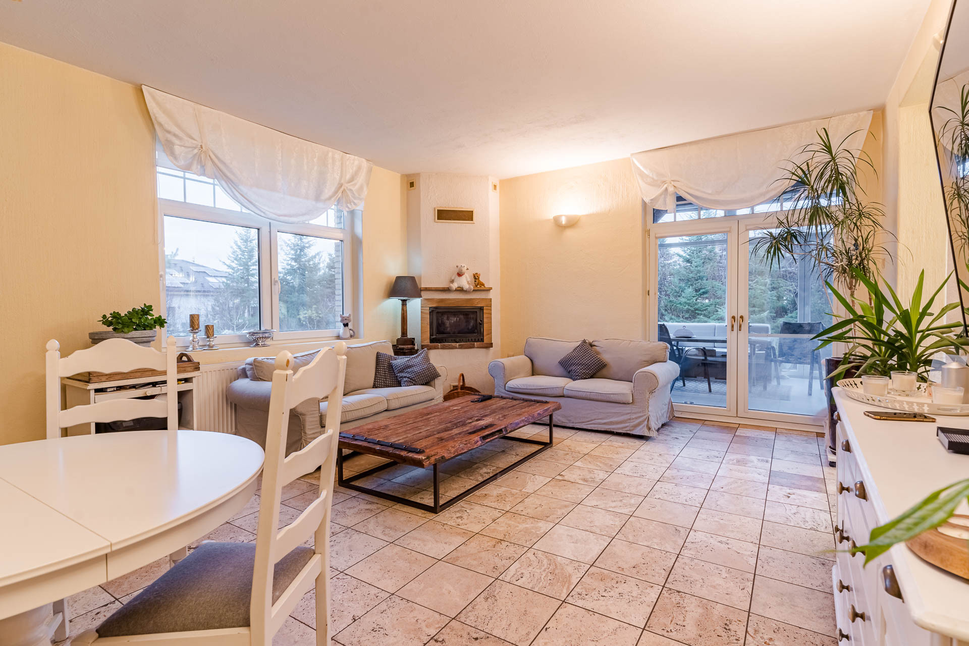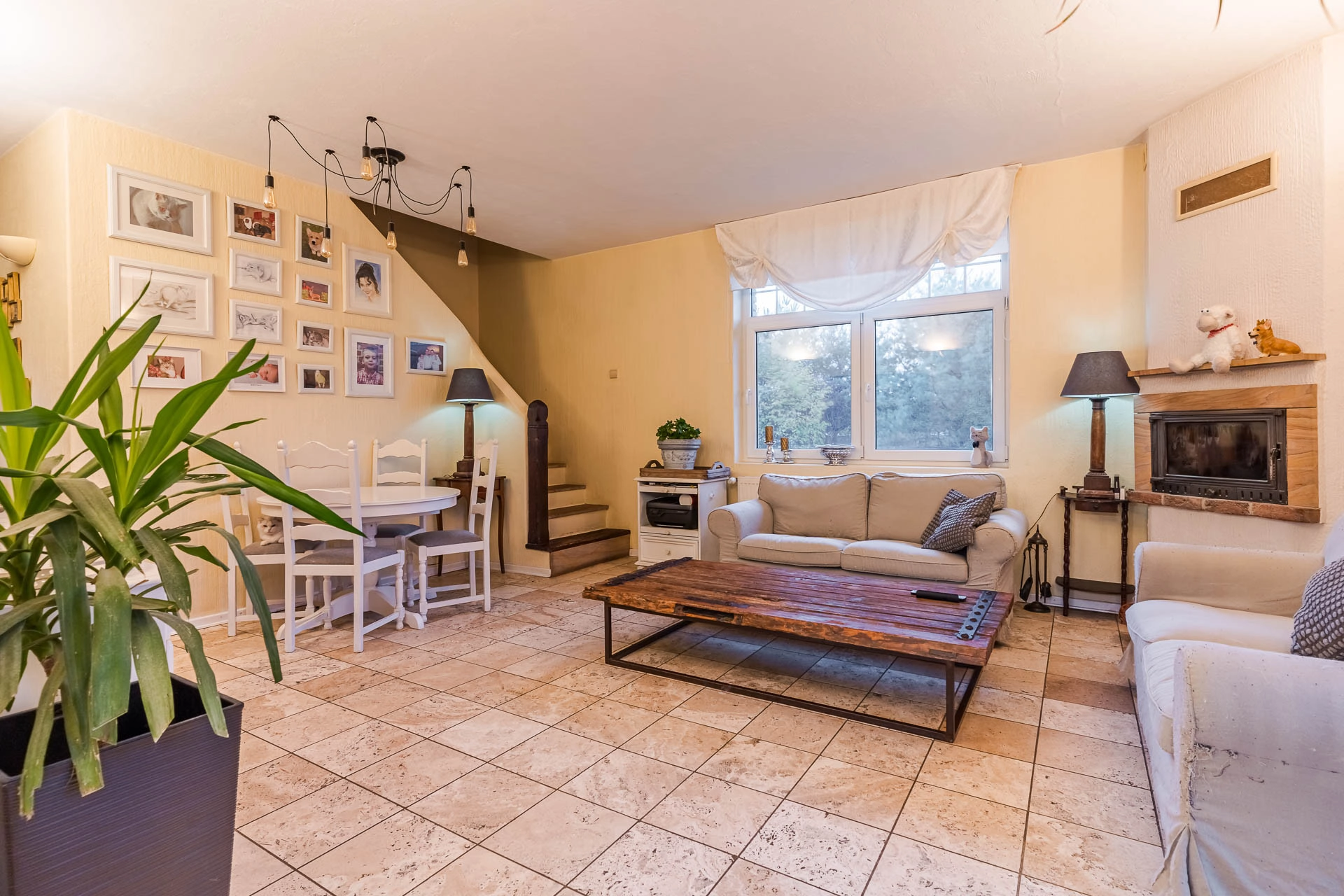 – wiatrołap prowadzący do przestronnego, jasnego salonu z kominkiem.