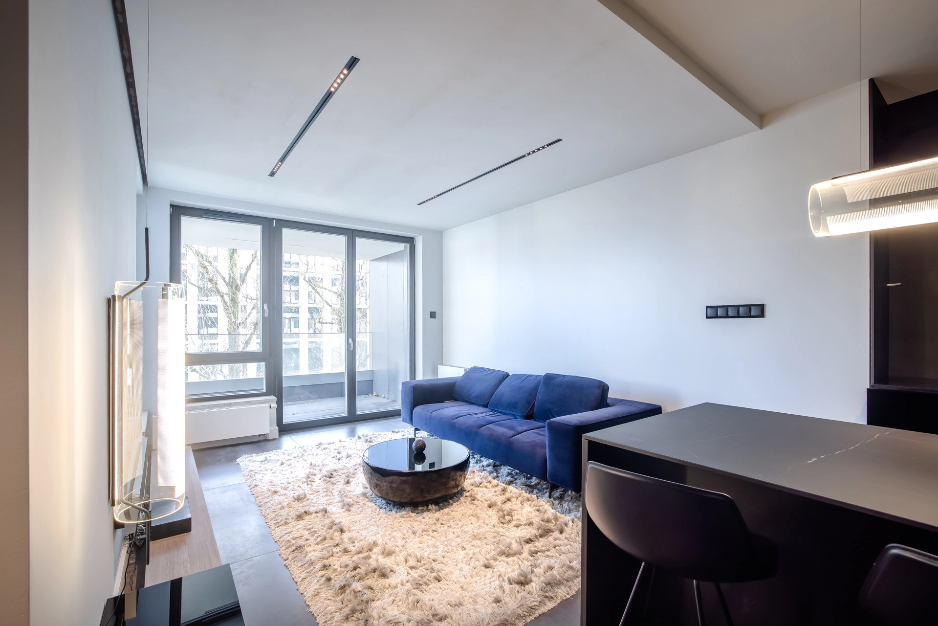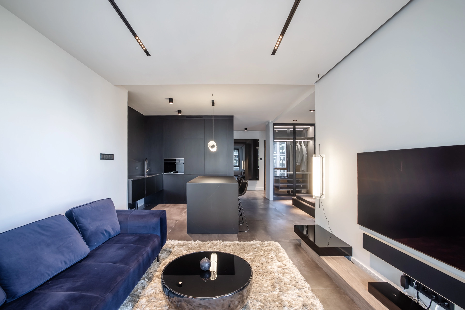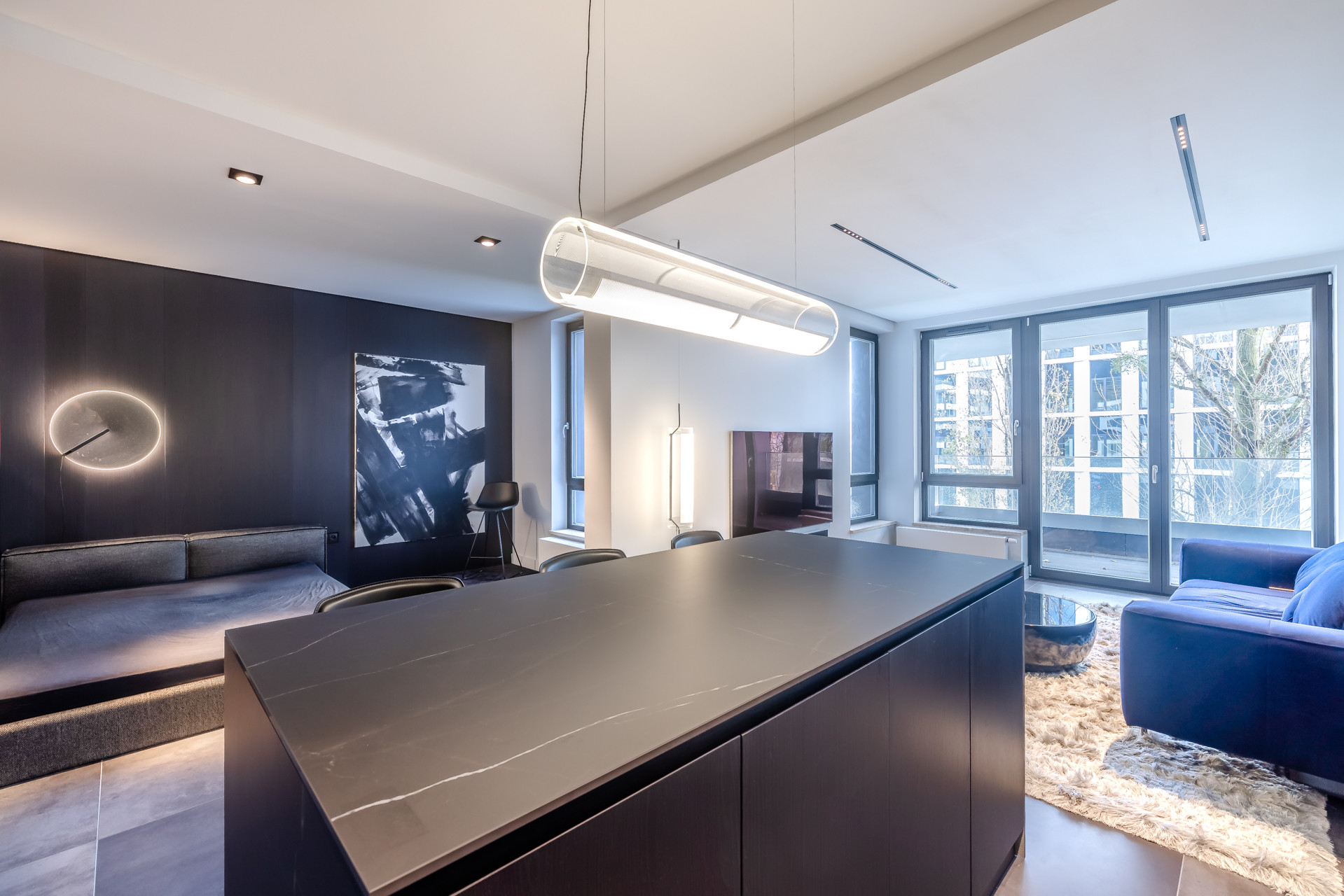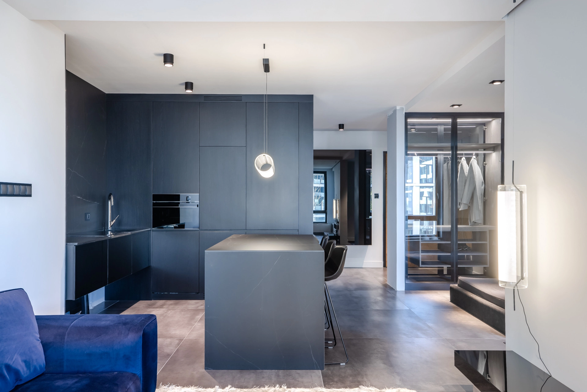 Mieszkanie zostało starannie wykończone, z pełnym naciskiem na detale oraz z wykorzystaniem materiałów najwyższej jakości. Projekt pochodzi od krakowskiego studia projektowego Ambience. Na podłodze zainstalowano włoskie płytki Mirage Lemmy Venom. W kuchni zastosowano wyspę z spieków kwarcowych, a zabudowa wysoka wykonana jest z forniru Alpi Flamed Black, natomiast szafki wiszące zdobi dymione szkło. Kuchnia została wyposażona w sprzęt marki Smeg. W łazience znajduje się armatura Dornbracht oraz deszczownica Steinberg Sensual Rain. Stolarka drzwiowa to dzieło firmy Barausse z użyciem klamki Olivari. Oświetlenie stanowią produkty firm Occhio, Kreon oraz Vibia Guise. W sypialni umieszczono przezroczystą szafę z dymionego szkła, a ściana w sypialni została wykończona tym samym naturalnym fornirem co kuchnia, przy czym na tle tejże ściany wisi duży, ręcznie malowany obraz.