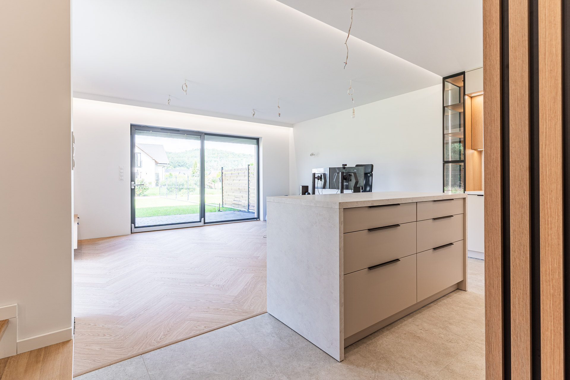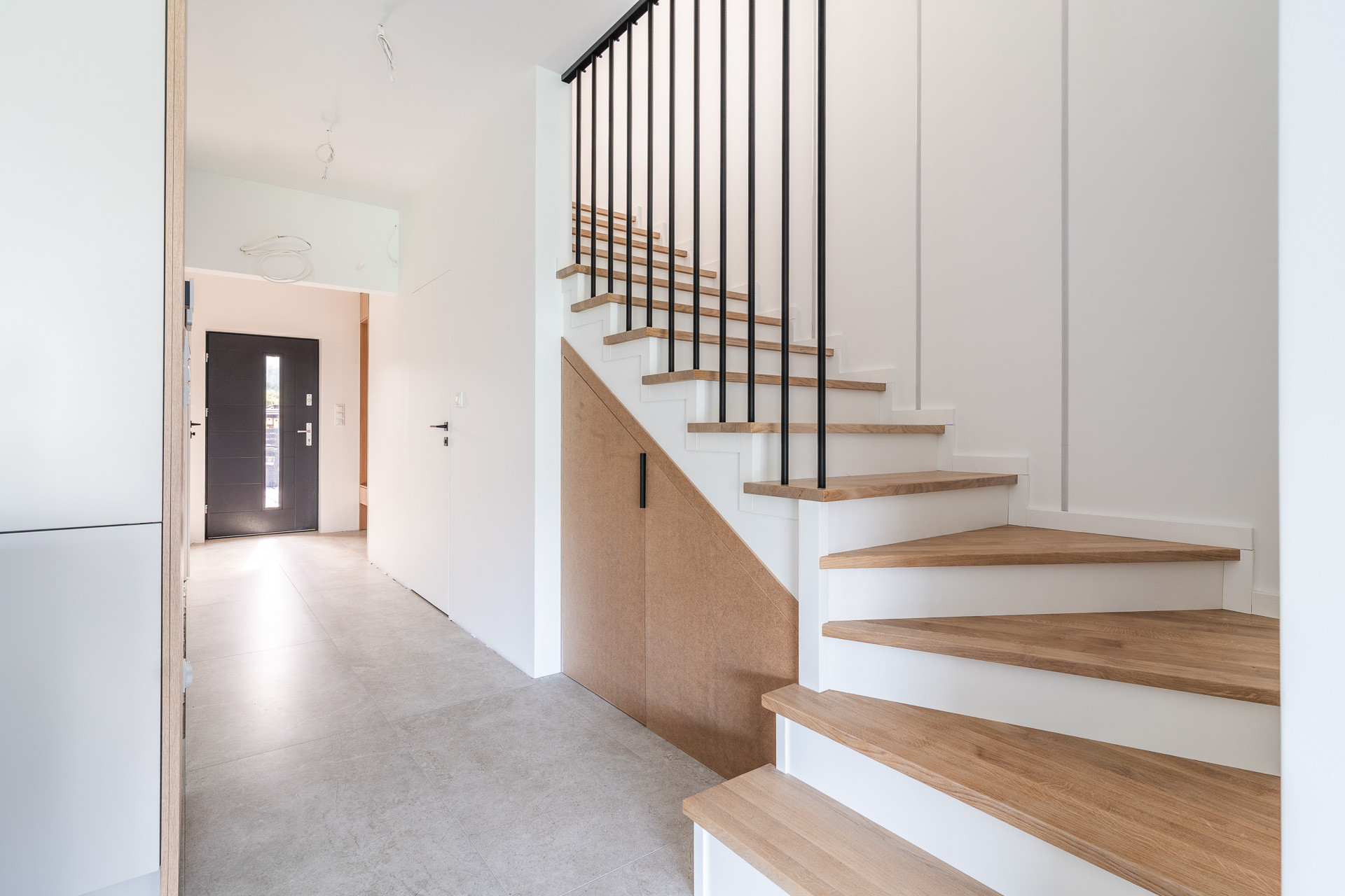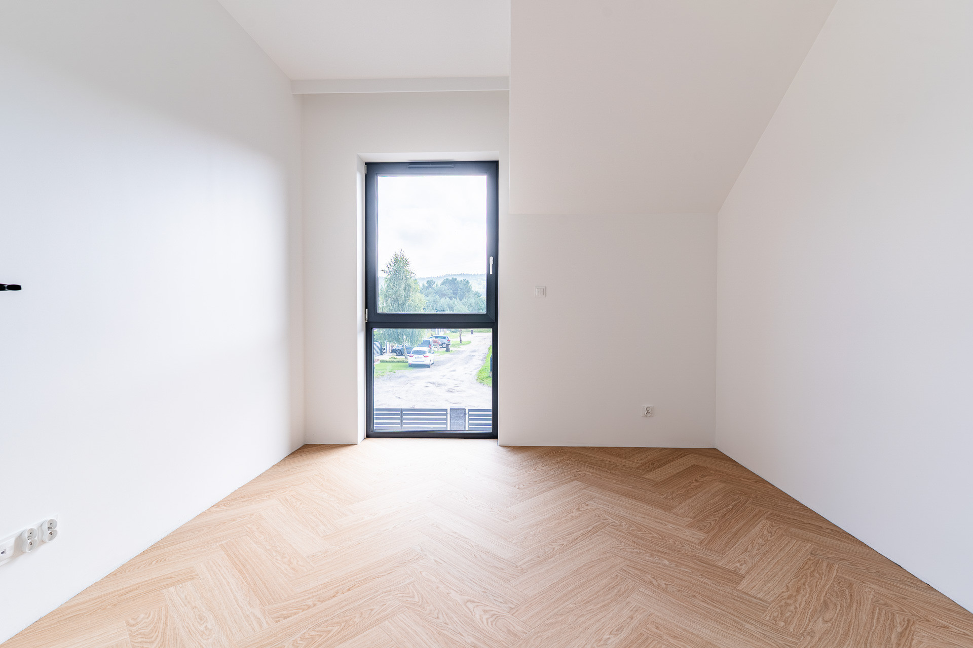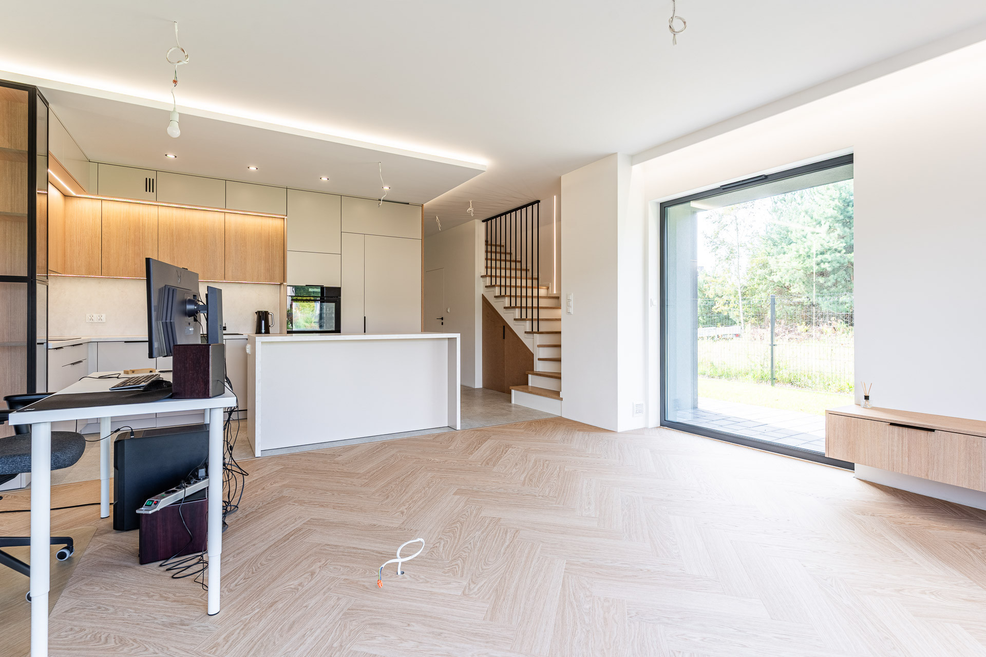 Dom wykończony został z użyciem wysokiej jakości materiałów i z dbałością o każdy detal – podłogi pokryto panelami winylowymi Quick-Step, eleganckie dębowe schody prowadzą na piętro, a liczne zabudowy stolarskie na wymiar oraz podświetlana garderoba dodają wnętrzom funkcjonalności i stylu. Łazienki wyposażono w ceramikę ROCA oraz armaturę Omnires, a komfort życia podnosi niezależne sterowanie temperaturą w każdym pomieszczeniu oraz system filtrowania i zmiękczania wody. W kuchni znajduje się nowoczesne AGD (lodówka, piekarnik, mikrofalówka, zmywarka i płyta indukcyjna), z którego część nie była jeszcze używana.