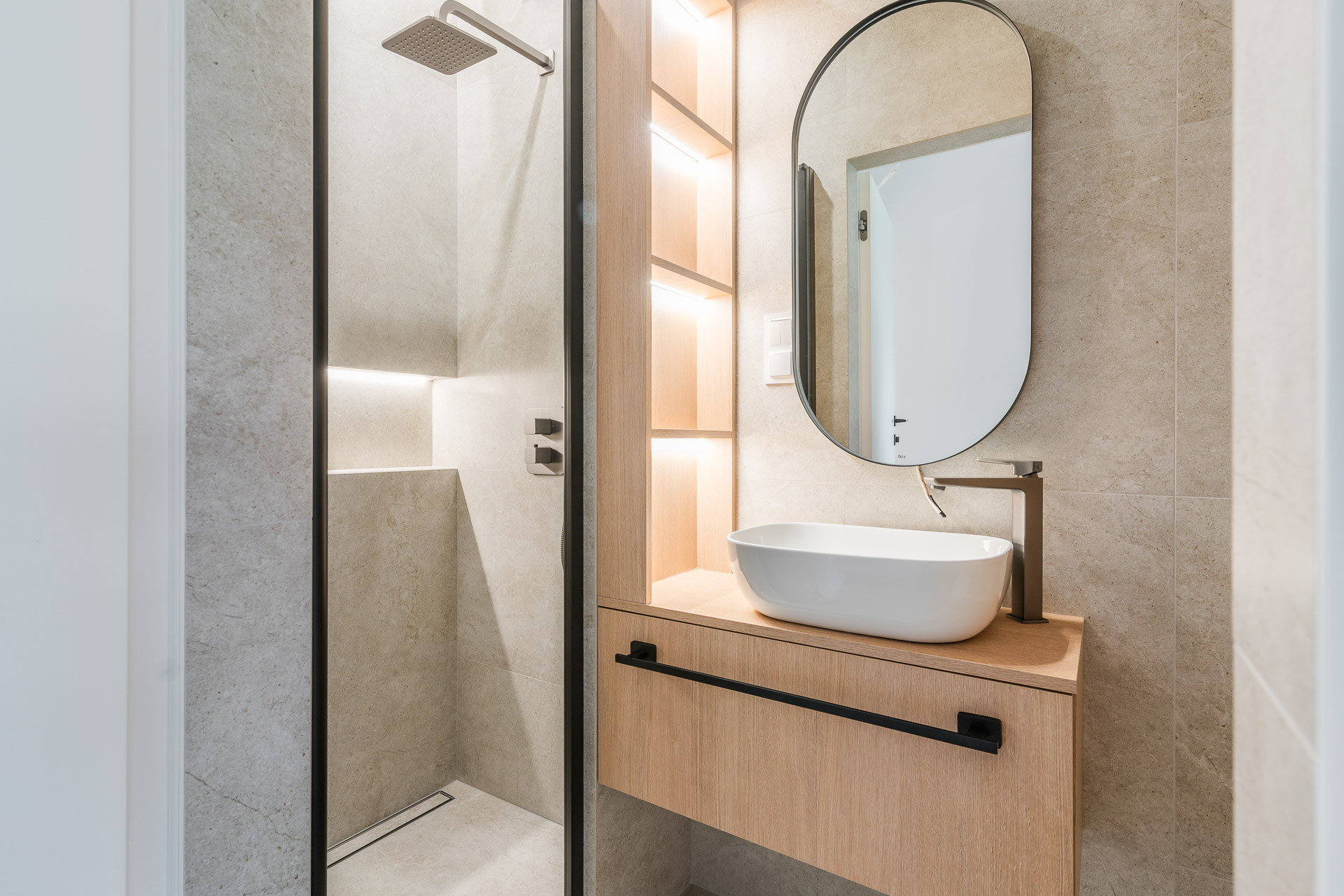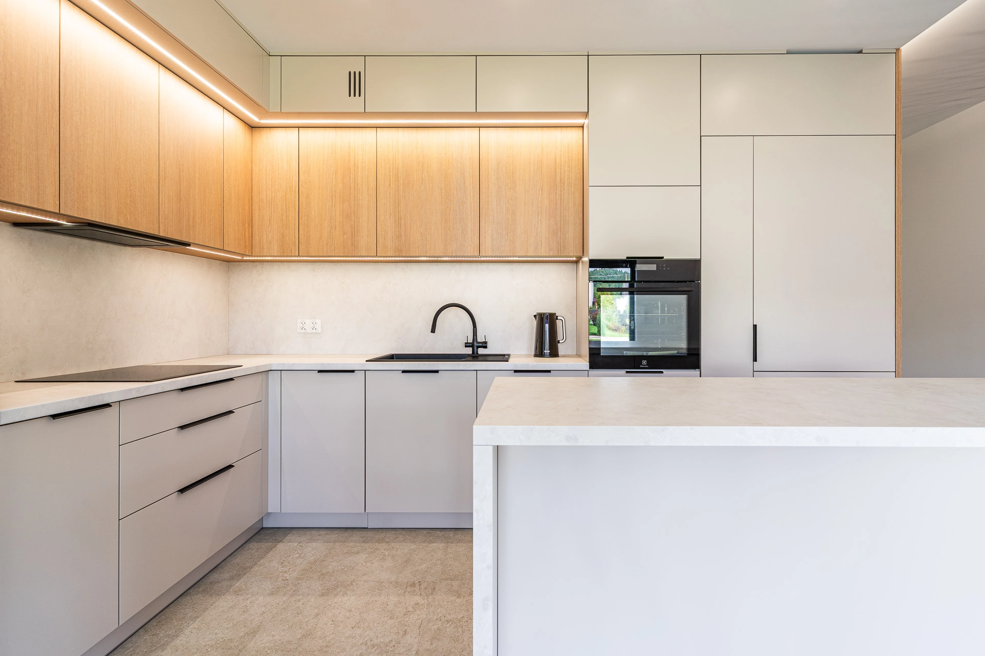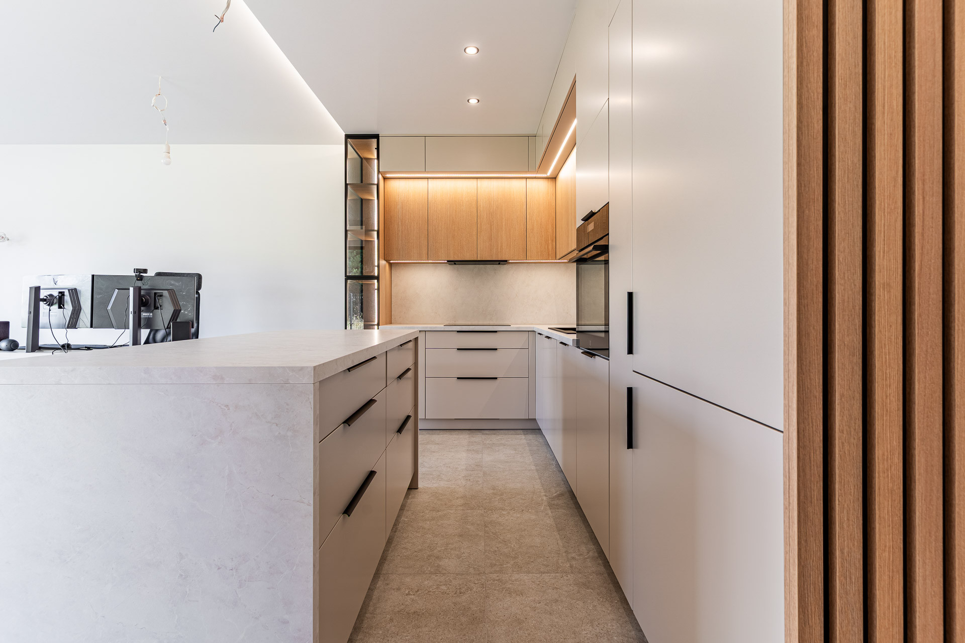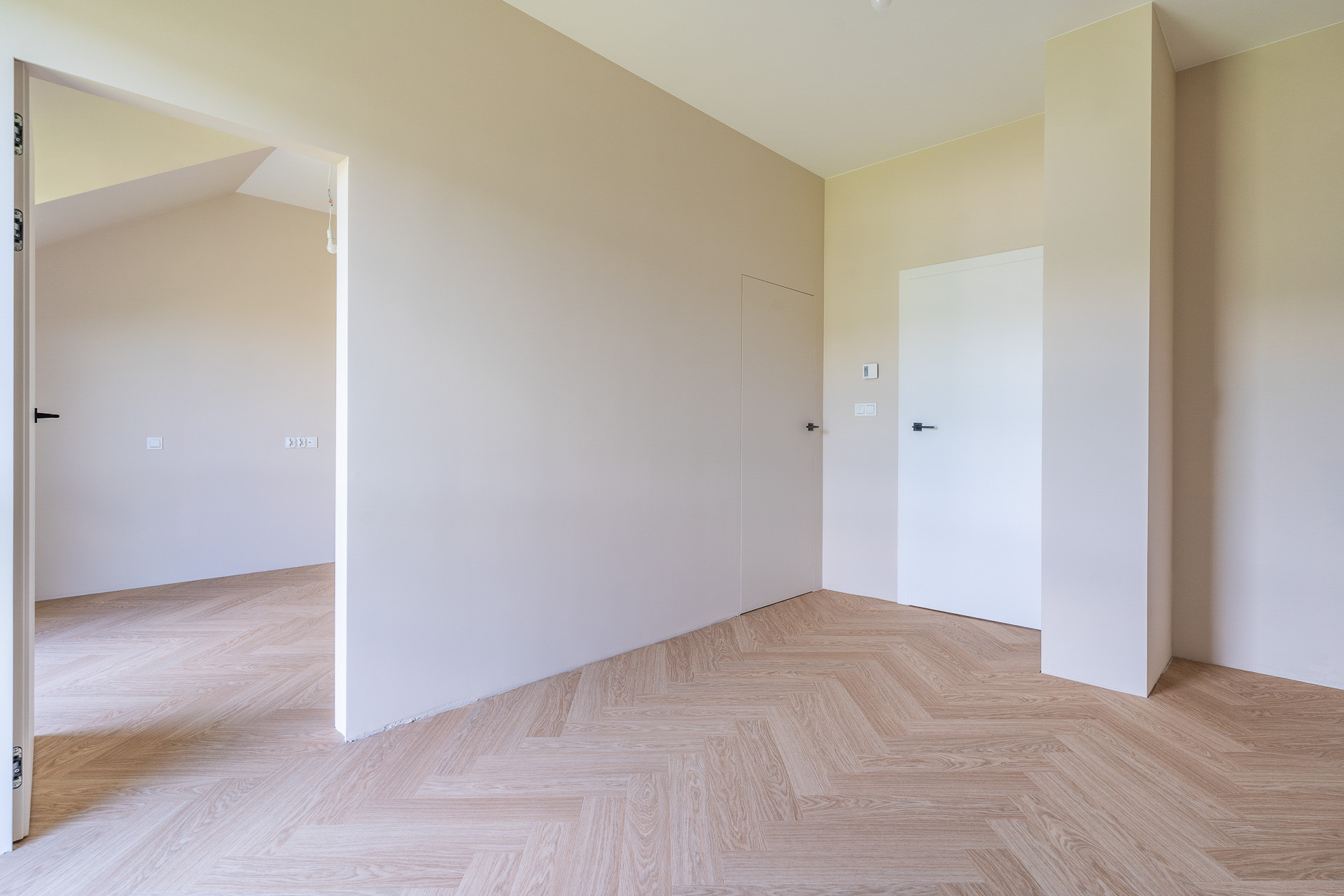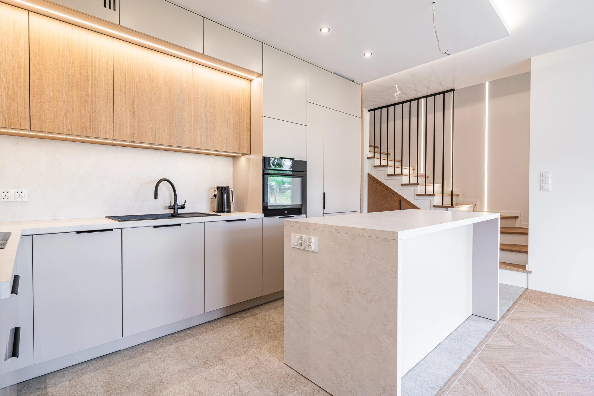 Dom wykończony został z użyciem wysokiej jakości materiałów i z dbałością o każdy detal – podłogi pokryto panelami winylowymi Quick-Step, eleganckie dębowe schody prowadzą na piętro, a liczne zabudowy stolarskie na wymiar oraz podświetlana garderoba dodają wnętrzom funkcjonalności i stylu. Łazienki wyposażono w ceramikę ROCA oraz armaturę Omnires, a komfort życia podnosi niezależne sterowanie temperaturą w każdym pomieszczeniu oraz system filtrowania i zmiękczania wody. W kuchni znajduje się nowoczesne AGD (lodówka, piekarnik, mikrofalówka, zmywarka i płyta indukcyjna), z którego część nie była jeszcze używana.