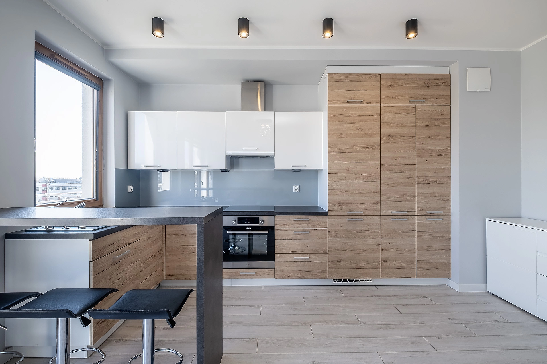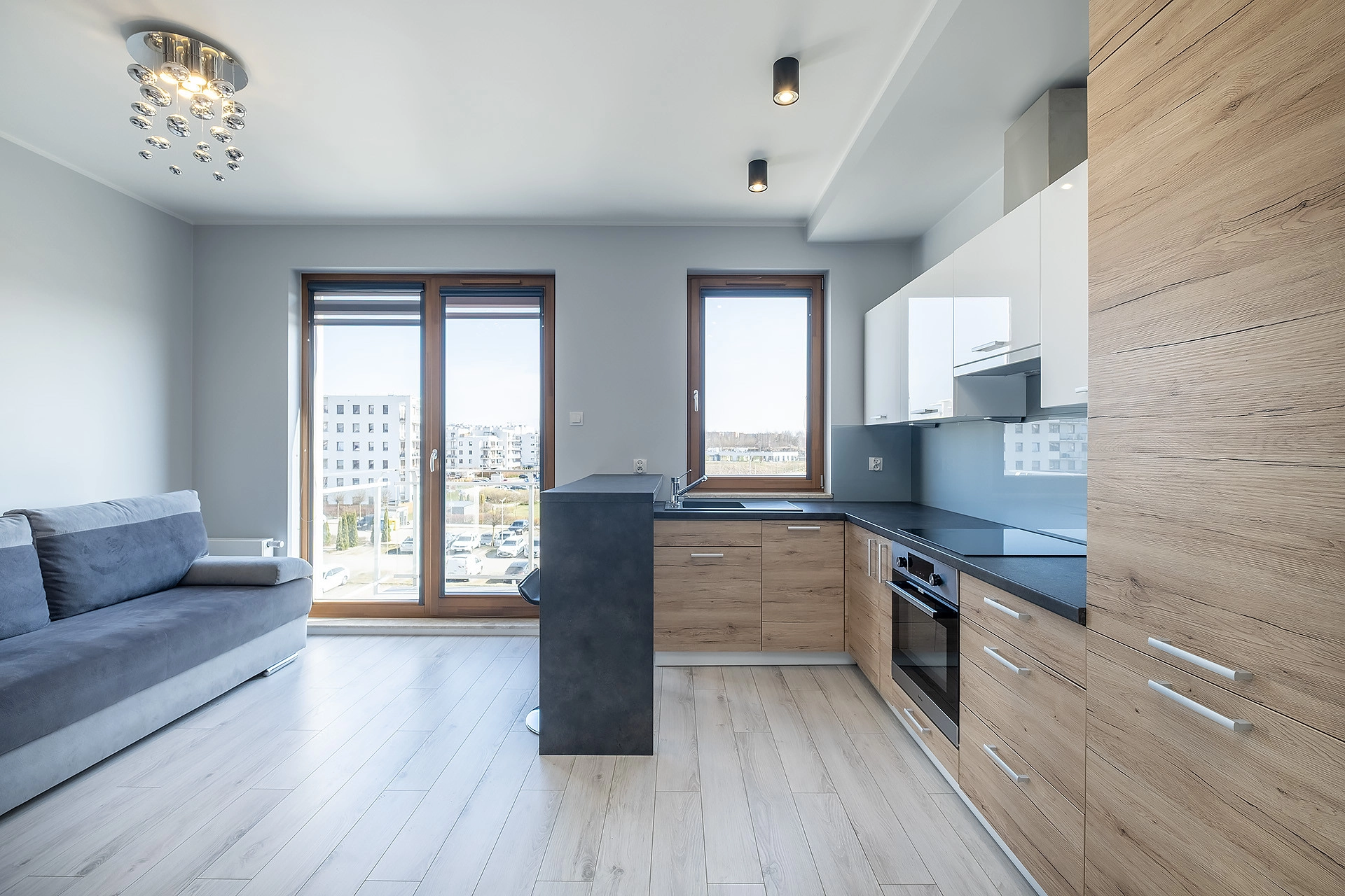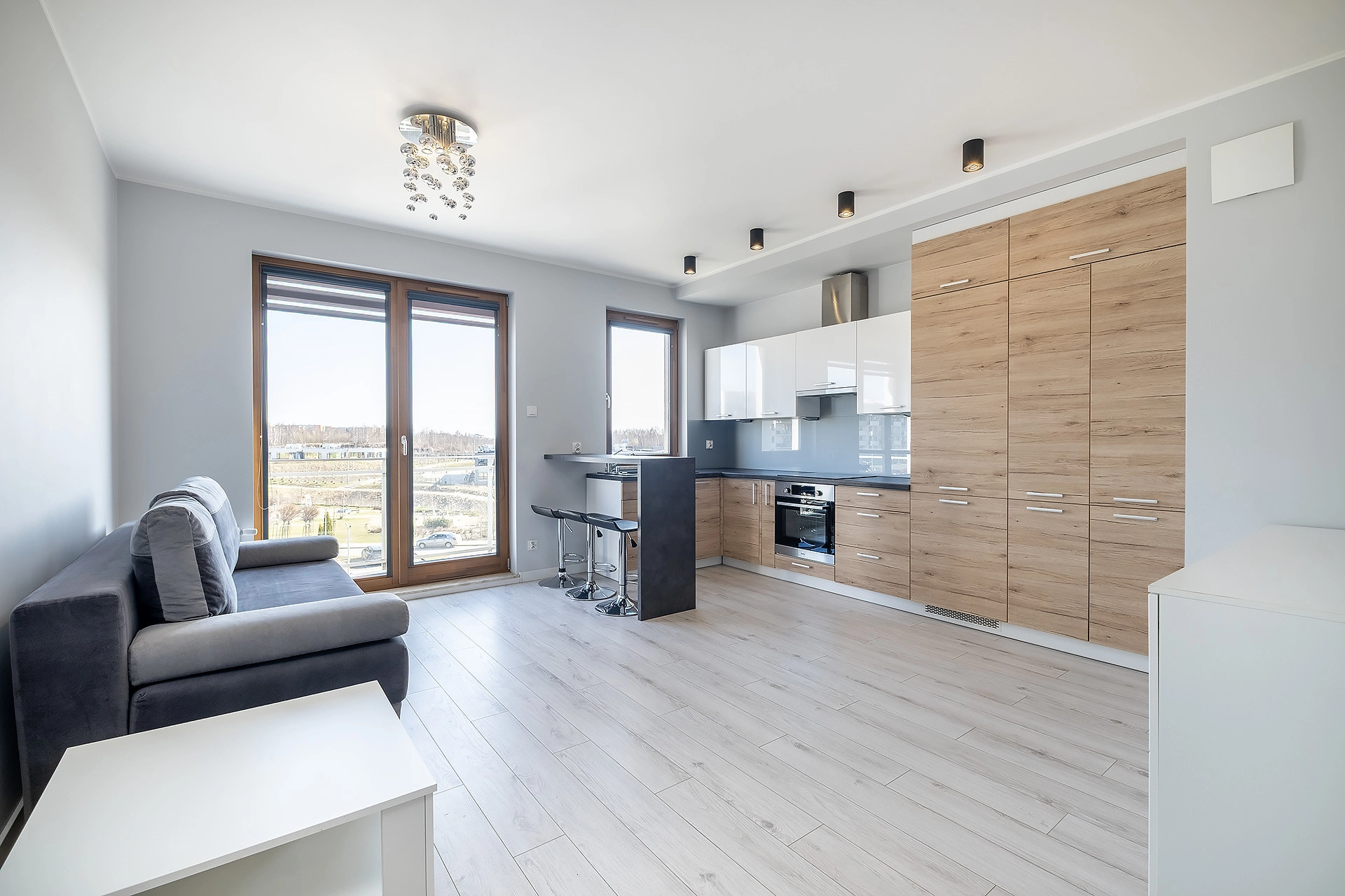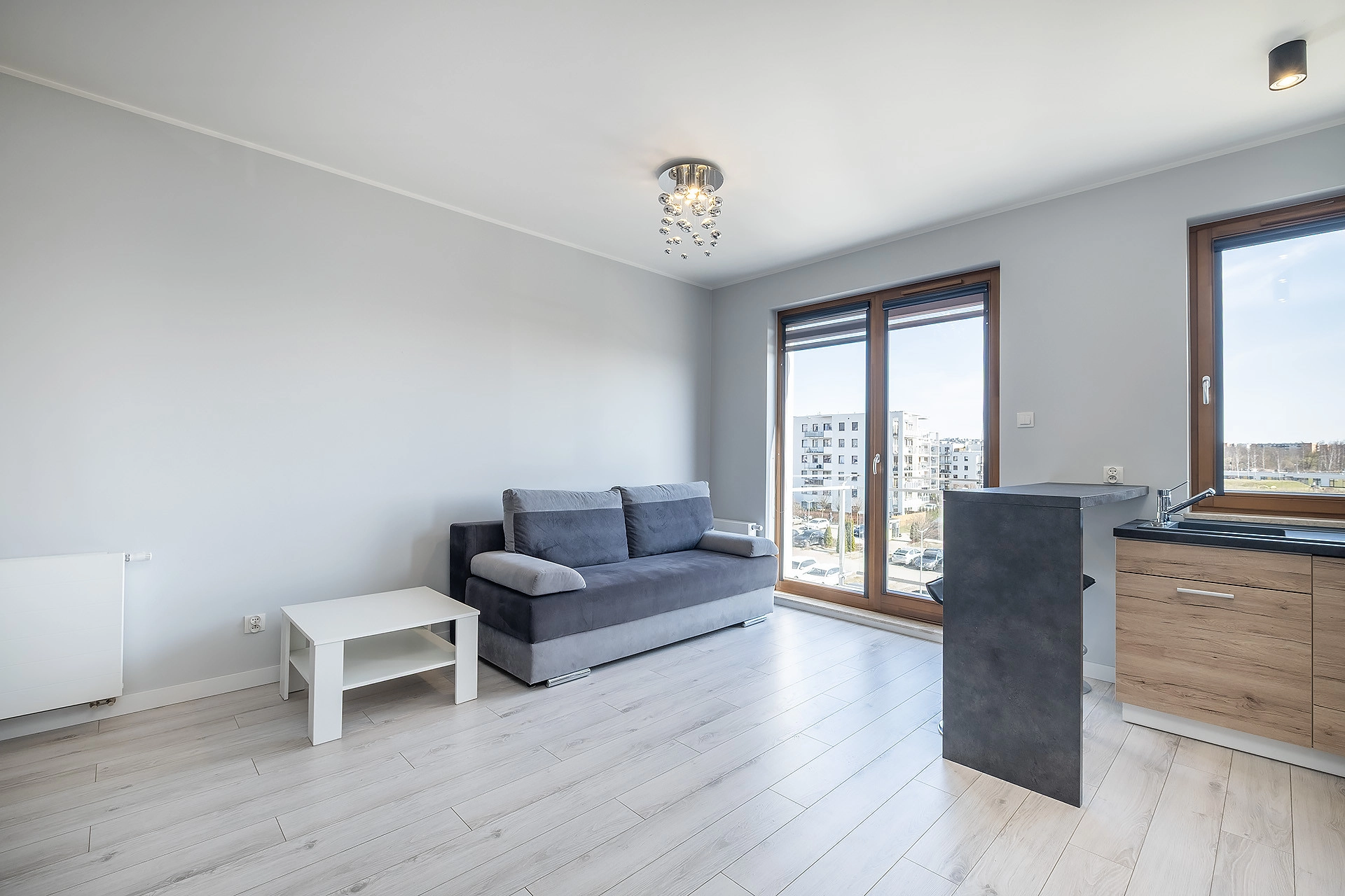 Dzięki dużym przeszkleniom mieszkanie pozostaje jasne i komfortowe przez cały dzień.