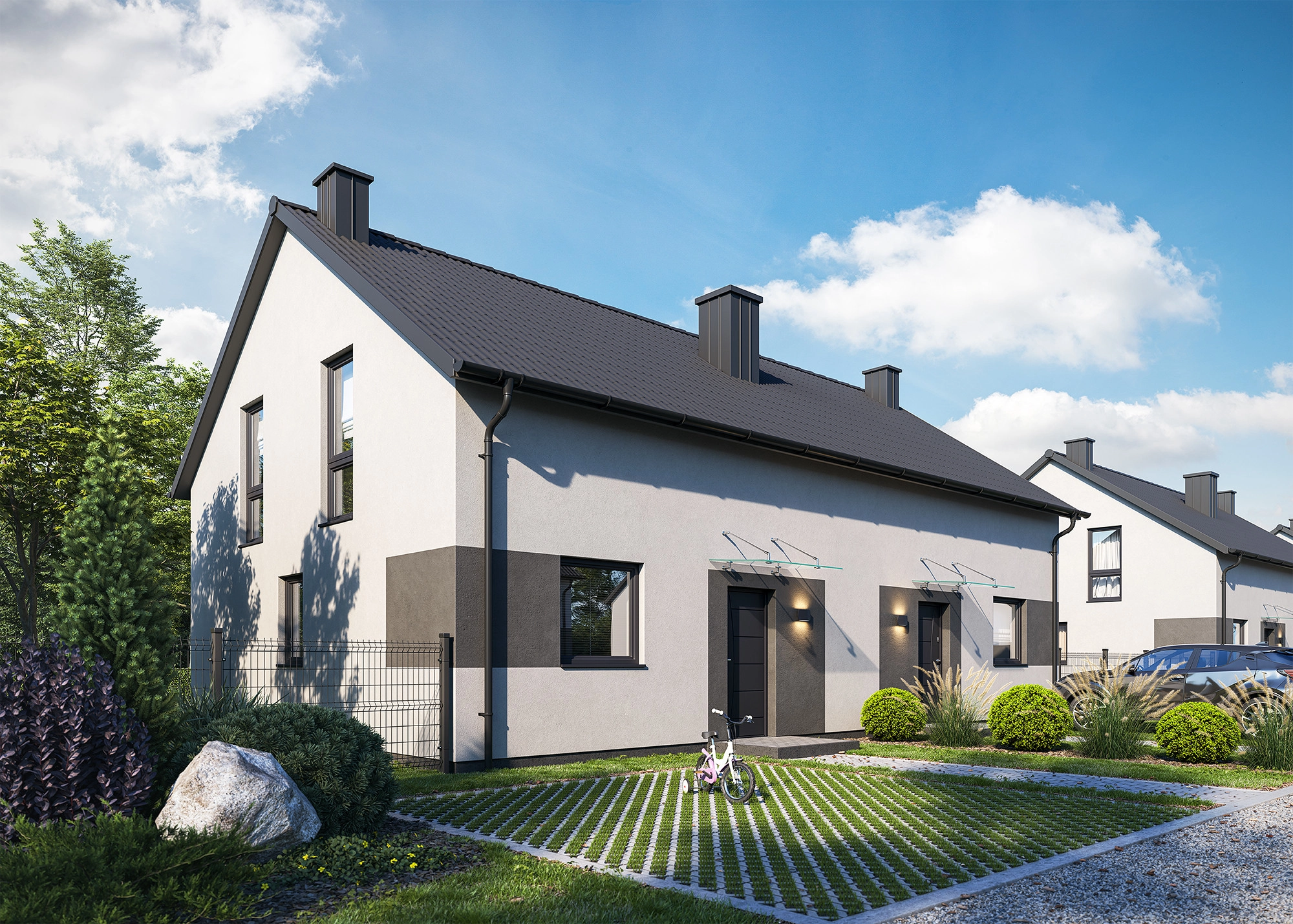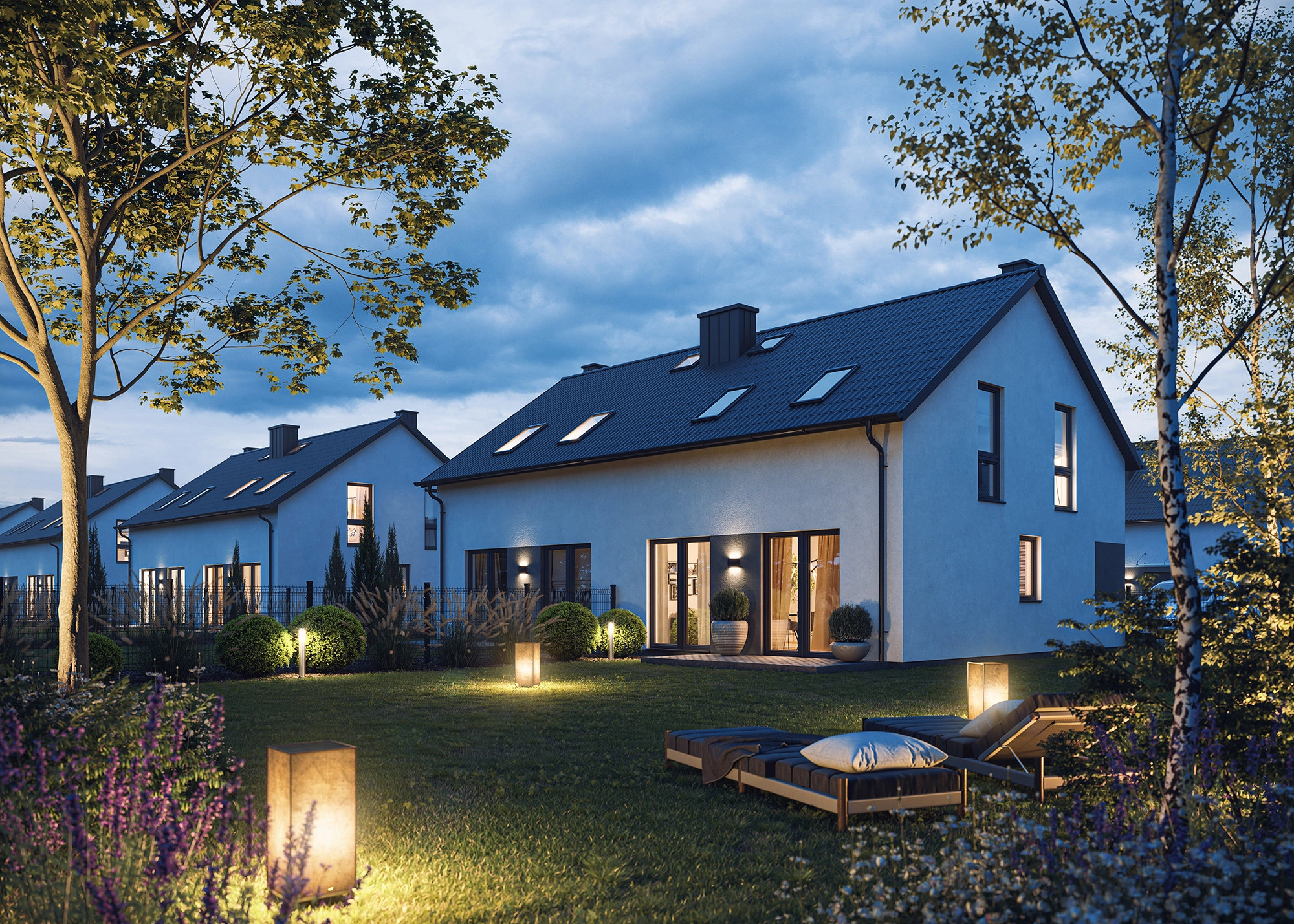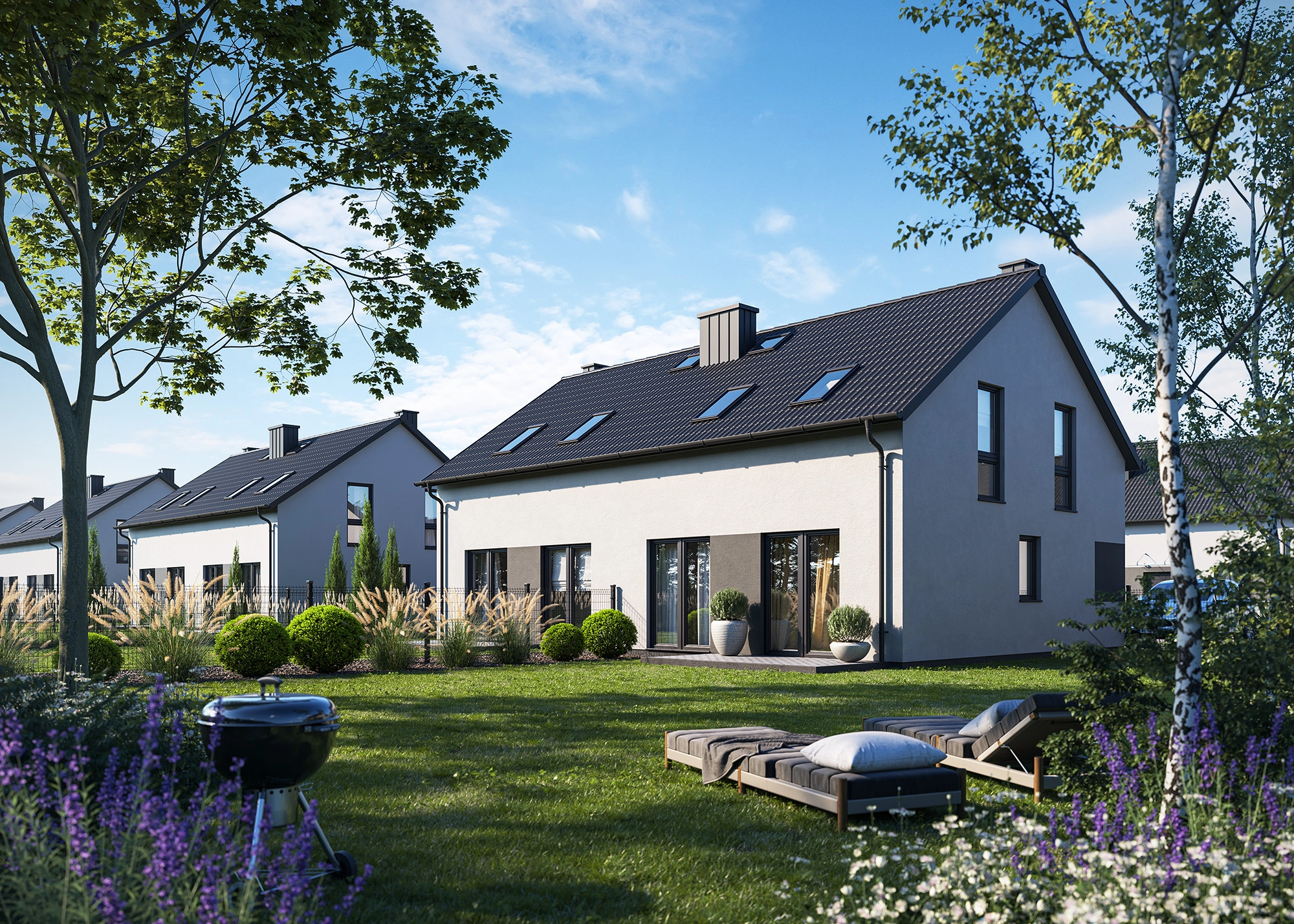 Domy zaprojektowano w taki sposób, aby na parterze powstała otwarta strefa dzienna z gabinetem i toaletą, na górze znajdziemy 2 lub 3 sypialnie z przestronną łazienką. Przed każdym budynkiem zaprojektowano podjazd/parking na 2 samochody, a za budynkiem ogród. Działki o wielkości ok. 450 m2 dają poczucie przestrzeni, umożliwiają rekreację, odpoczynek, miejsce do eksperymentów ogrodniczych.