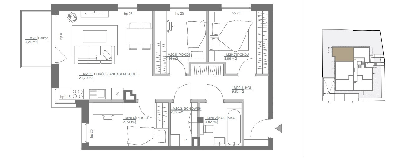 – Salon z aneksem kuchennym 21,70m2