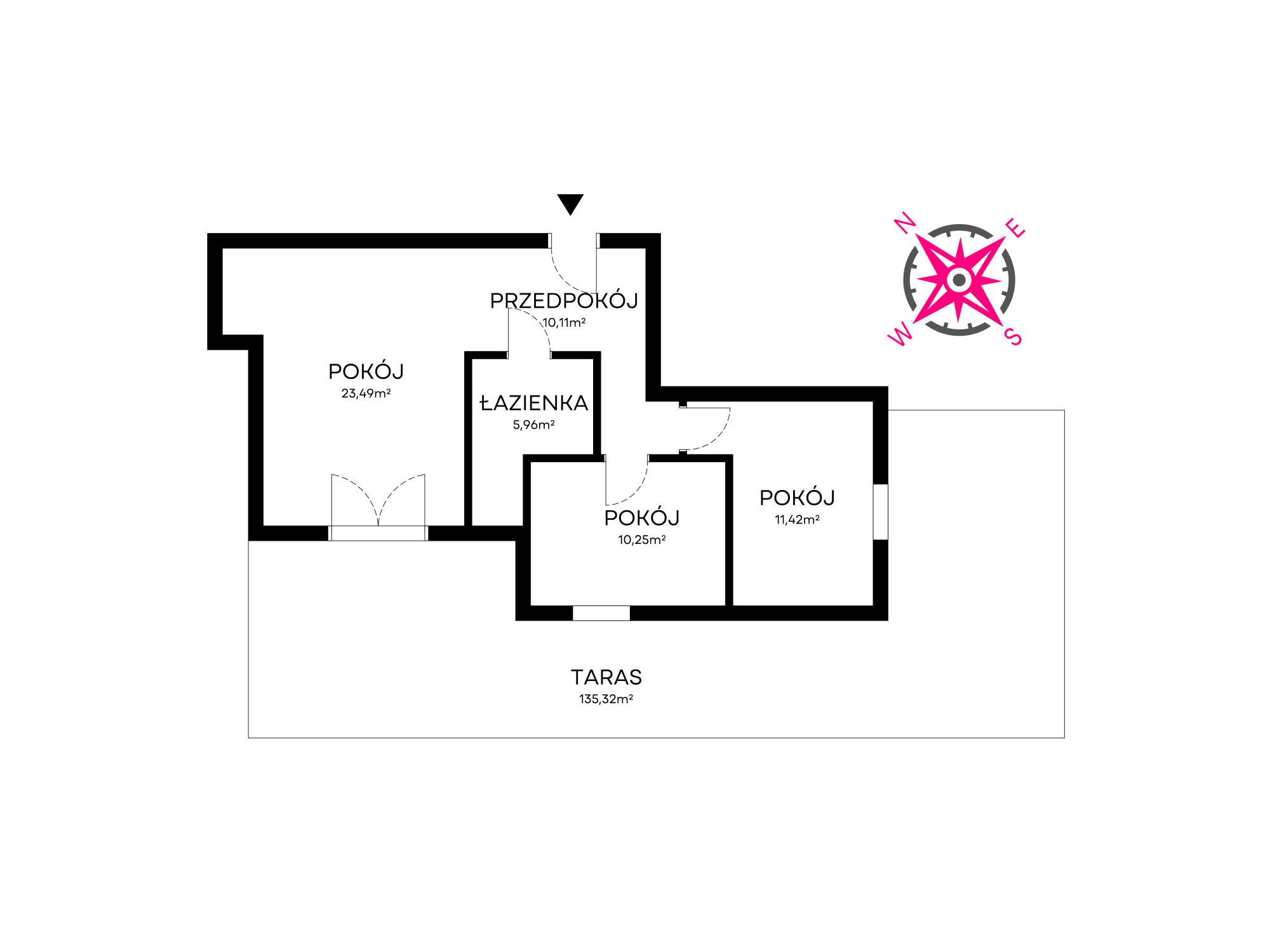 – salonu z kuchnią 23,49m² z wyjściem na taras 135m²