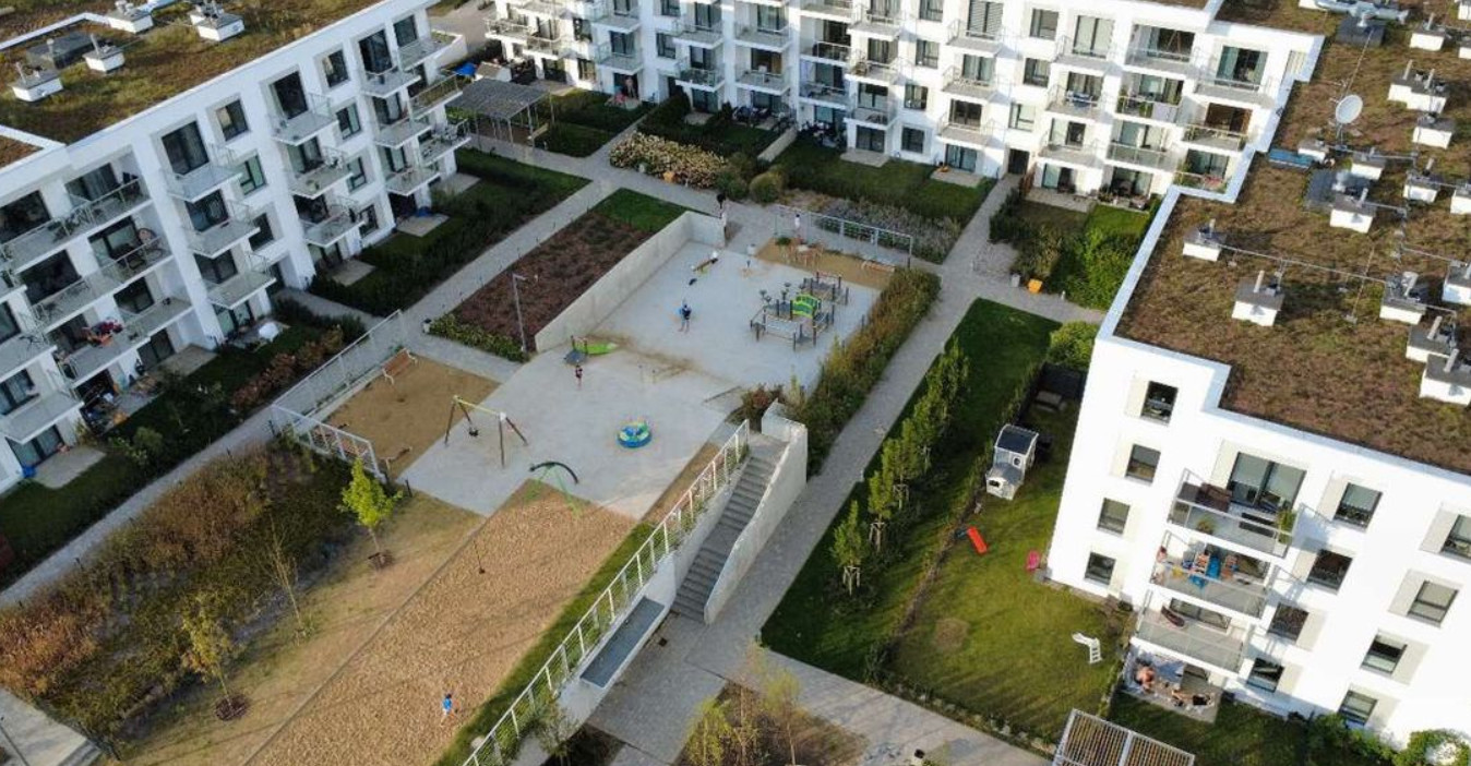 Wybudowany w 2022 w nowoczesnej stylistyce, niska zabudowa, otoczenie starannie zaprojektowane, zielone i zadbane, osiedlowy monitoring, wejście do klatki zabezpieczone domofonem