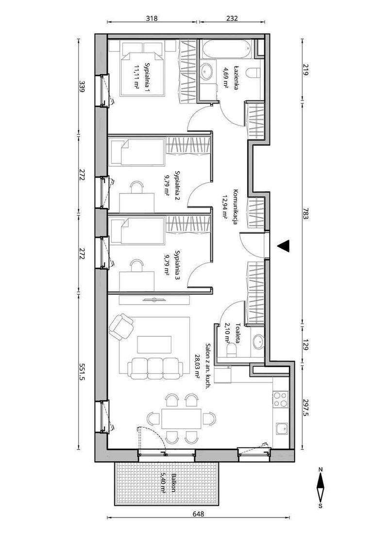 – Przestronny salon z aneksem kuchennym (28,03m²) – otwarta przestrzeń, doskonała do relaksu i spotkań z rodziną