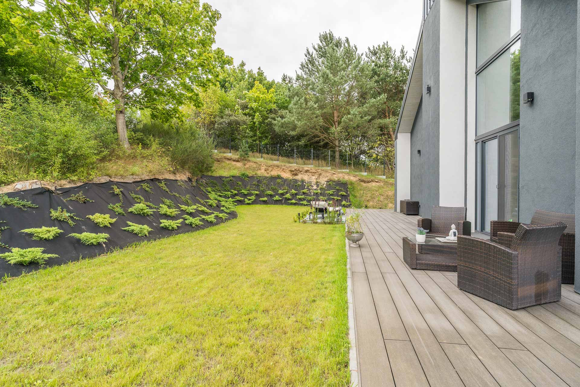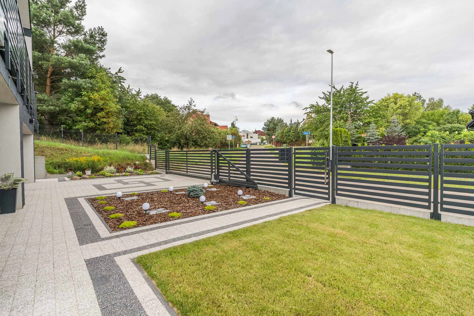 Prostokątna o powierzchni 750 m2 z dwóch stron osłonięta drzewami. Teren ogrodzony, brama wjazdowa sterowana na pilota.