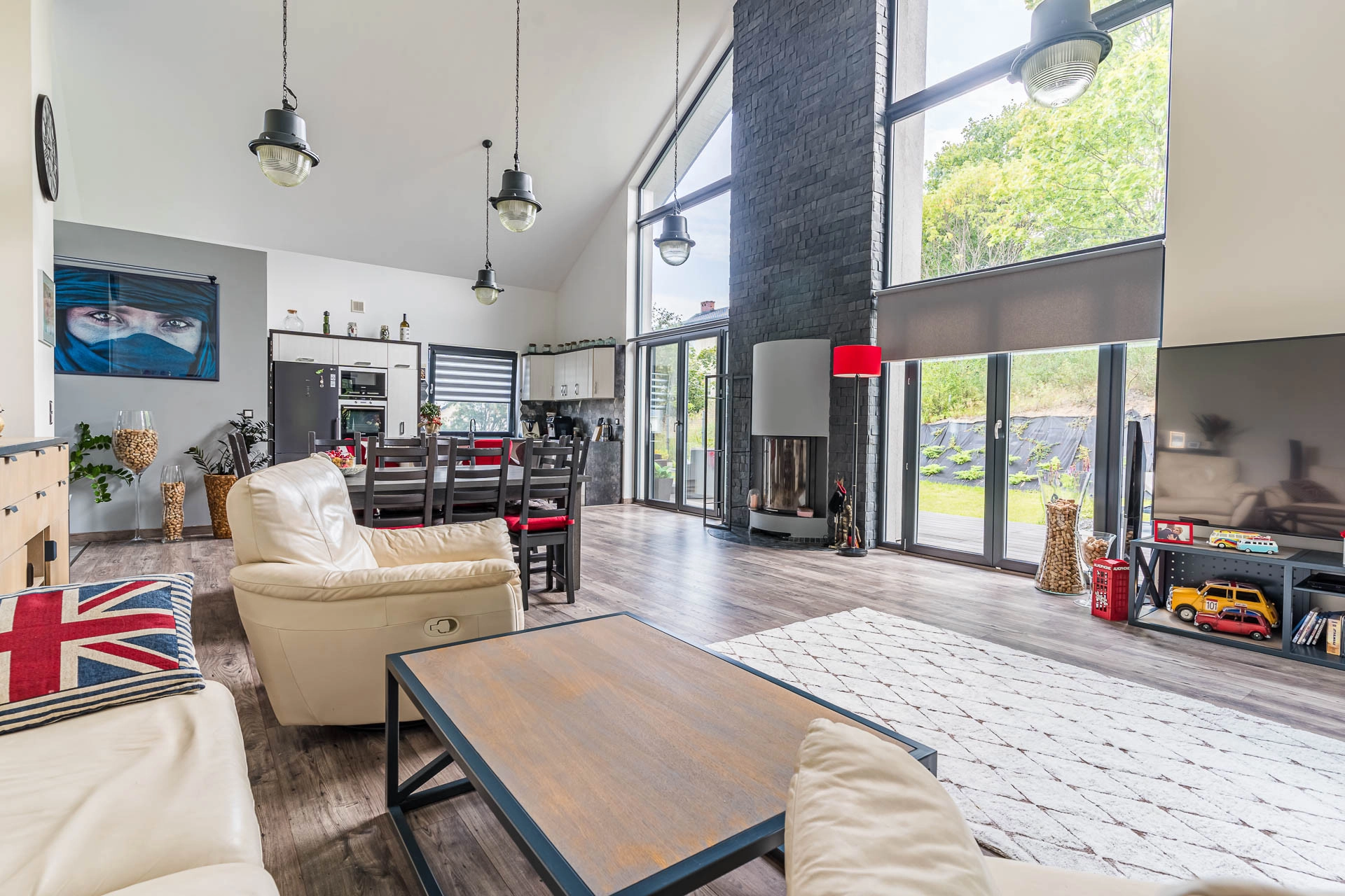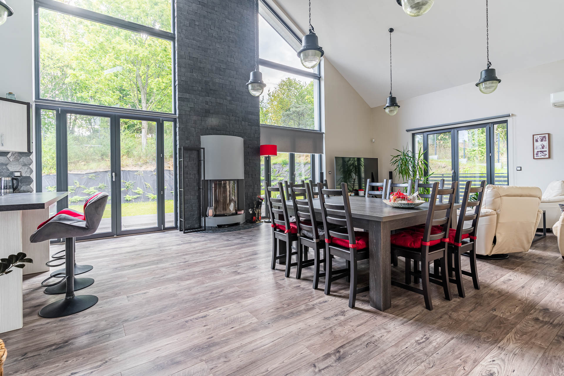– zjawiskowy salon z aneksem kuchennym, kominkiem, wyjściem na taras,