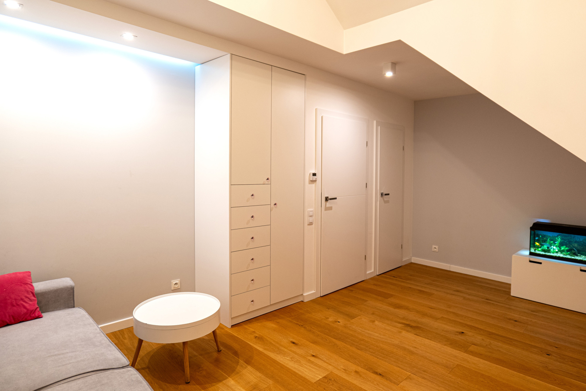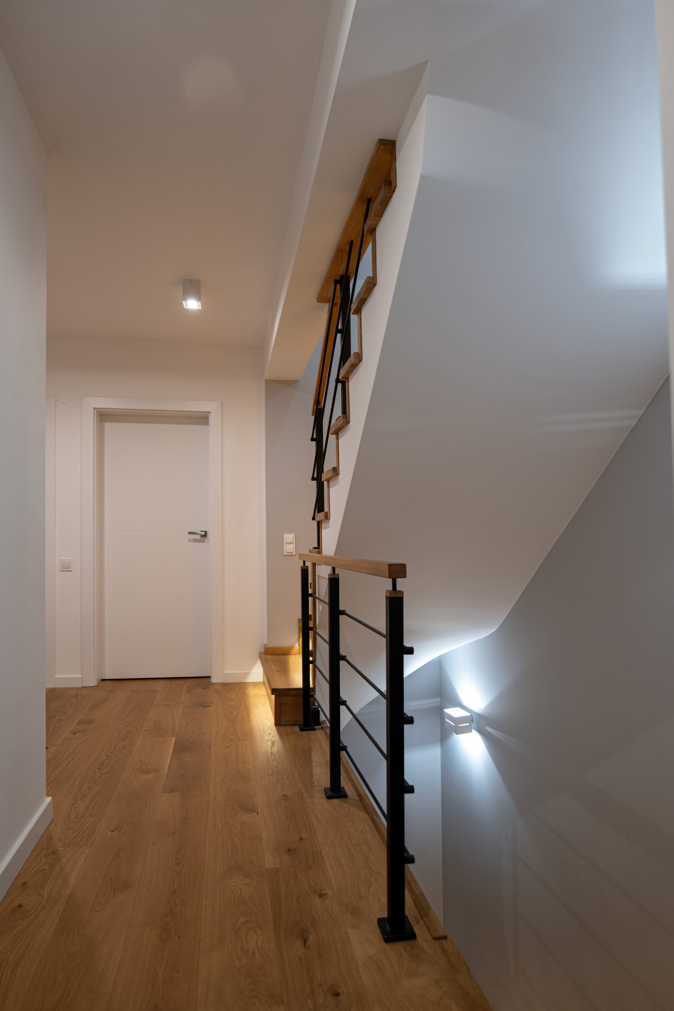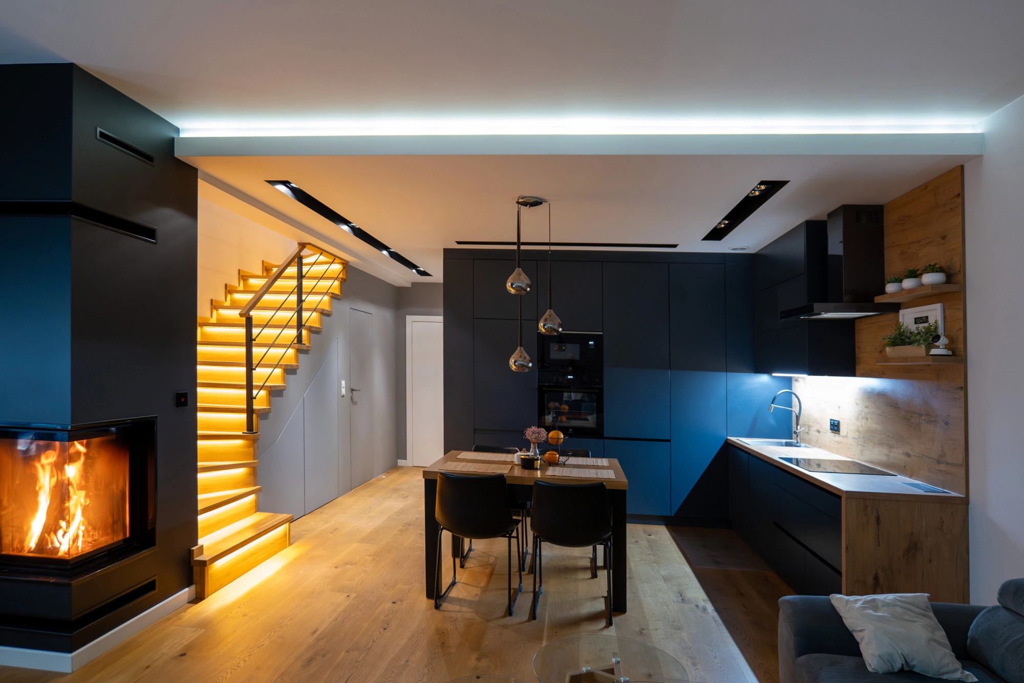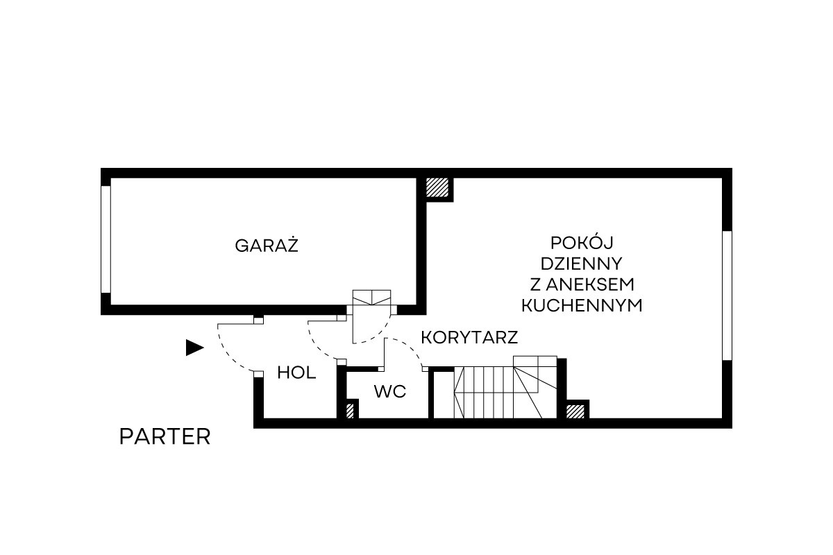 – Przestronny salon z aneksem kuchennym, kominkiem, zabudową pod schodami i wyjściem do ogrodu;